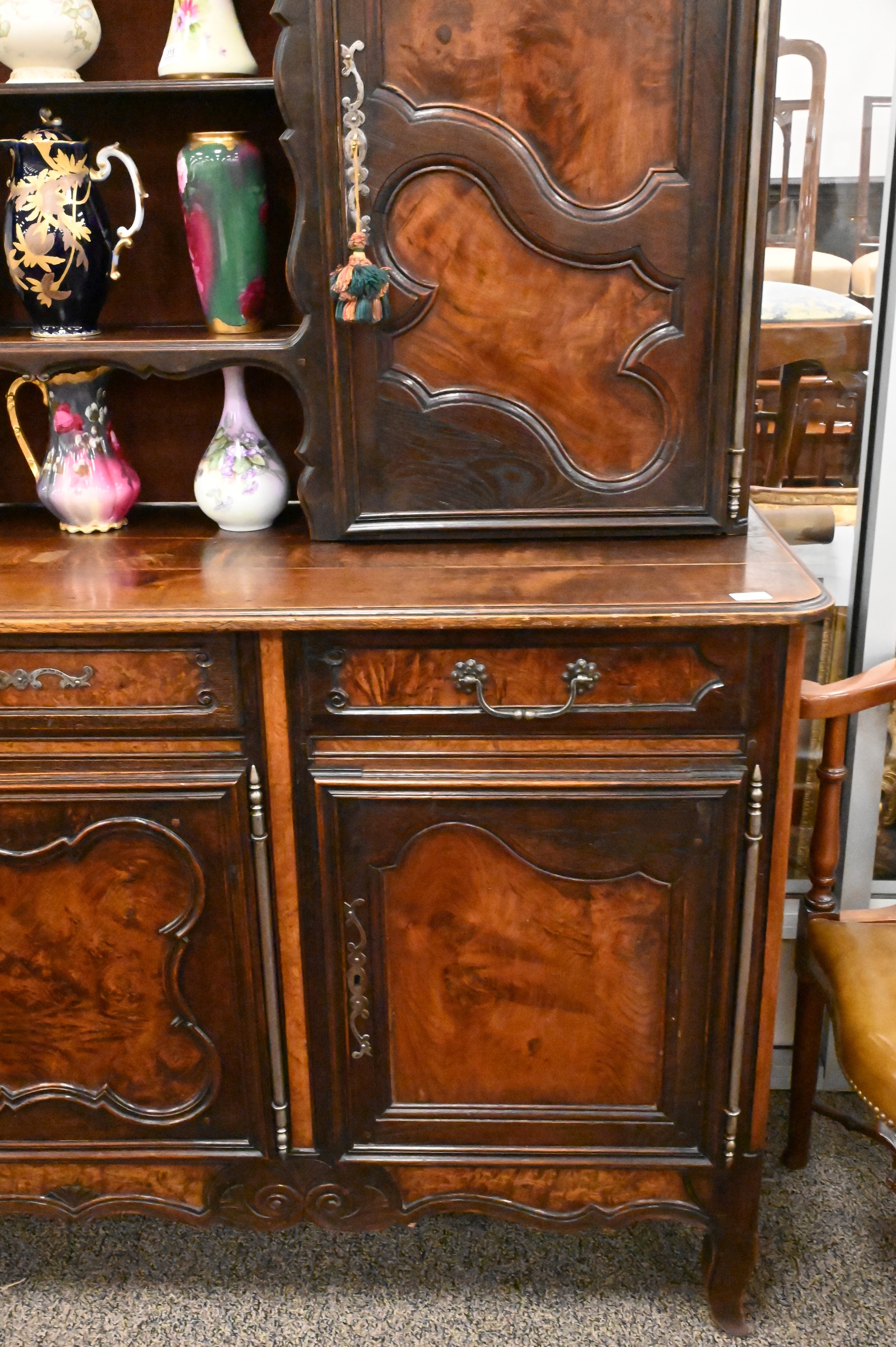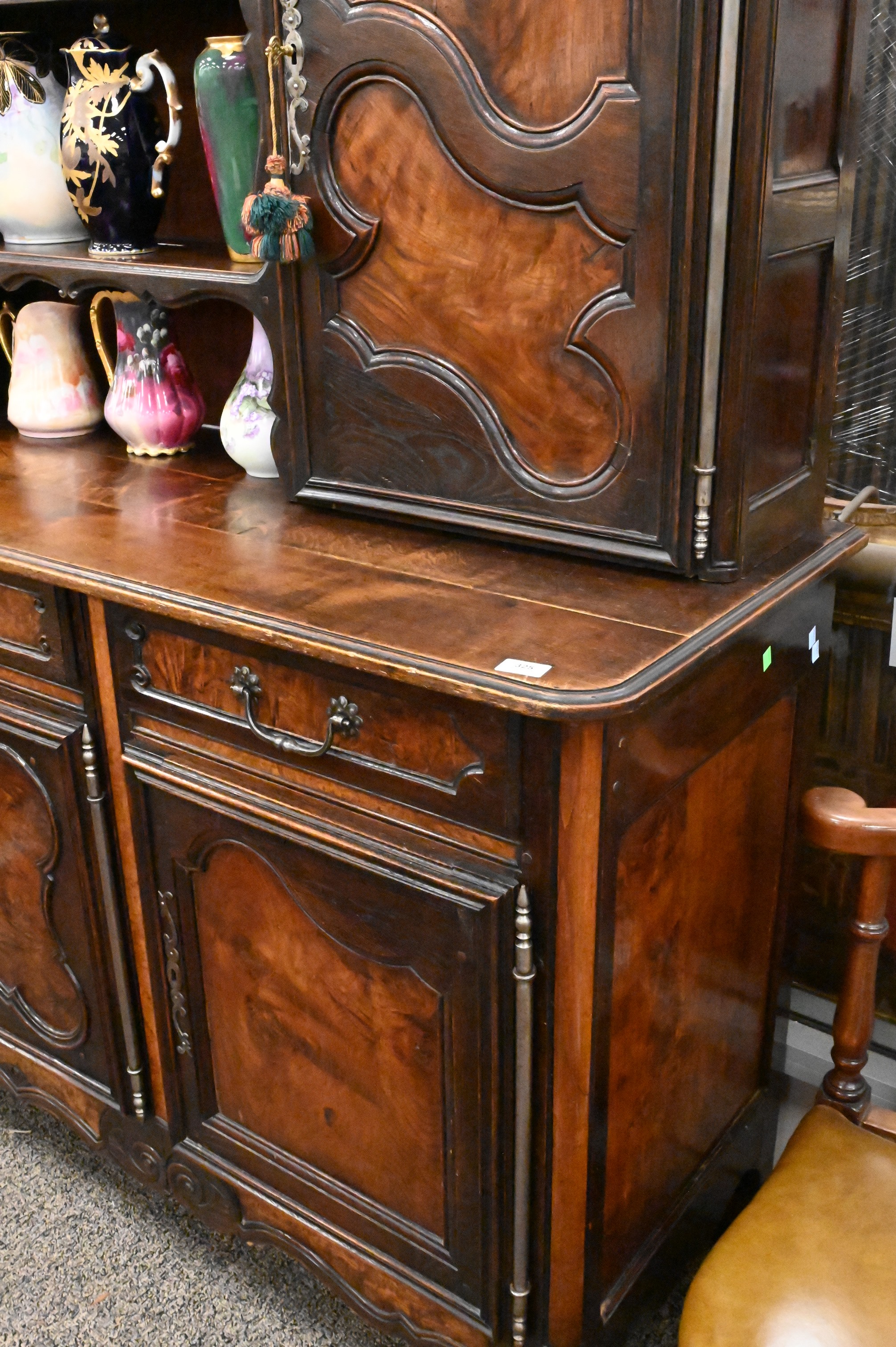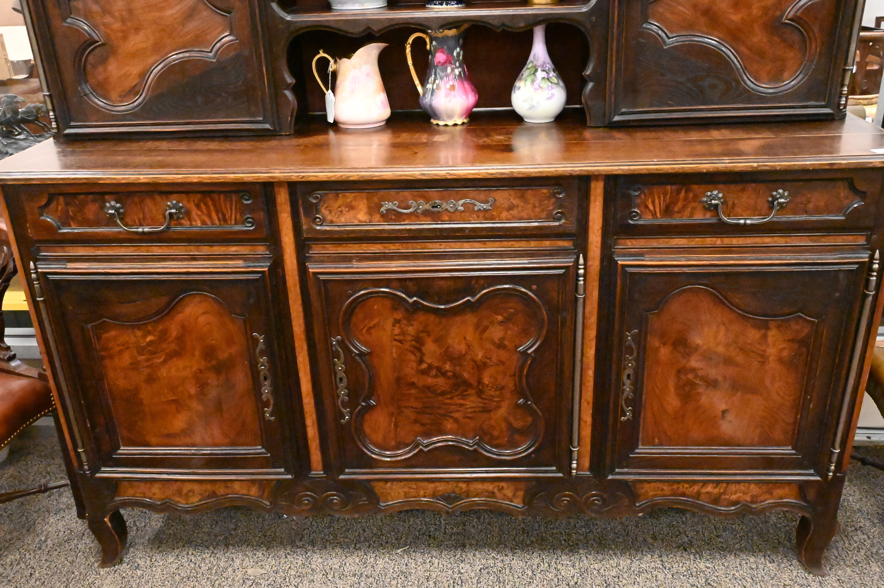 Louis XV Hutch, in two parts with doors and drawers, oak and burlwood, partially restored and made up, height 88 inches, width 69 inches, depth 21 inches.