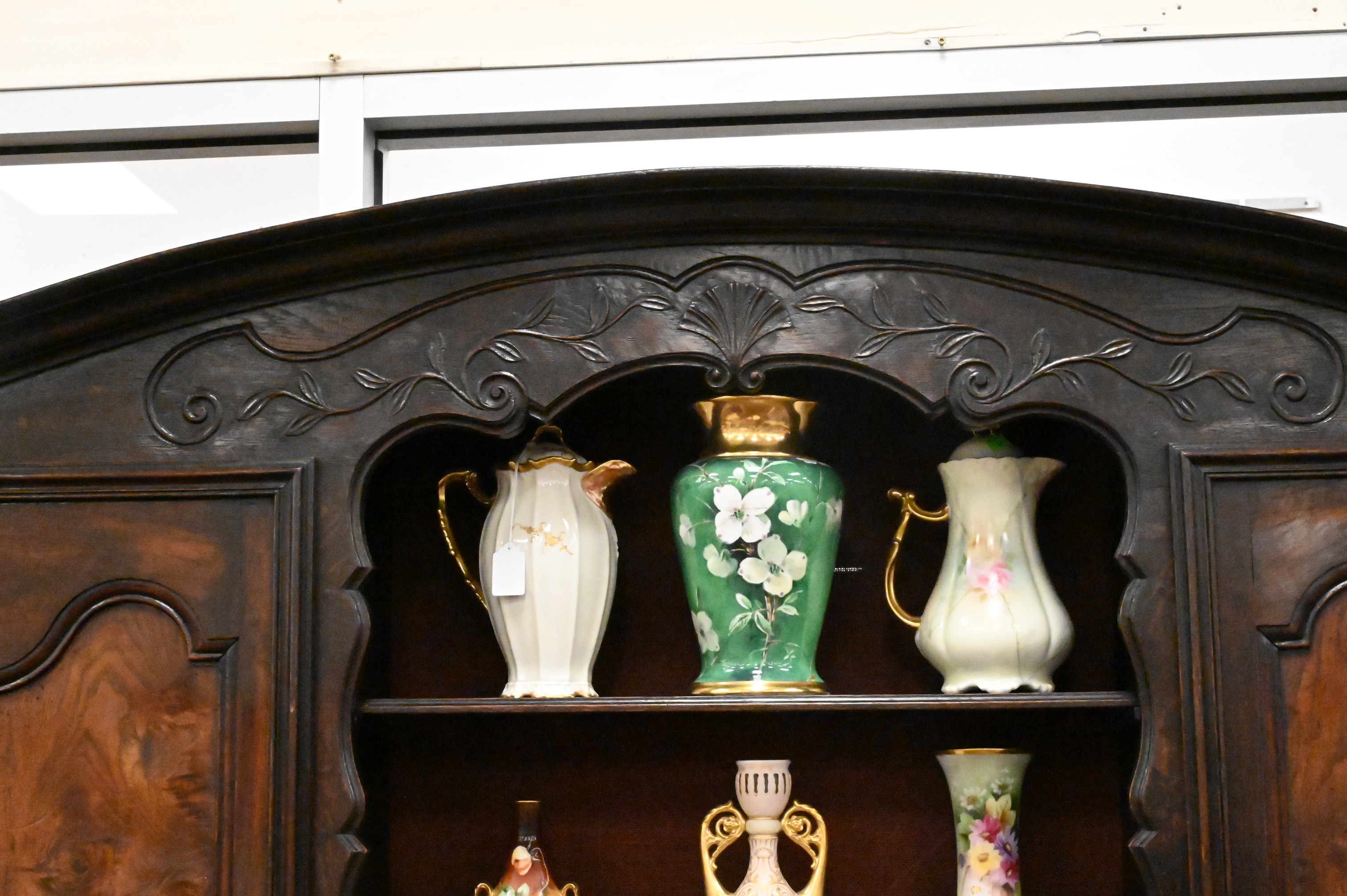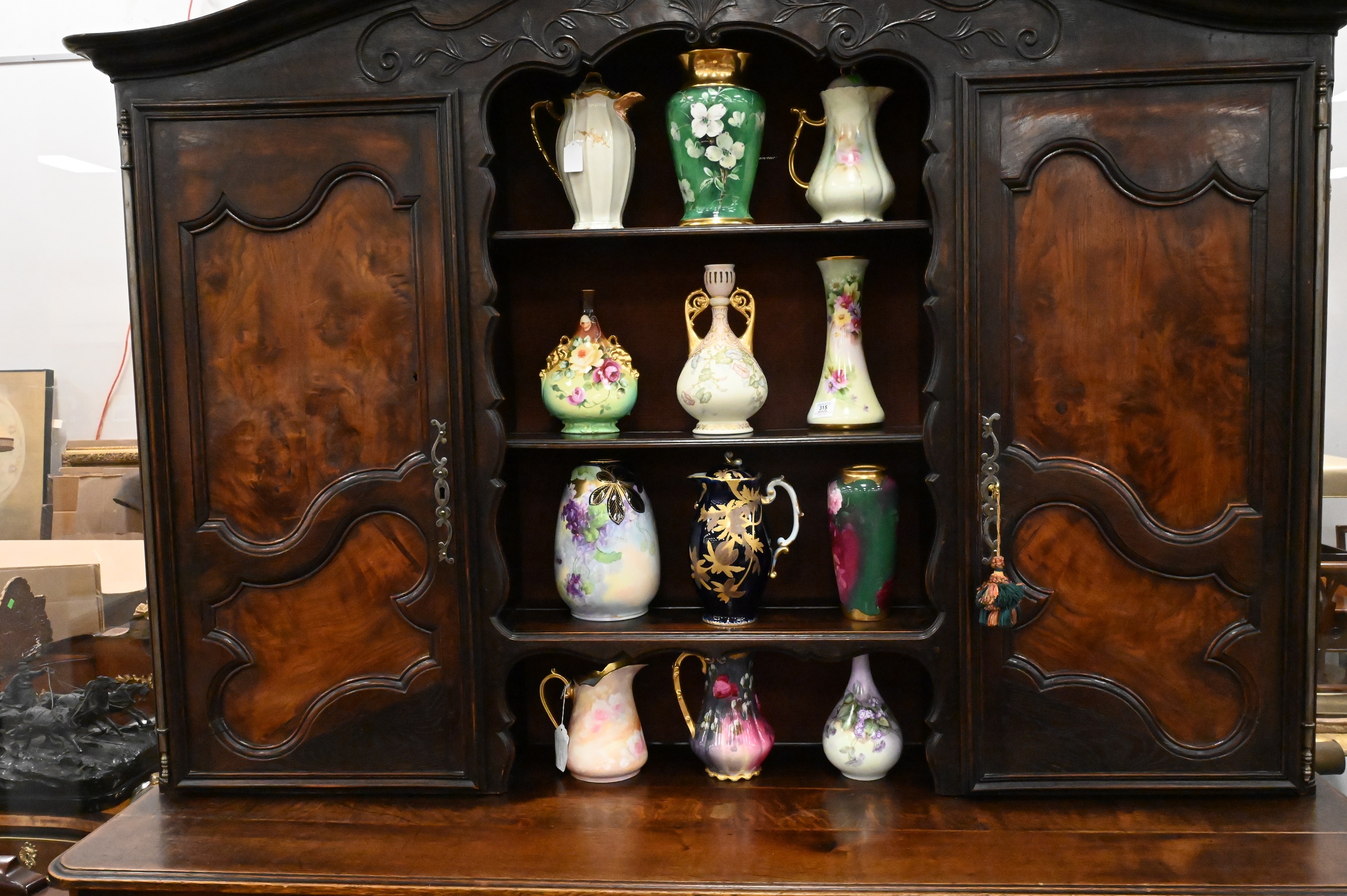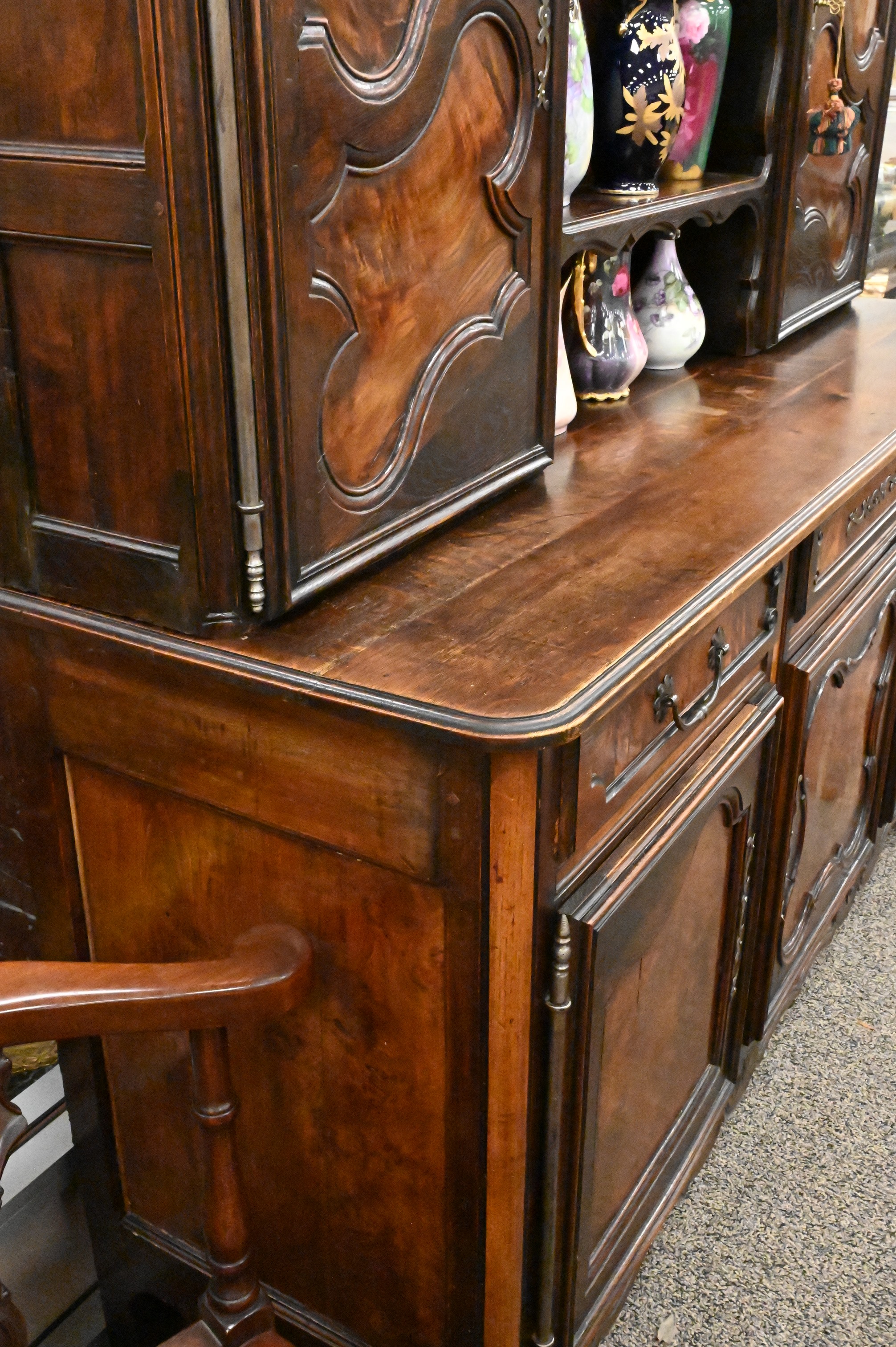 Louis XV Hutch, in two parts with doors and drawers, oak and burlwood, partially restored and made up, height 88 inches, width 69 inches, depth 21 inches.