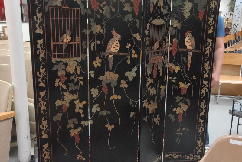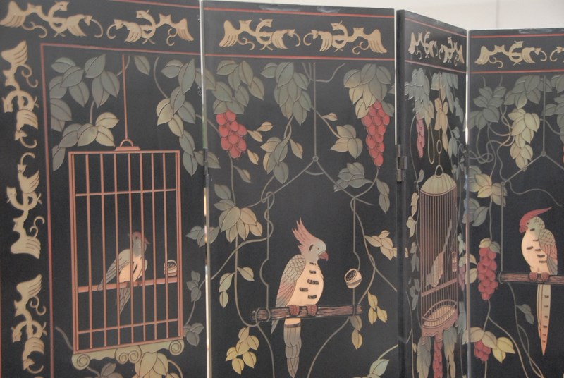 Oriental four fold screen, each panel ht. 72in. wd. 16in.
