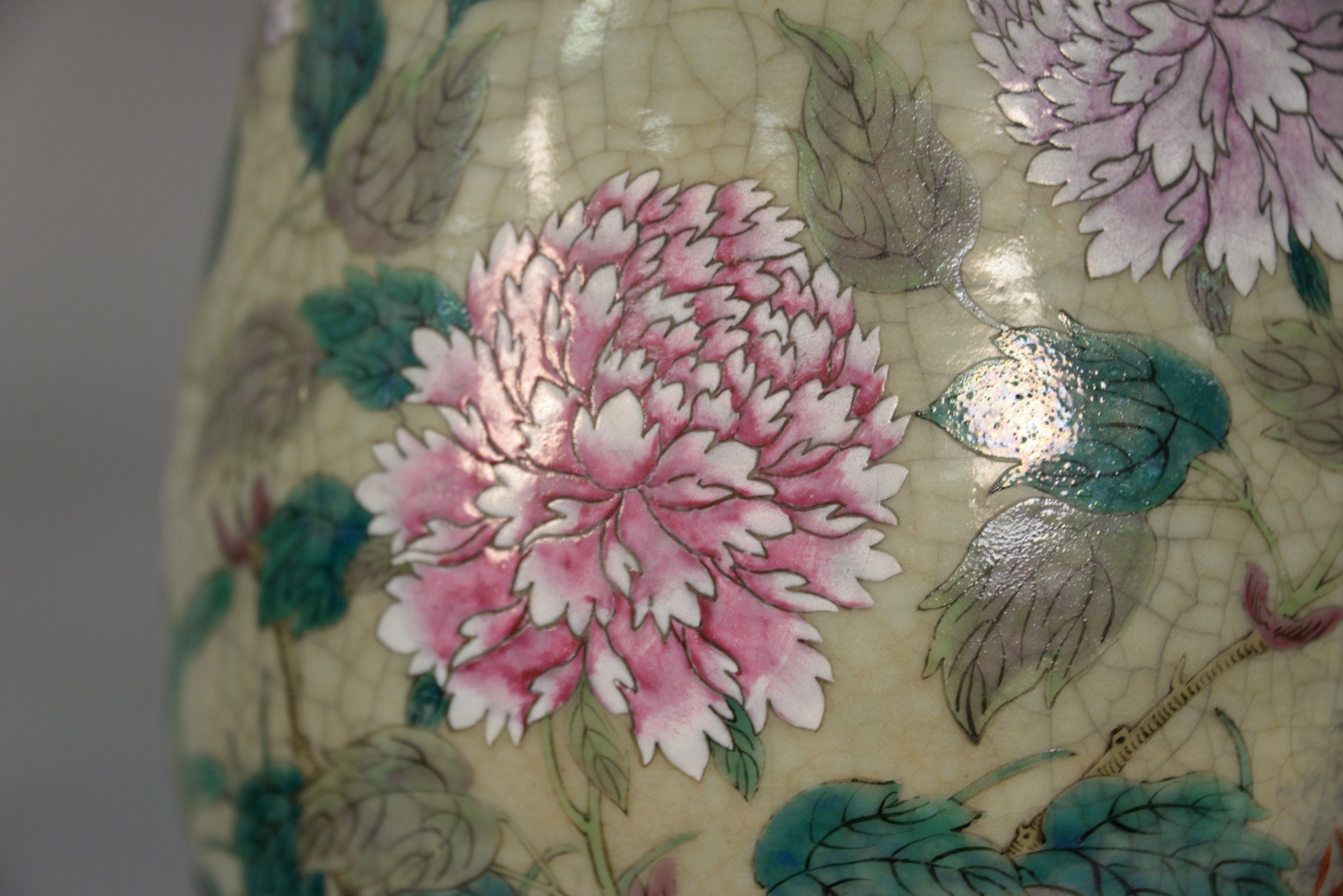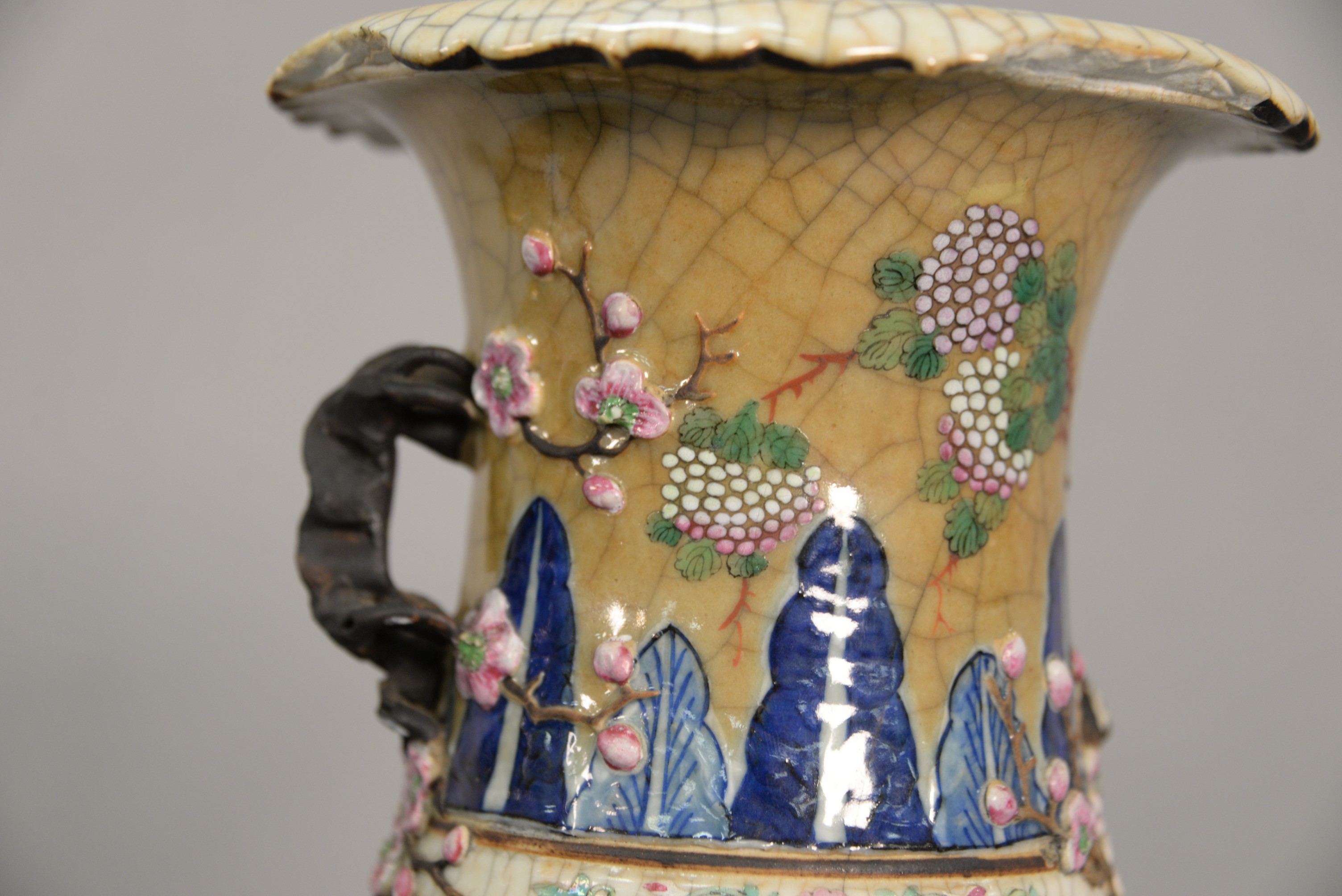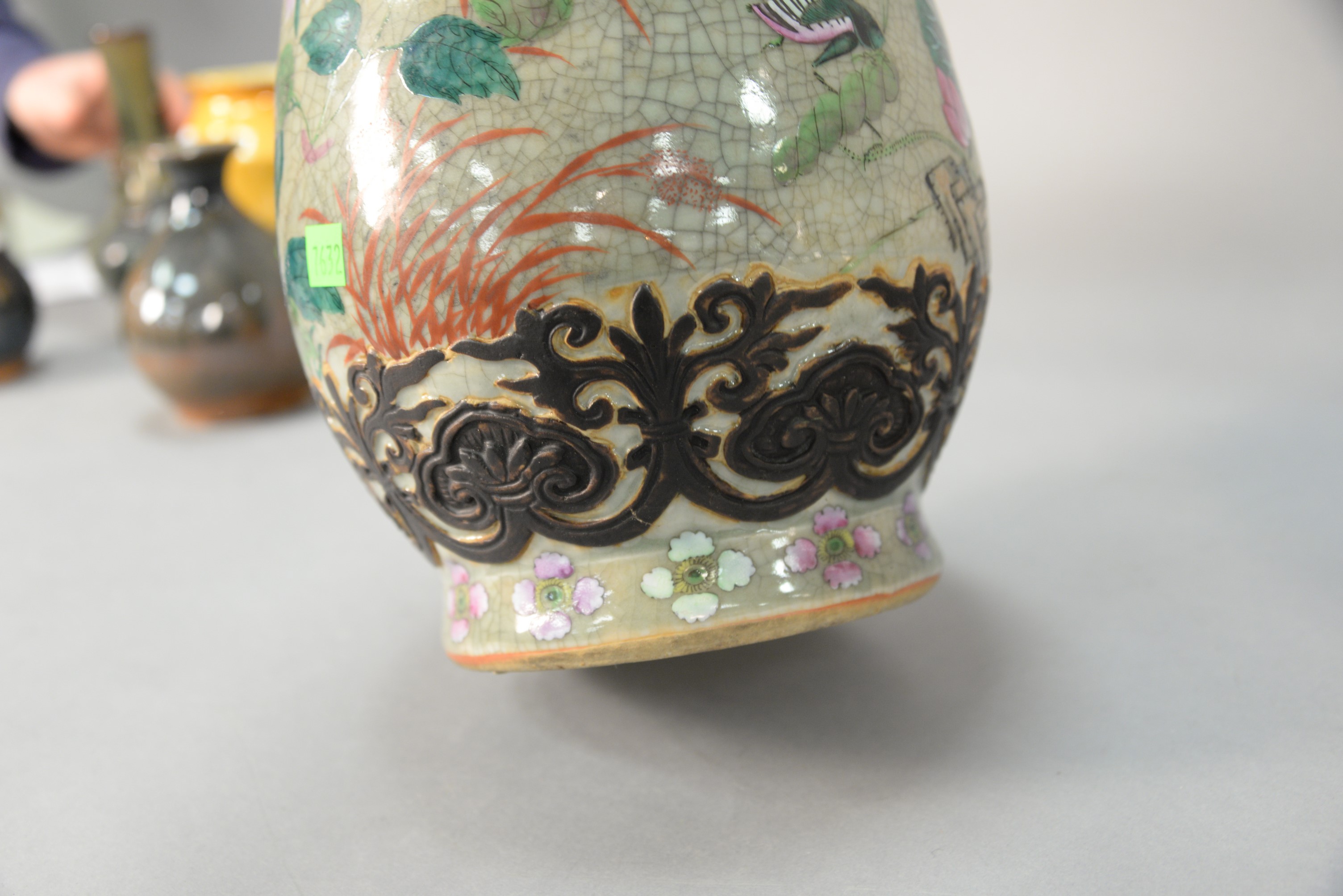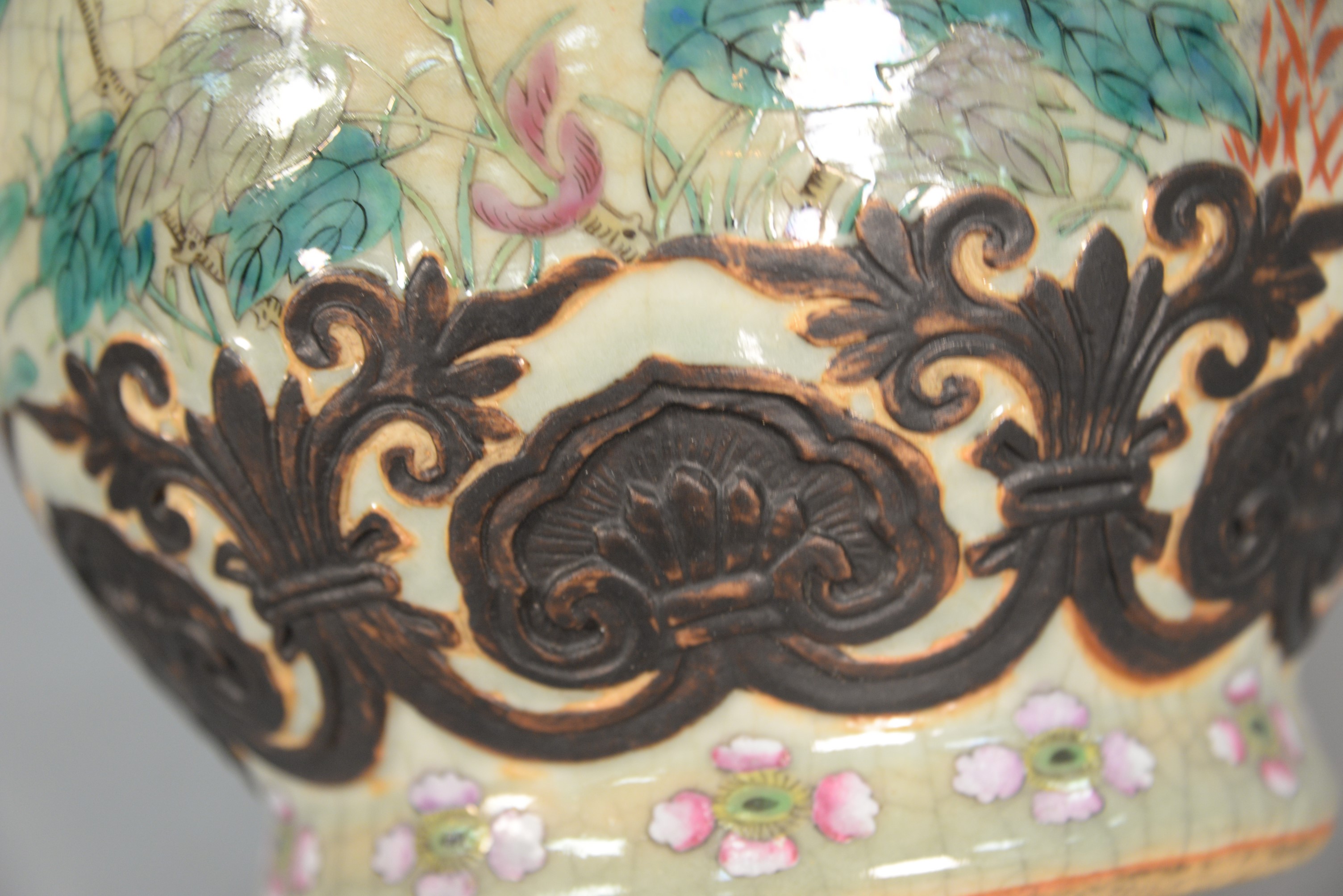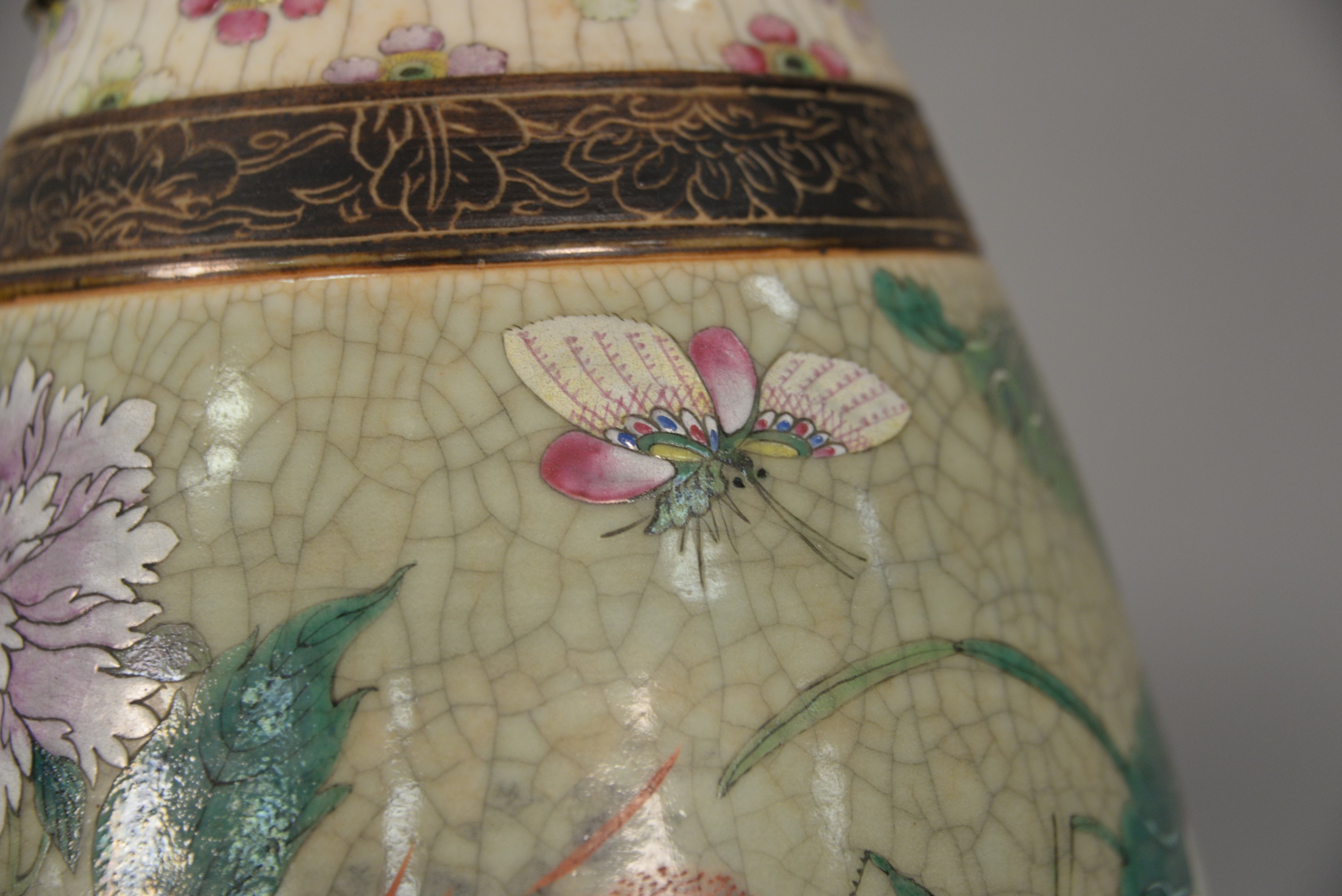 Lot 325: Pair of crackle glaze urn form vases with enameled butterflies, grasshoppers, and blossoming lotus, having molded branch form handle…