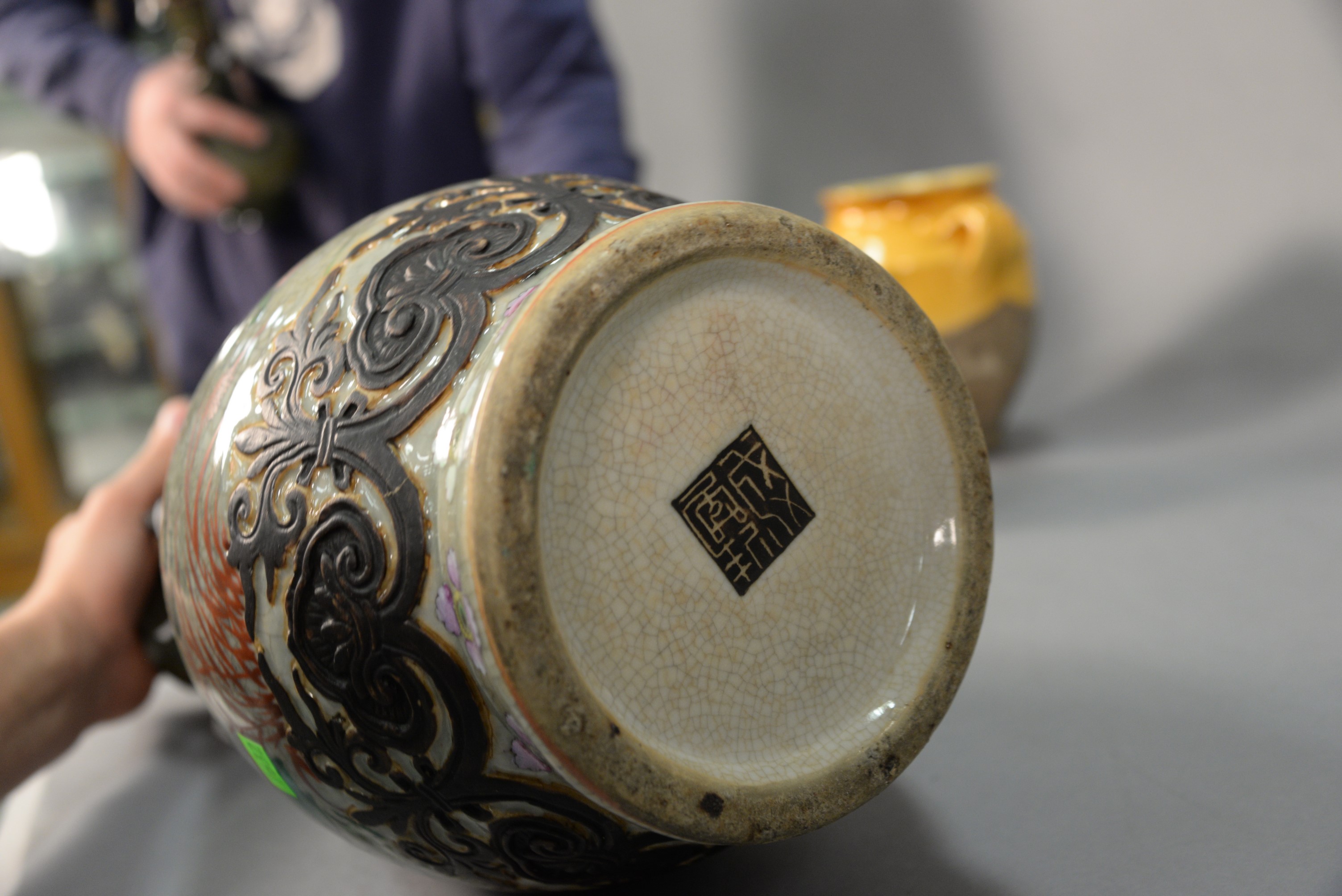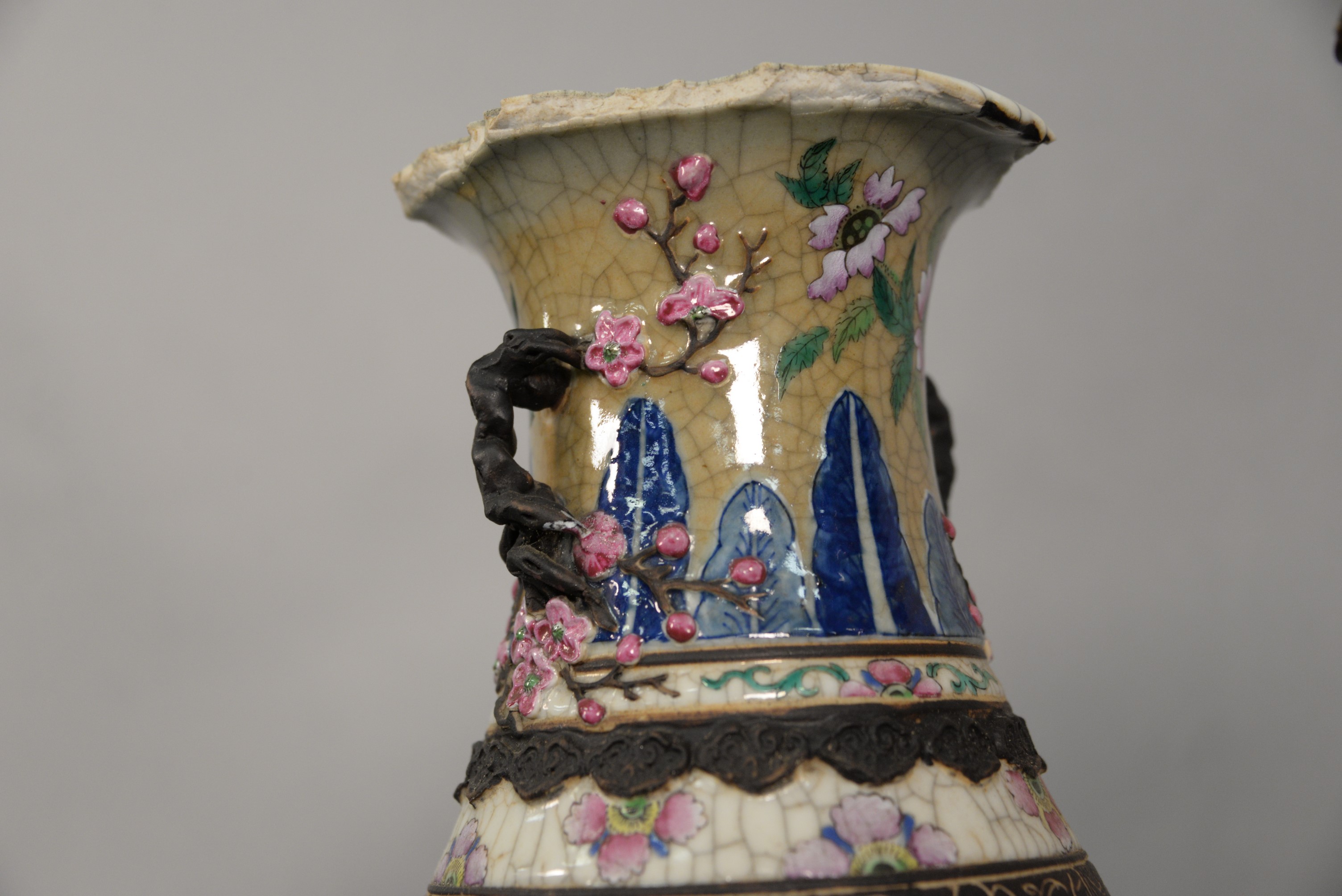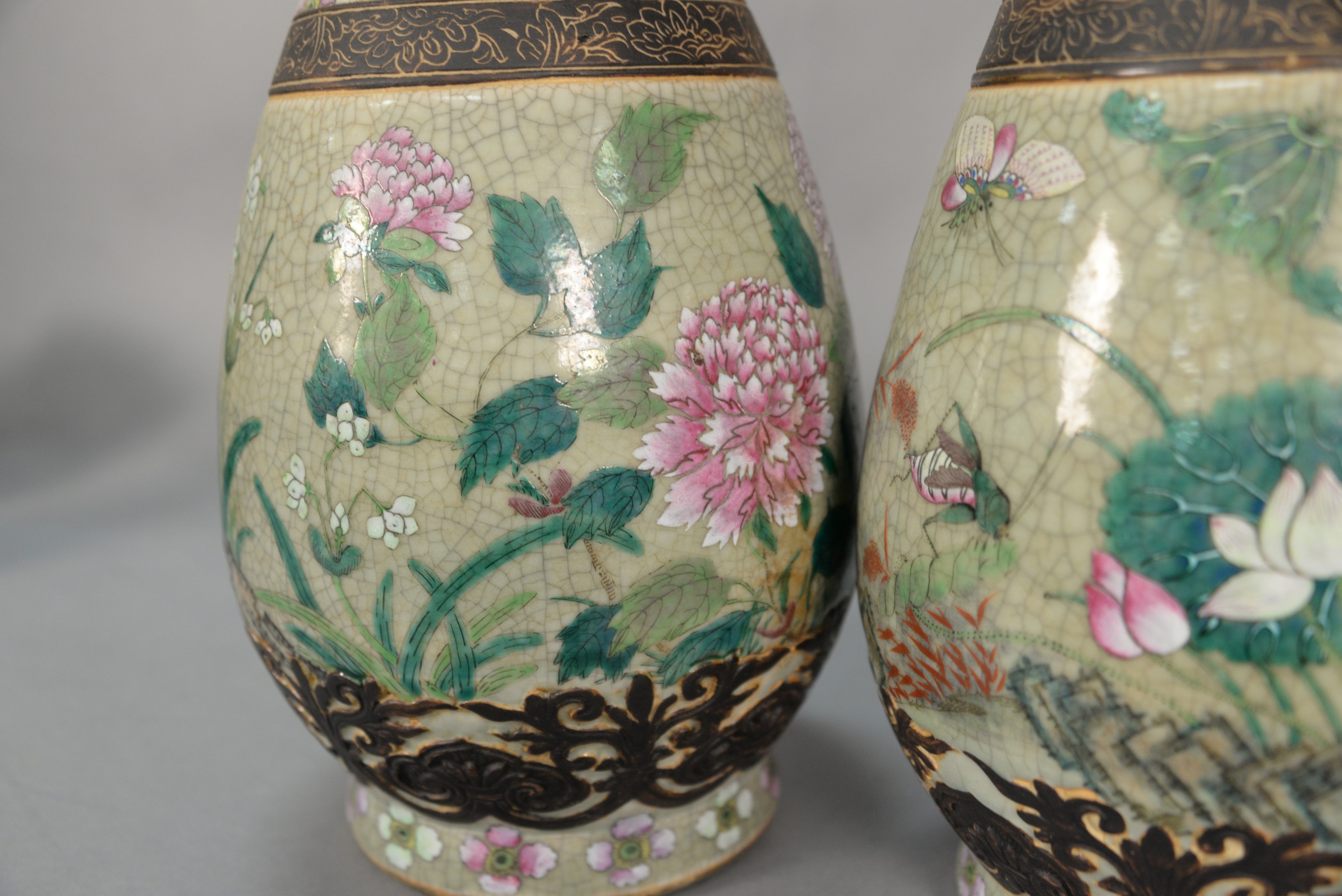 Pair of crackle glaze urn form vases with enameled butterflies, grasshoppers, and blossoming lotus, having molded branch form handles, impressed seal mark on bottom. both as is. ht. 17 3/4 in.