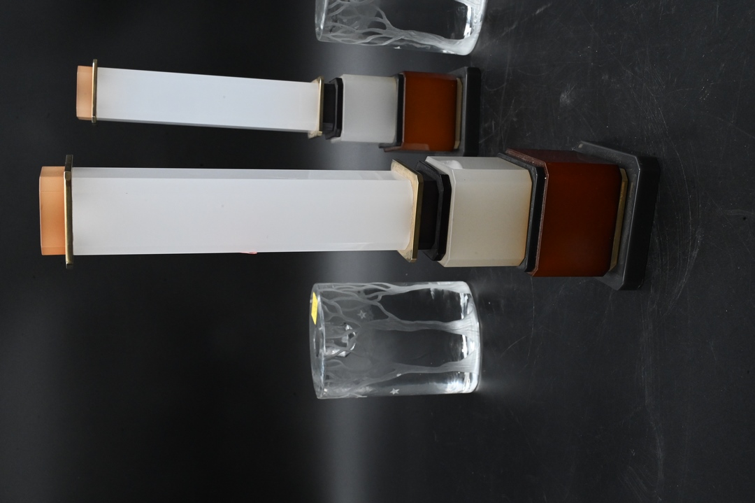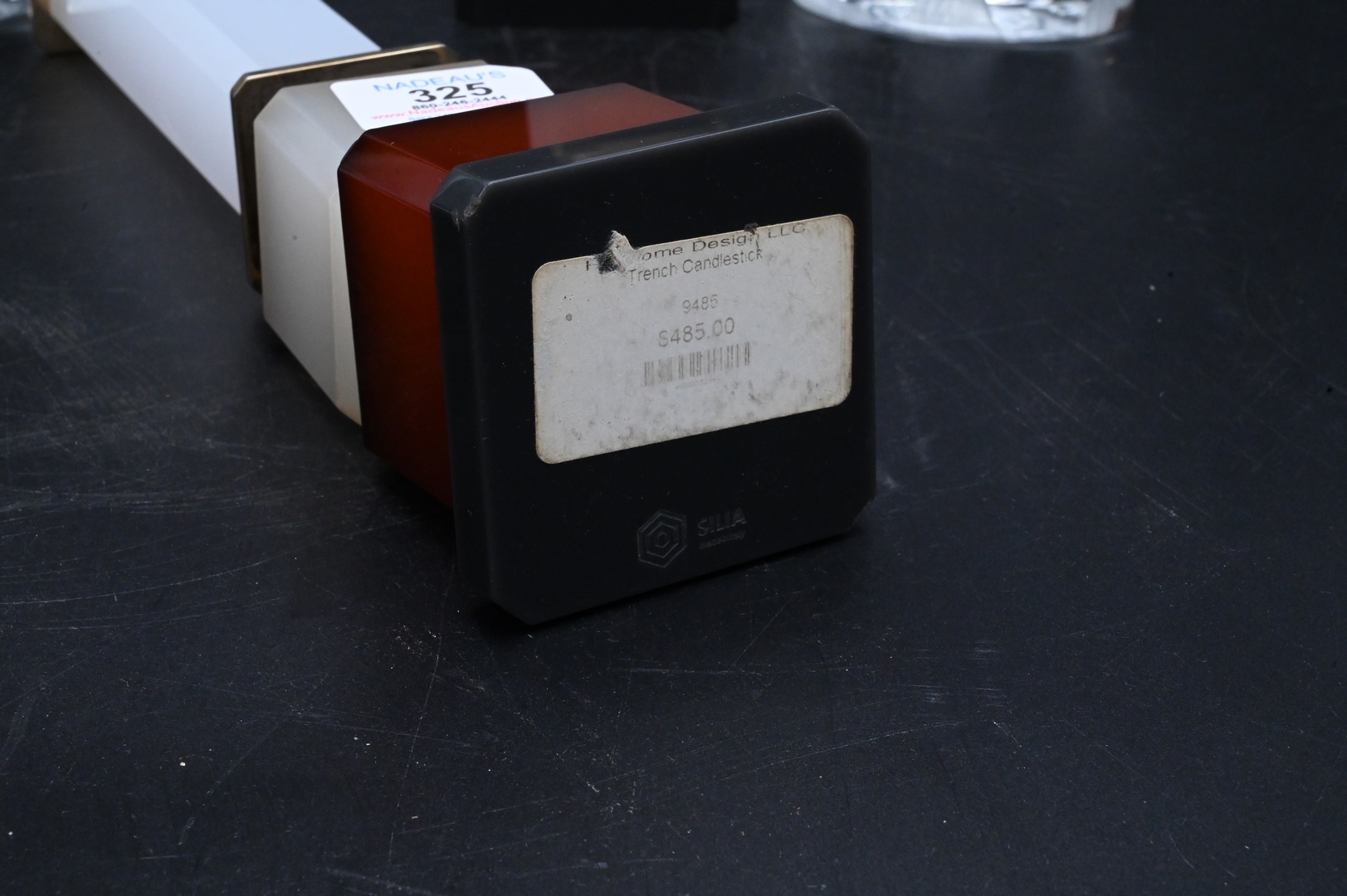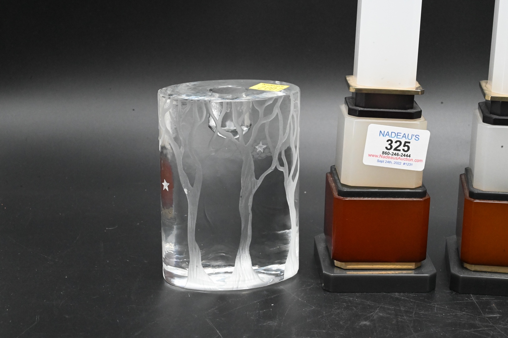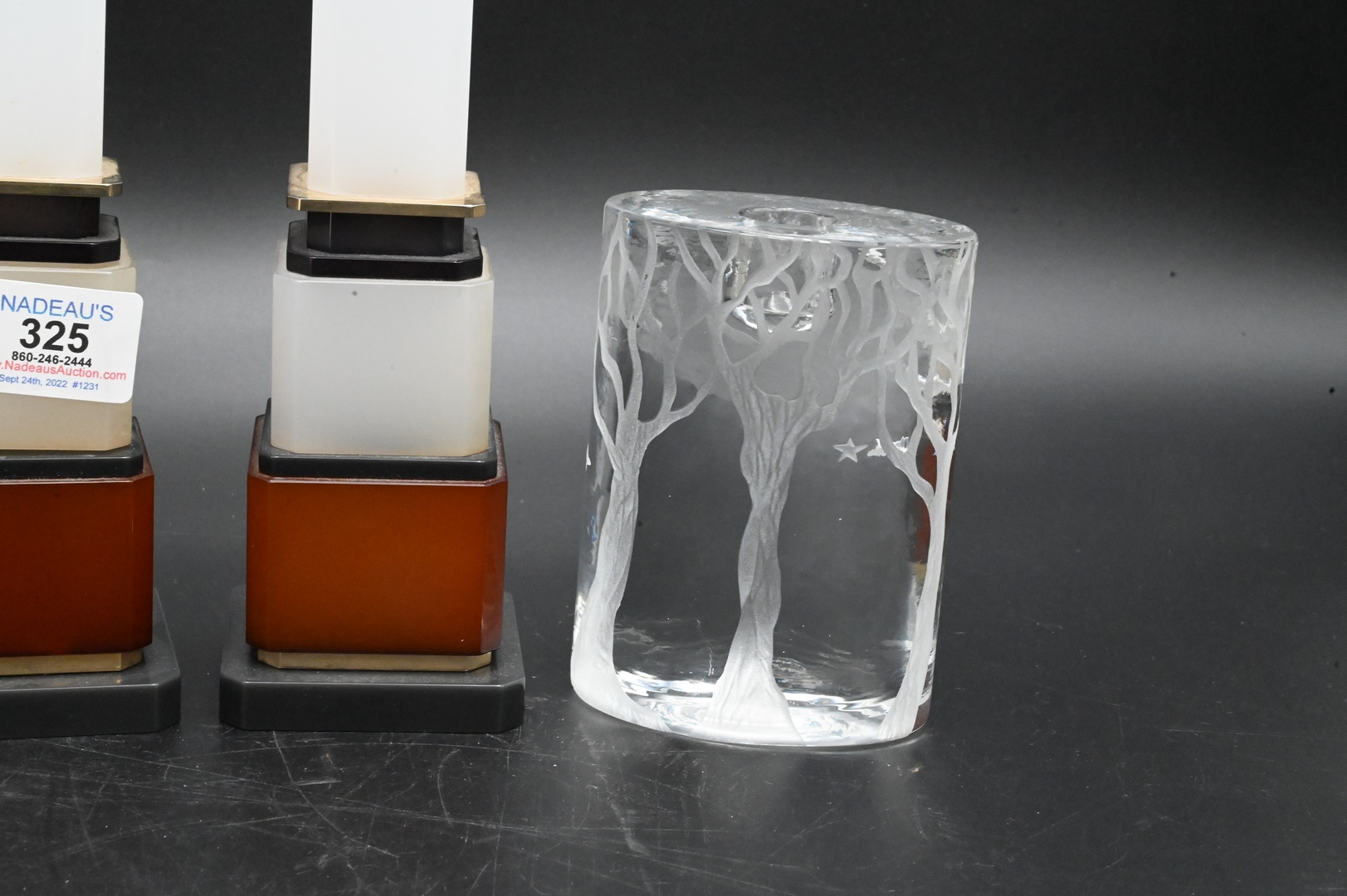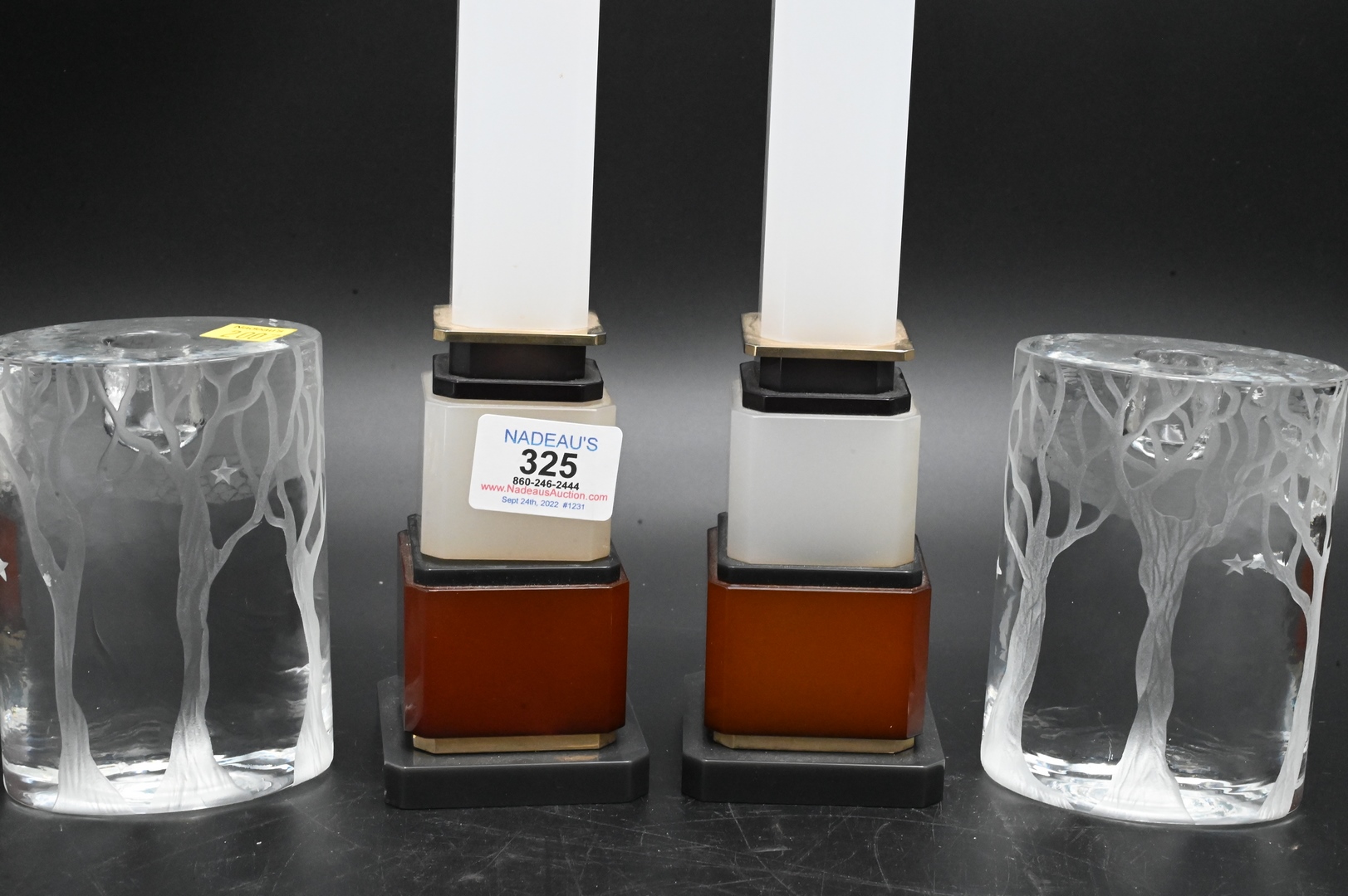 Pair of Silia, Italy Lucite Candlesticks, original price $970; along with a pair of Polly Gessell etched glass candlesticks depicting trees and moon, height 17 1/2 inches.