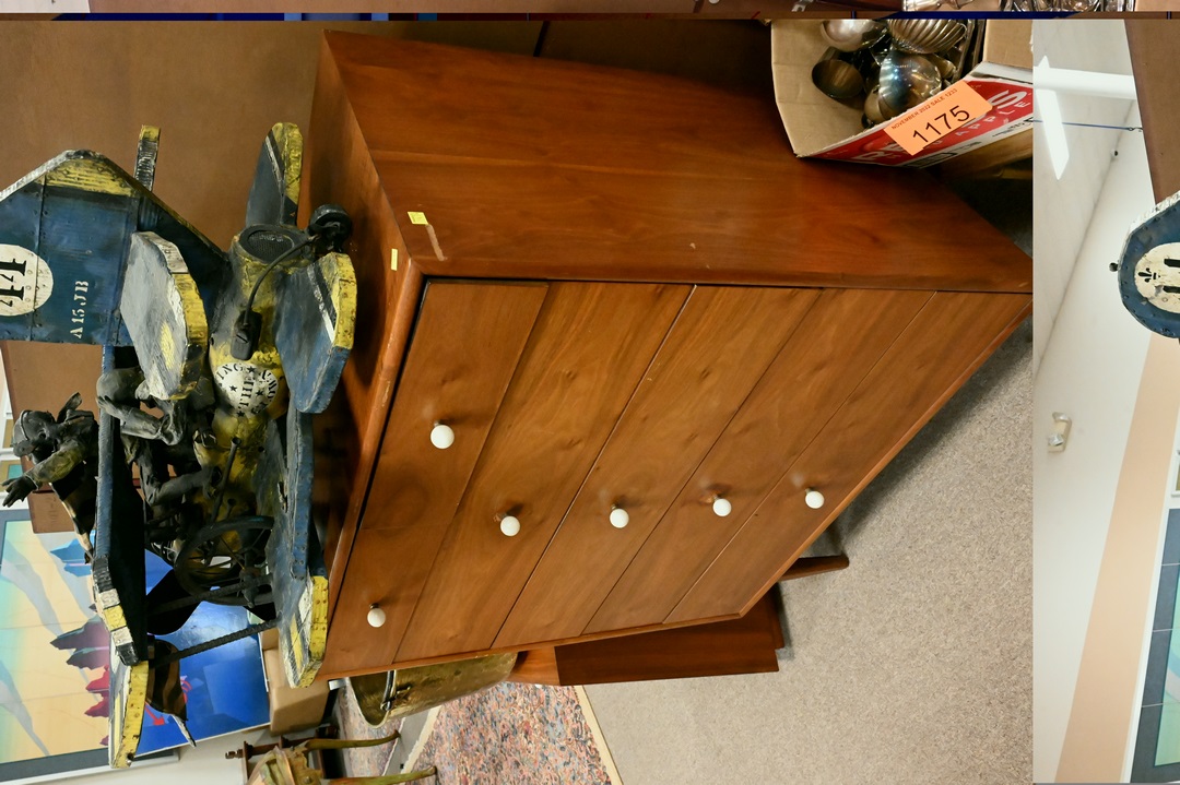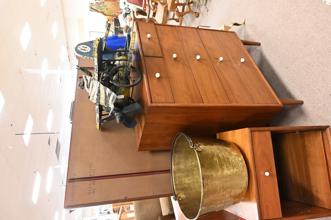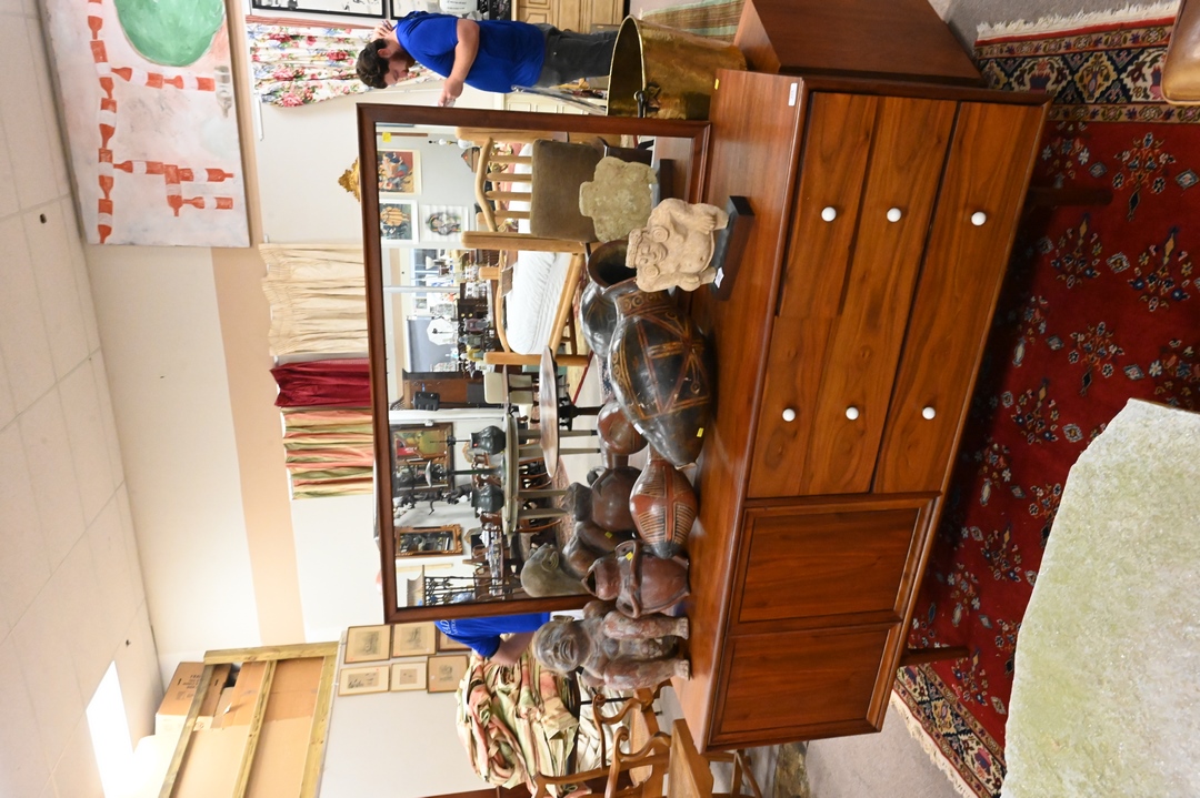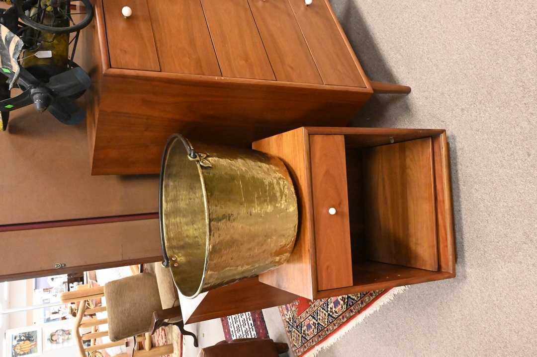 Three Piece Mid Century Bedroom Set, to include tall dresser, long dresser with mirror, along with one night stand, mirrored piece height 64 inches, width 60 inches.