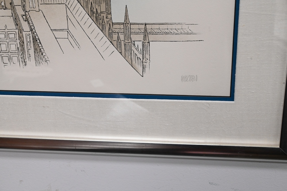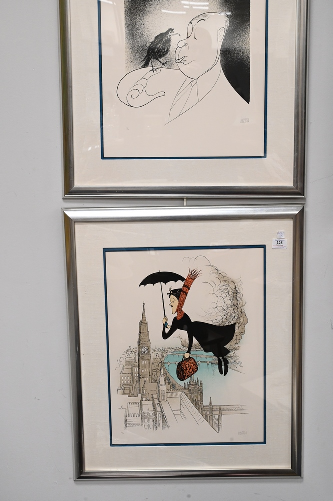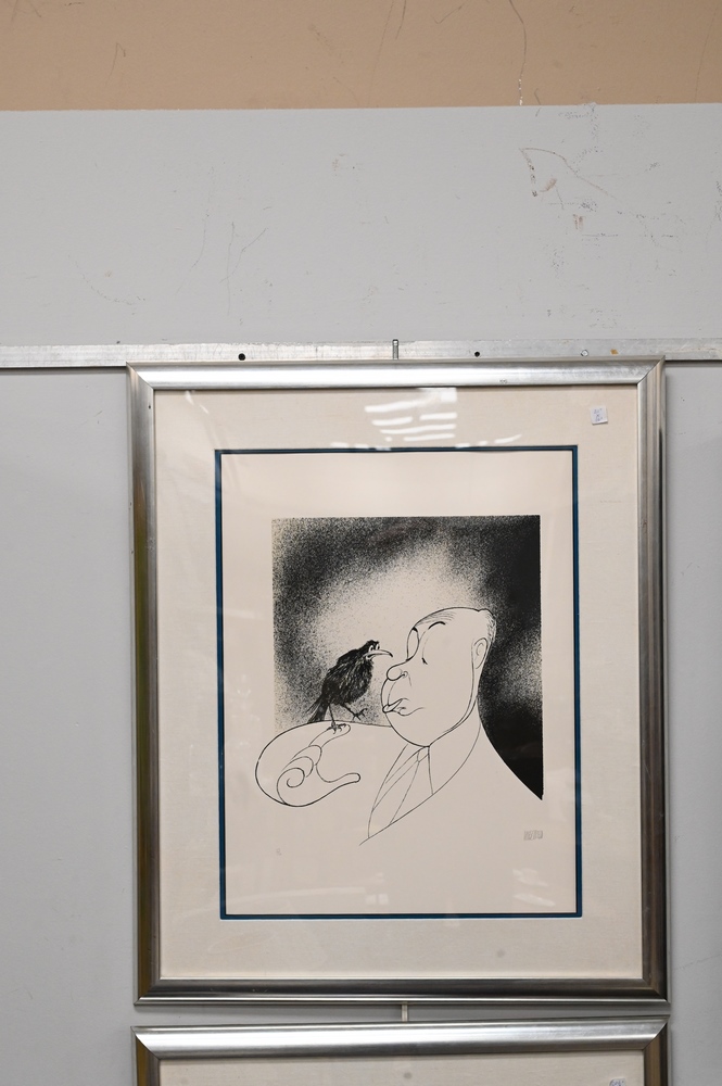 Lot 325: Two Al Hirschfeld Lithographs, to include Mary Poppins flying over London, pencil signed and numbered 53/150, along with Alfred Hitchcock directing the bird, pencil signed and numbered 117/170, 21″ x 16″.