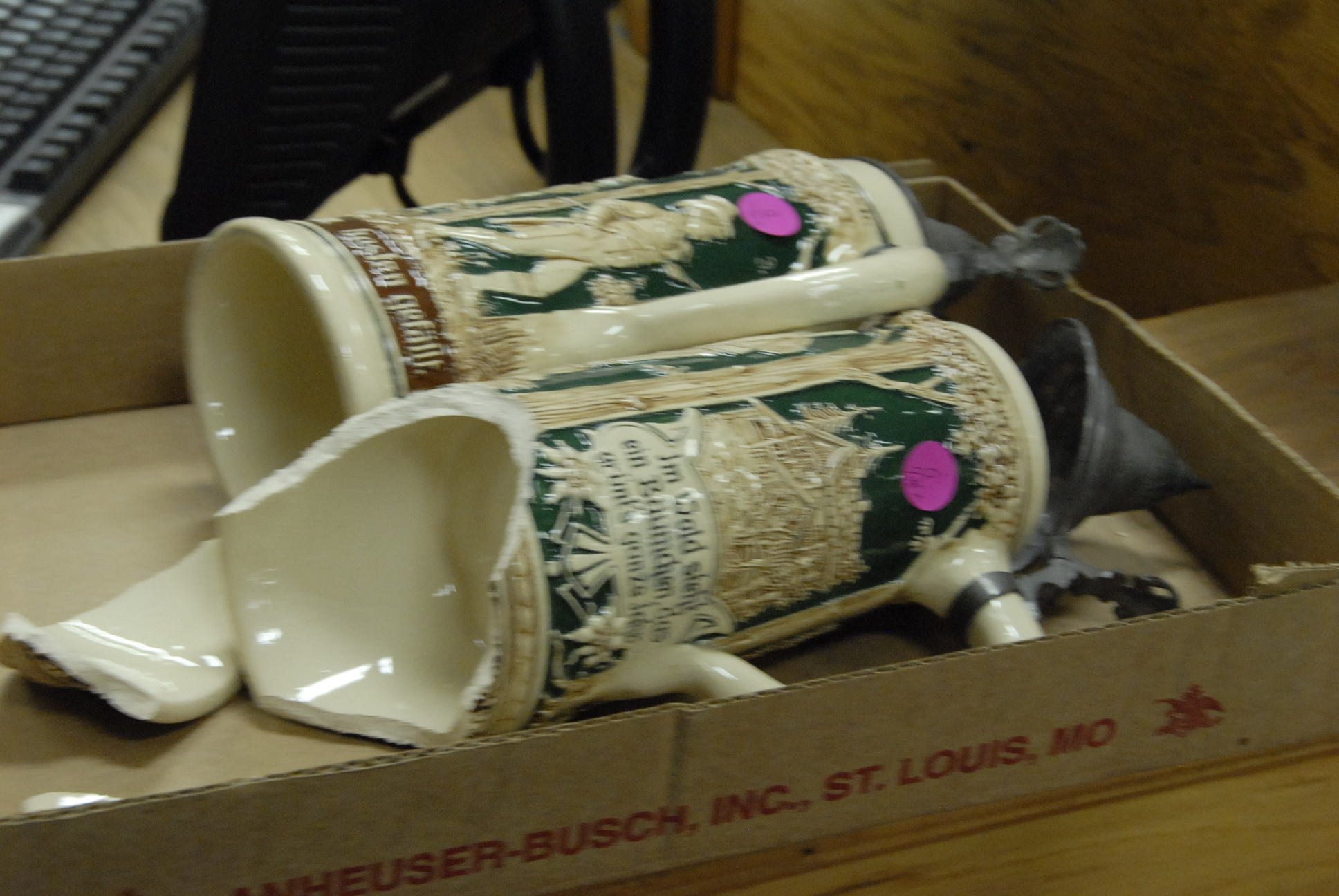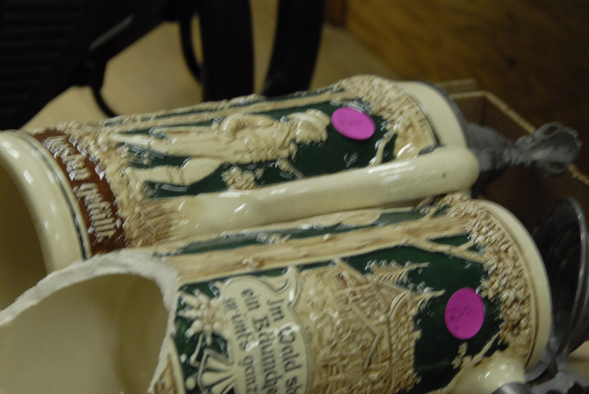 Two box lots with steins and a ceramic shoe, one of the steins as is