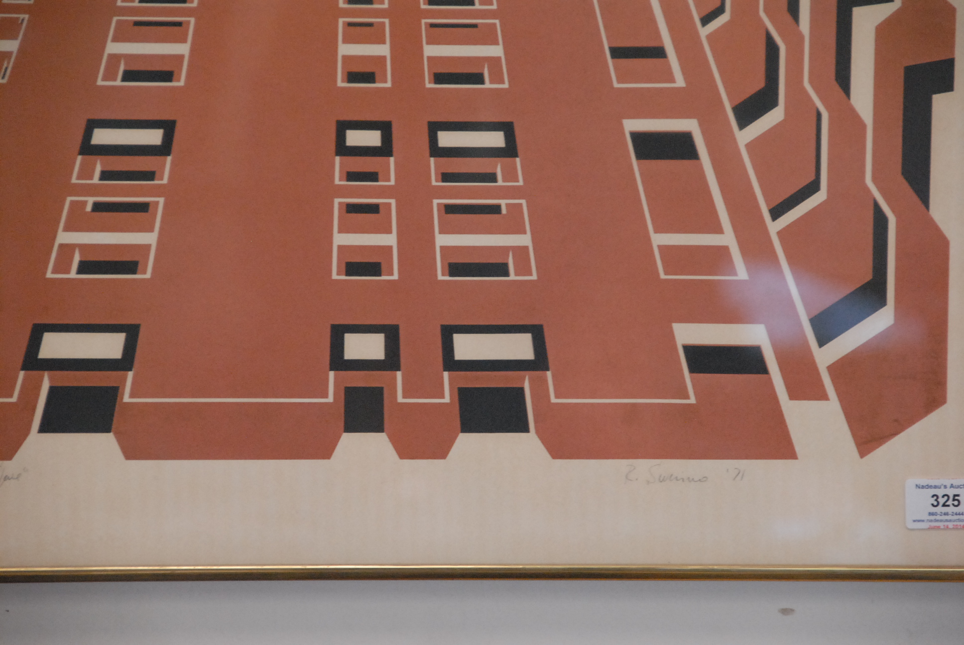 Two framed pieces to include Jess Reichek 1916 Studies from Kabbalah Series mixed media on paper unsigned having Sotheby’s label on reverse 33 x 31 and a geometric design print numbered and signed 30 x 22.