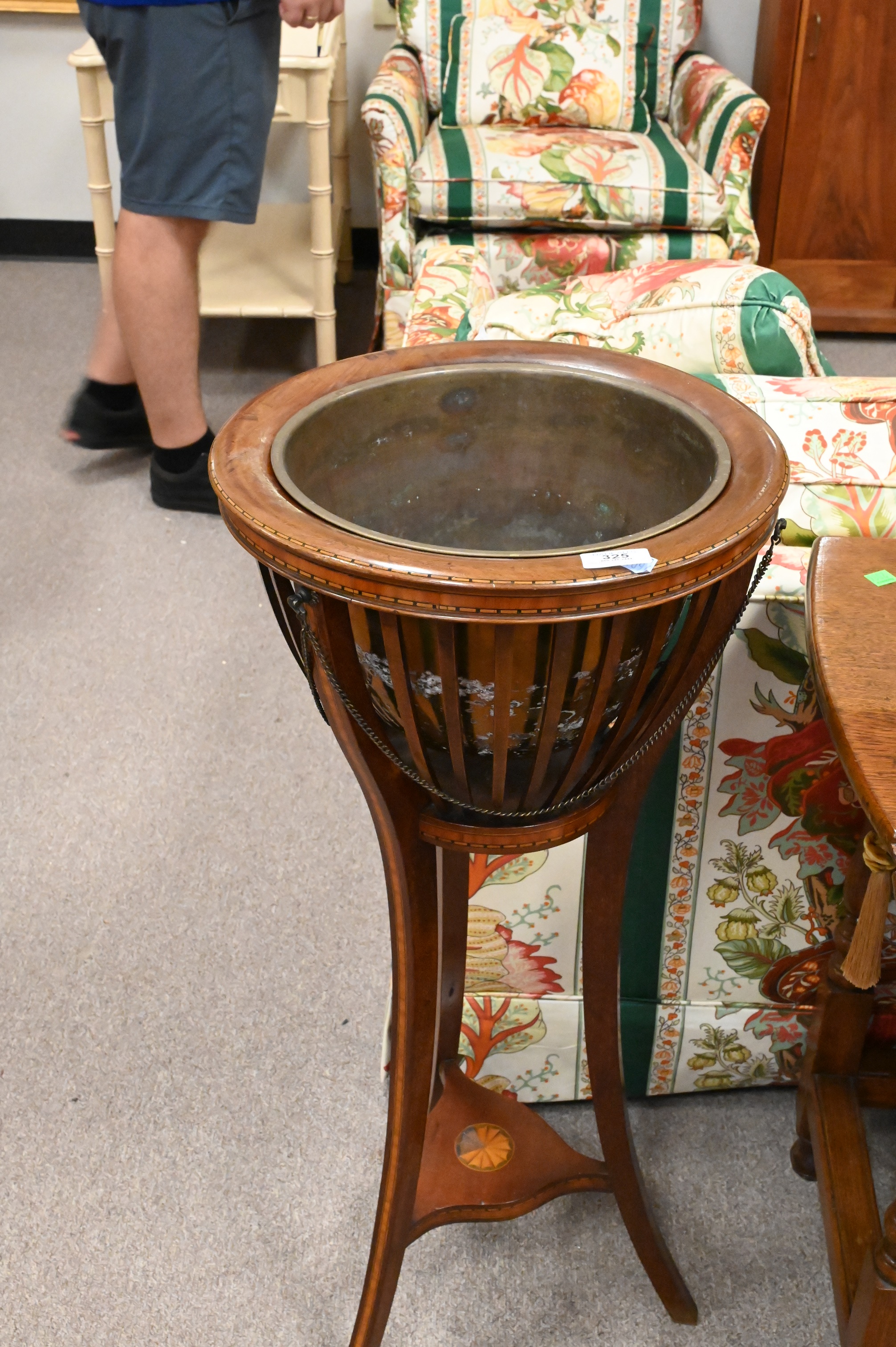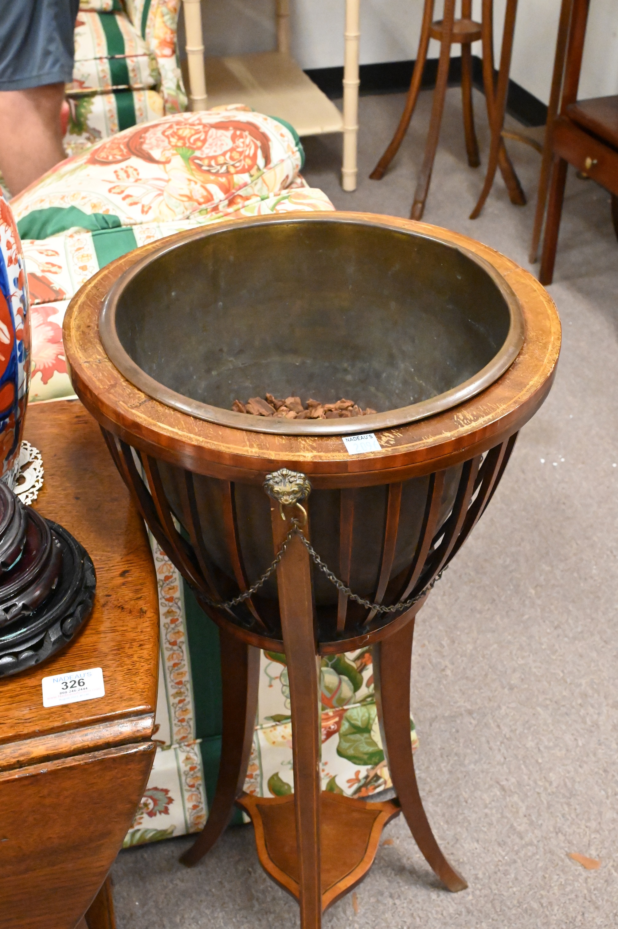 Two Mahogany Fern or Plant Stands, with woven pot stands, one with copper pot, interior opening 11 inches, height 34 inches.
