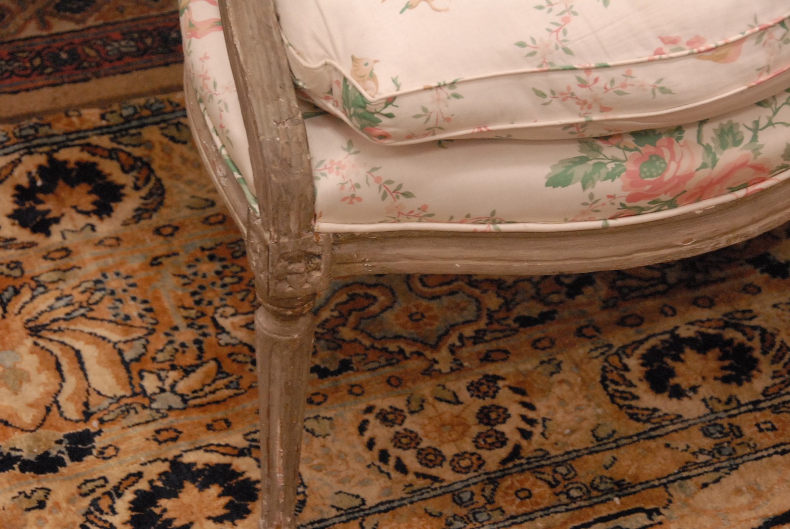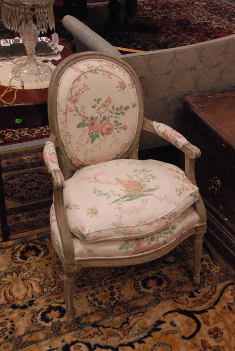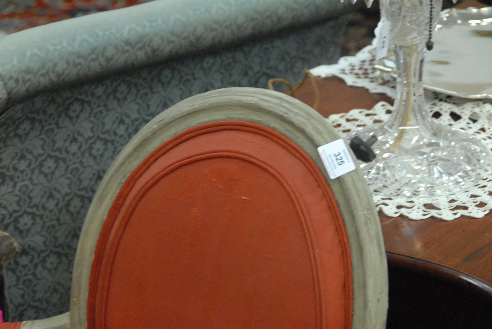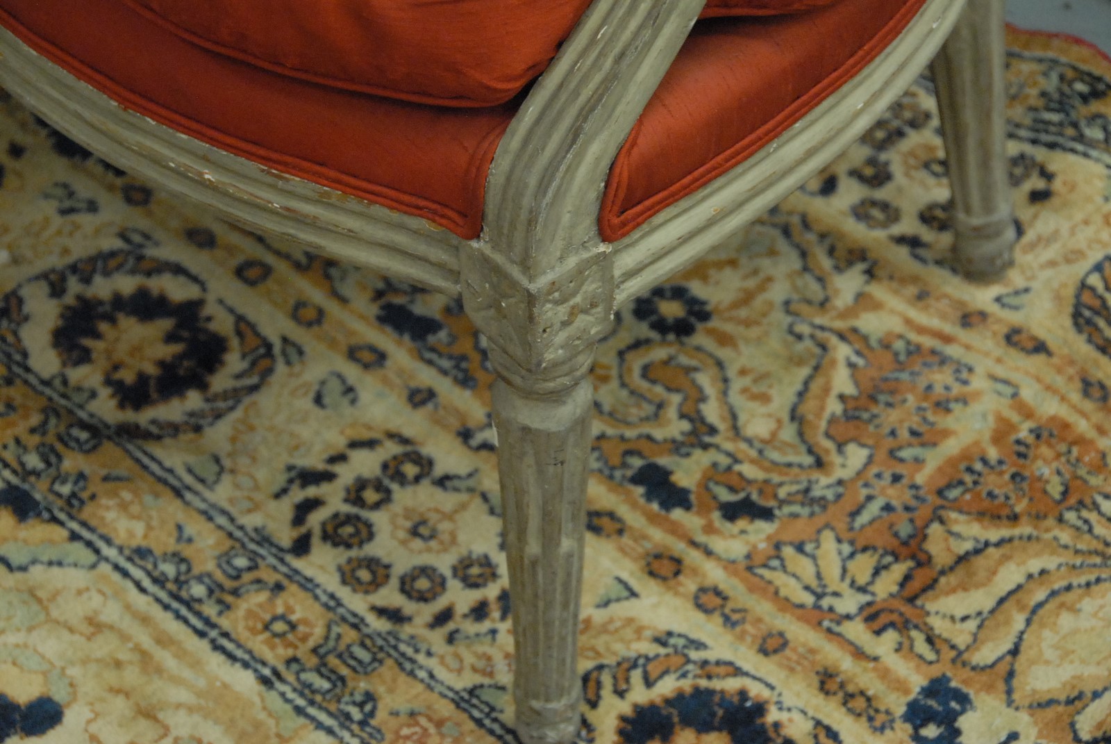 Lot 325: Two near matching Louis XVI fauteuil, each with cameo back, open arms, and cushion seats, all set on turned and fluted legs all in grey paint, probably 19th century.
