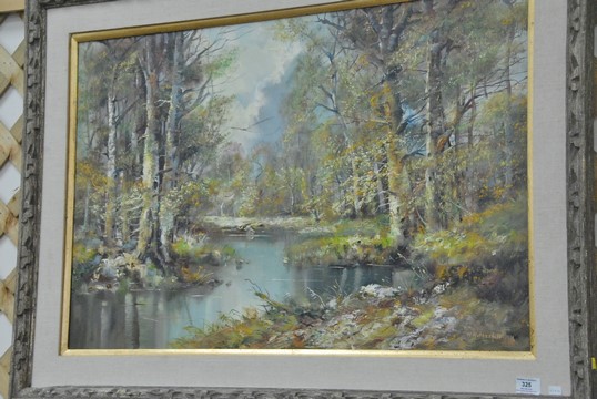 Lot 325: Two oil paintings including H. Rothschild stream with birch trees signed H. Rothschild 24 x 36 and a wooded path signed indistinct…