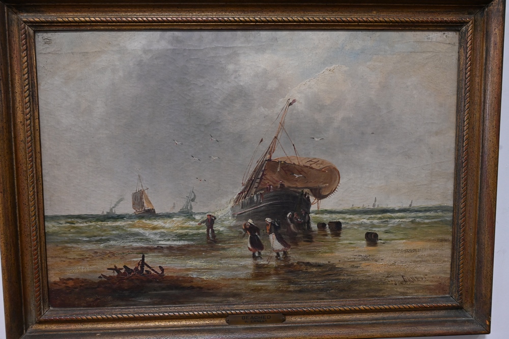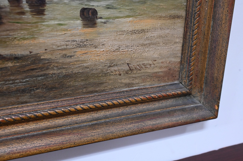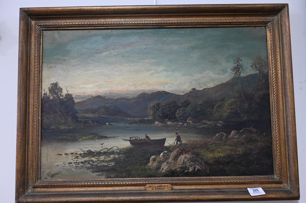 W. Ernest, two landscapes, oil on canvas, Killarney, along with Beached, both signed W. Ernest, 16″ x 24″.