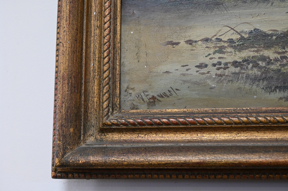 Lot 325: W. Ernest, two landscapes, oil on canvas, Killarney, along with Beached, both signed W. Ernest, 16″ x 24″.