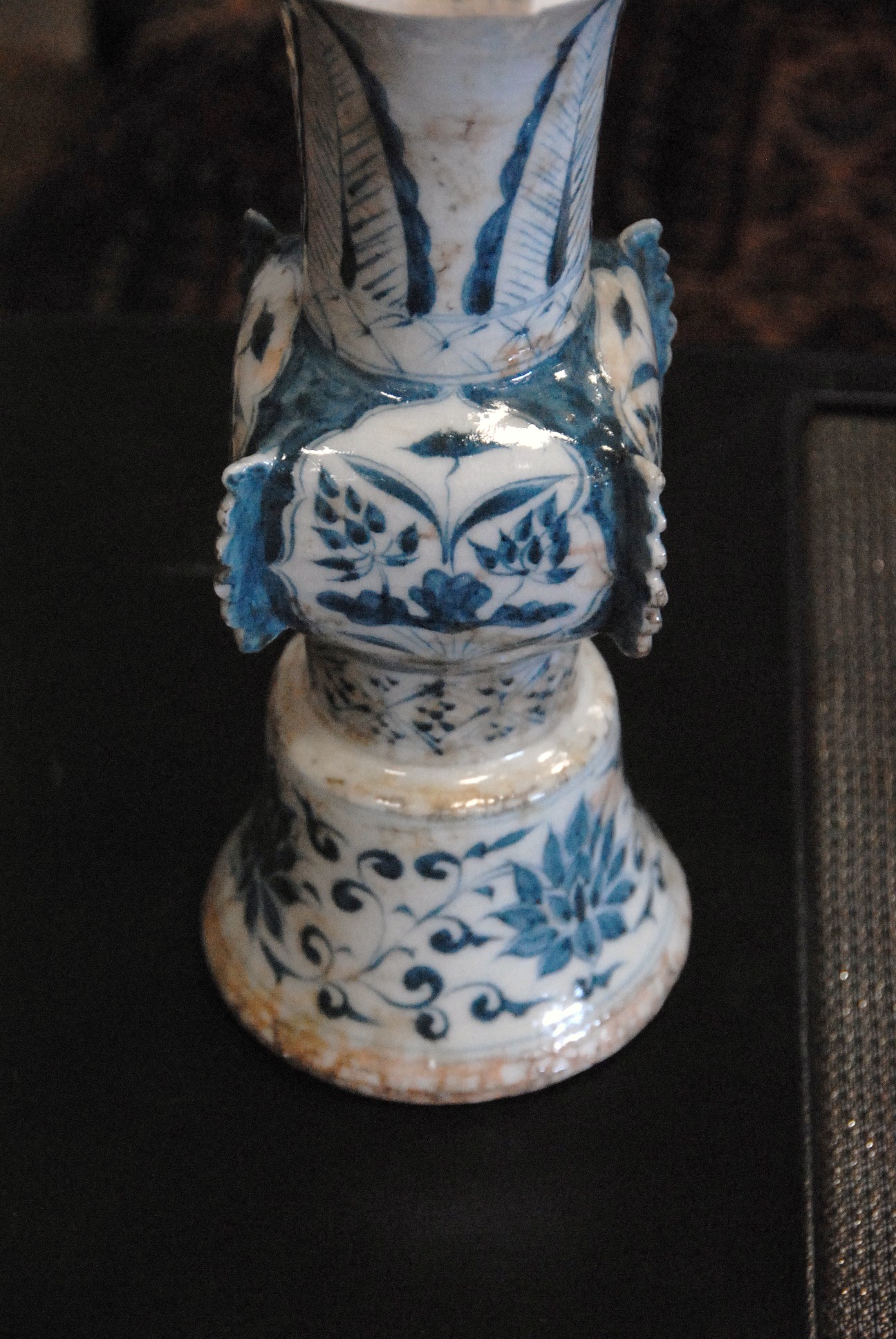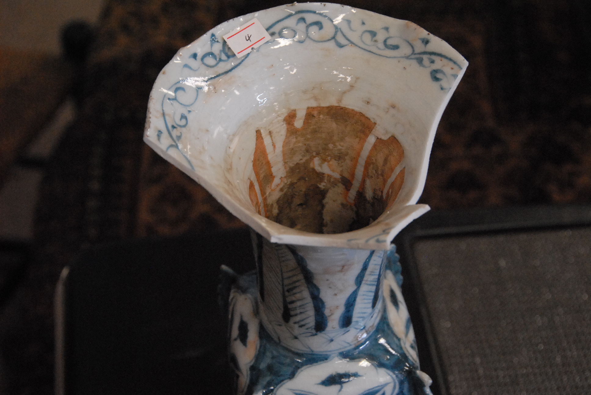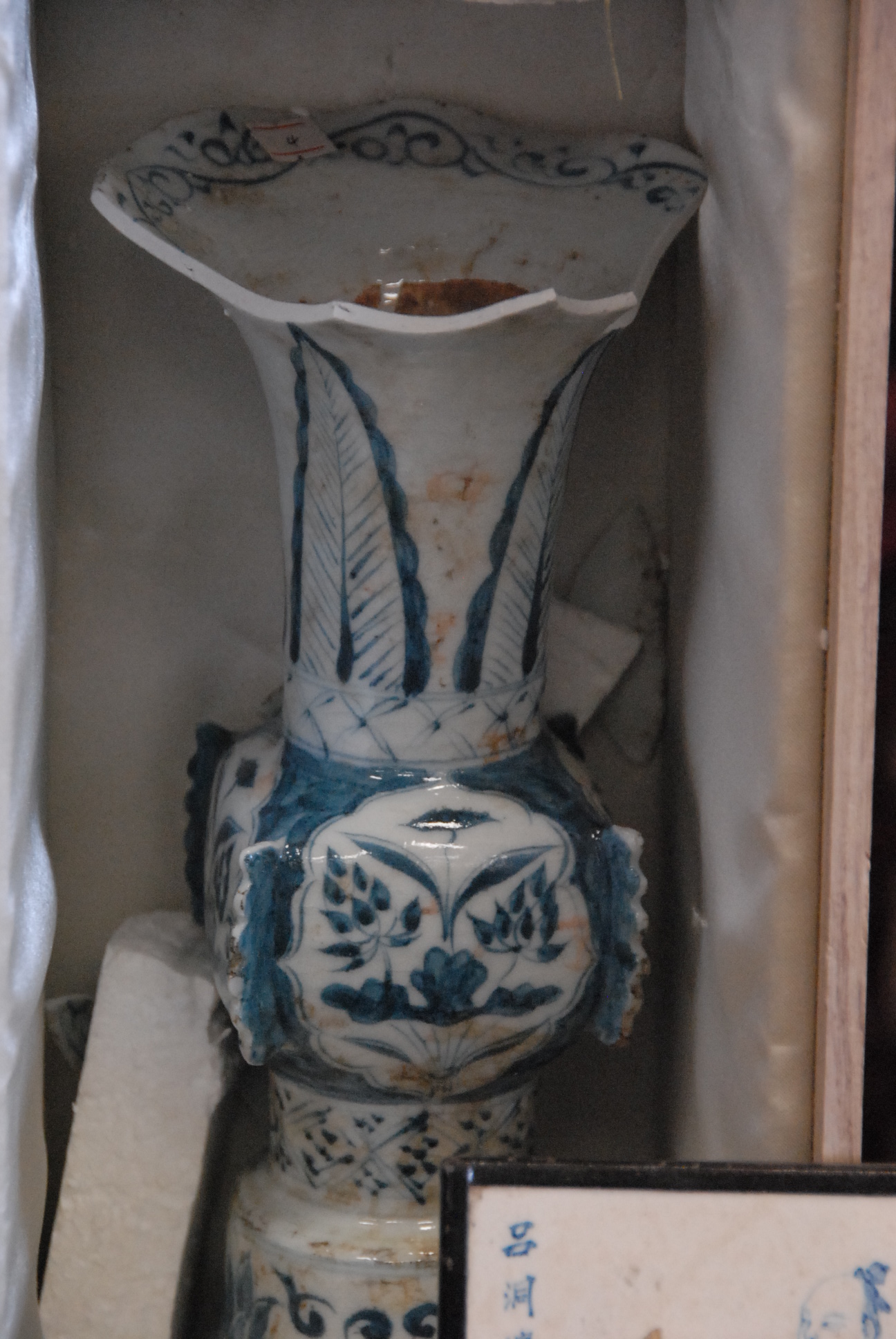 Blue and white Oriental vase, as is, along with a tile with Chinese design
