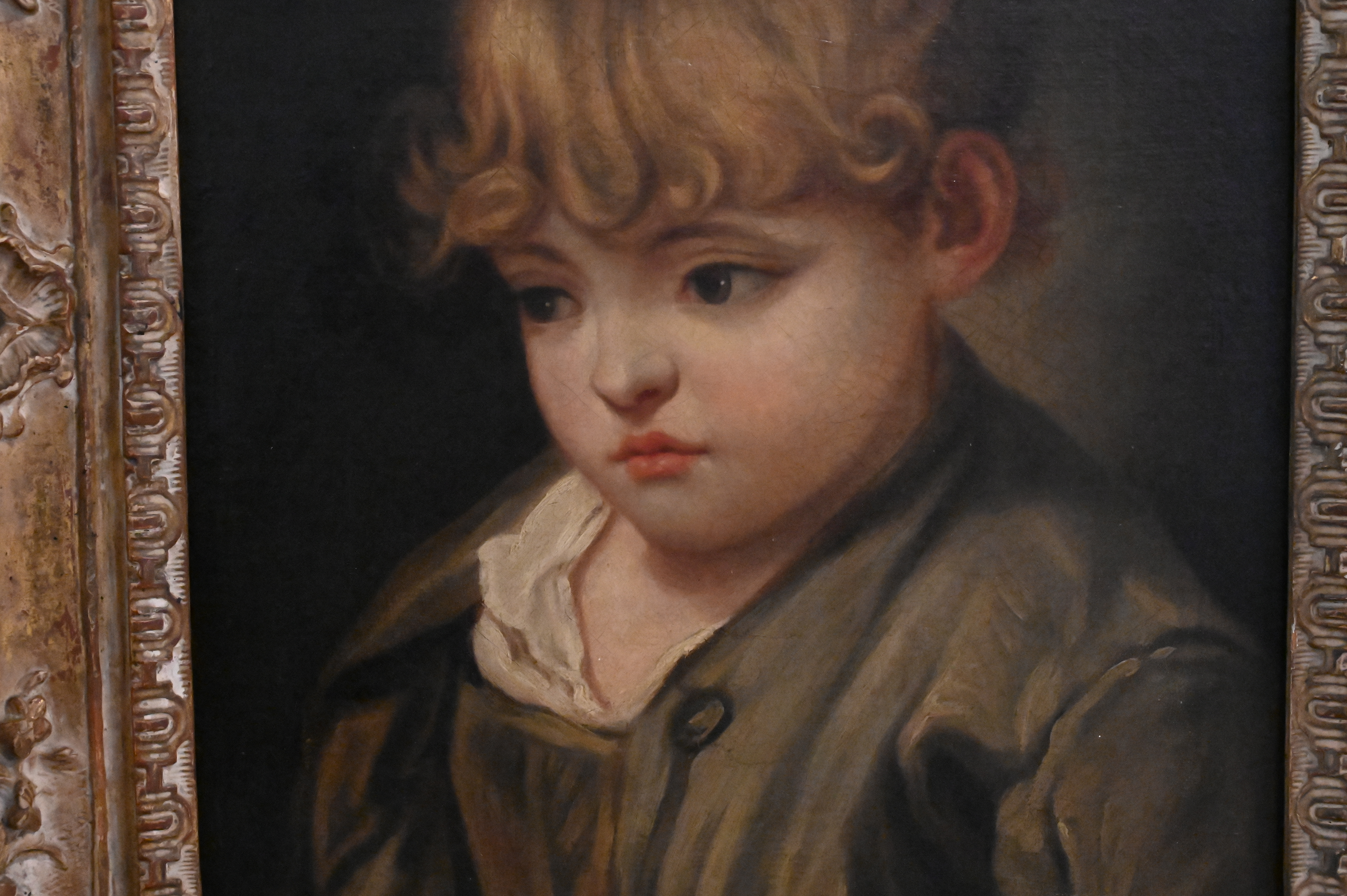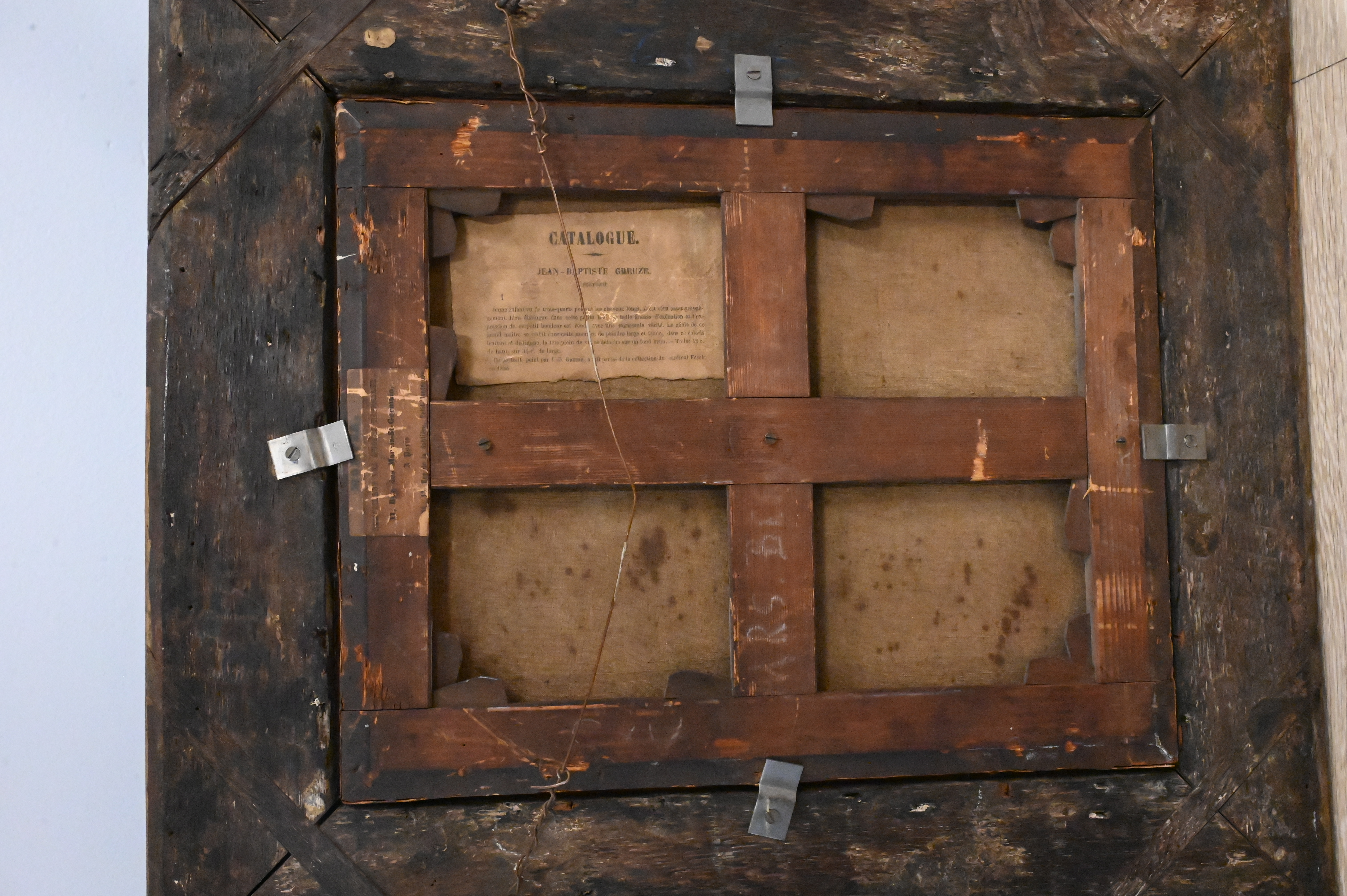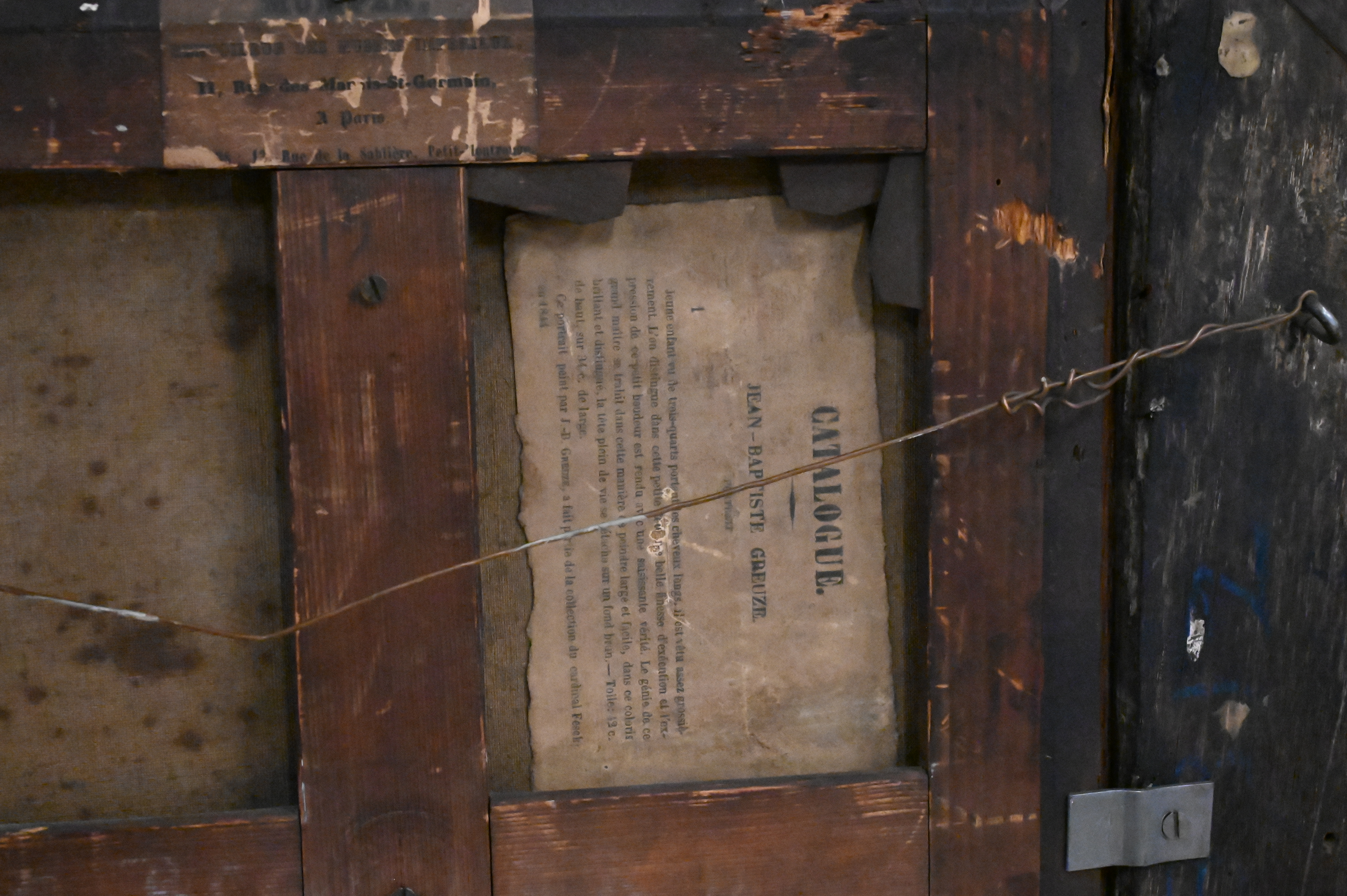 Bust-length portrait of a blond child in three-quarter view after Greuze’s celebrated composition. French catalog label verso linking the work to the Cardinal Fesch collection (unverified) and restoration label of Momper, Paris rentoileur to the Musées Impériaux, 11 rue des Marais Saint-Germain, dating the restoration to circa 1860.