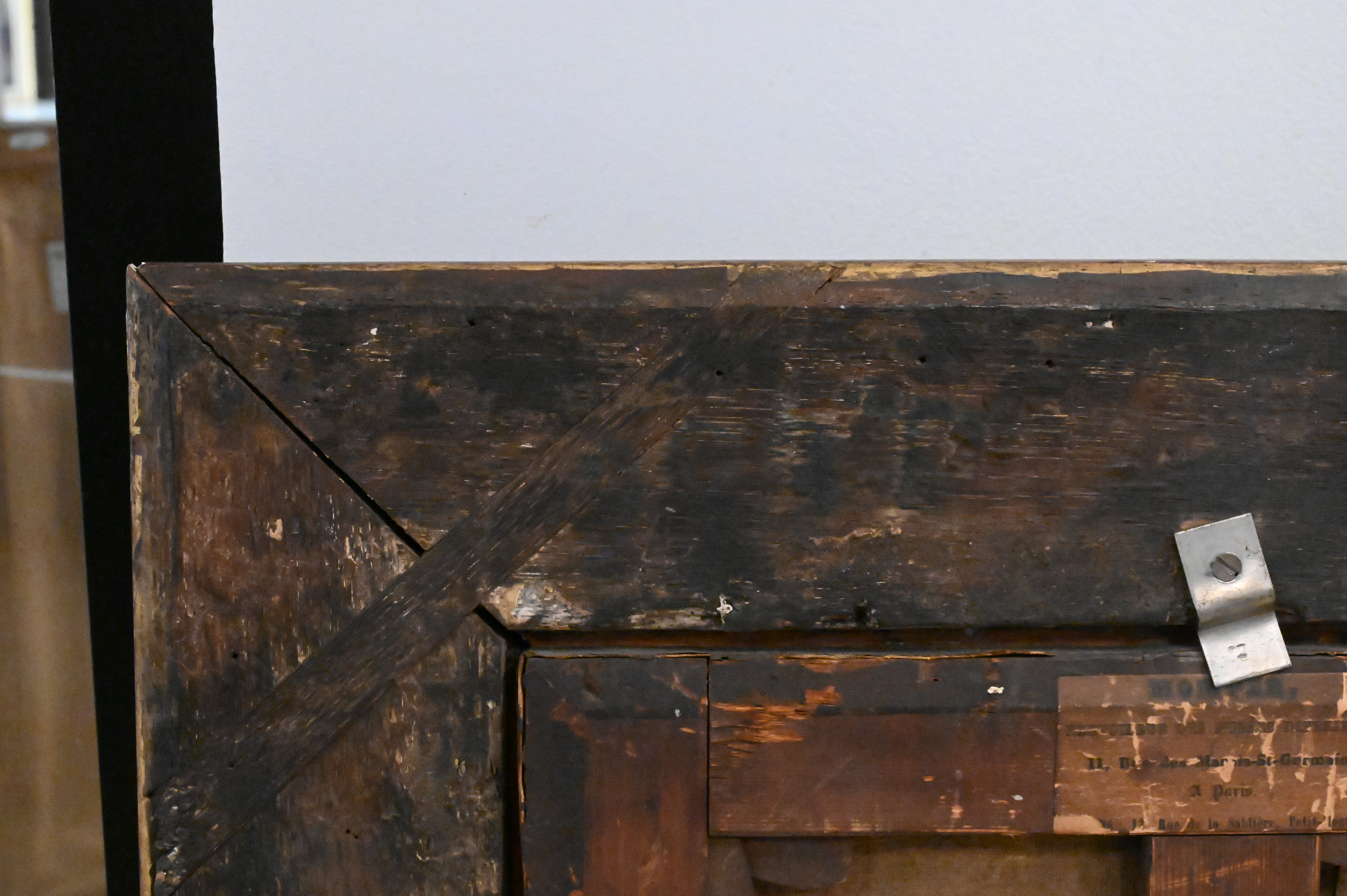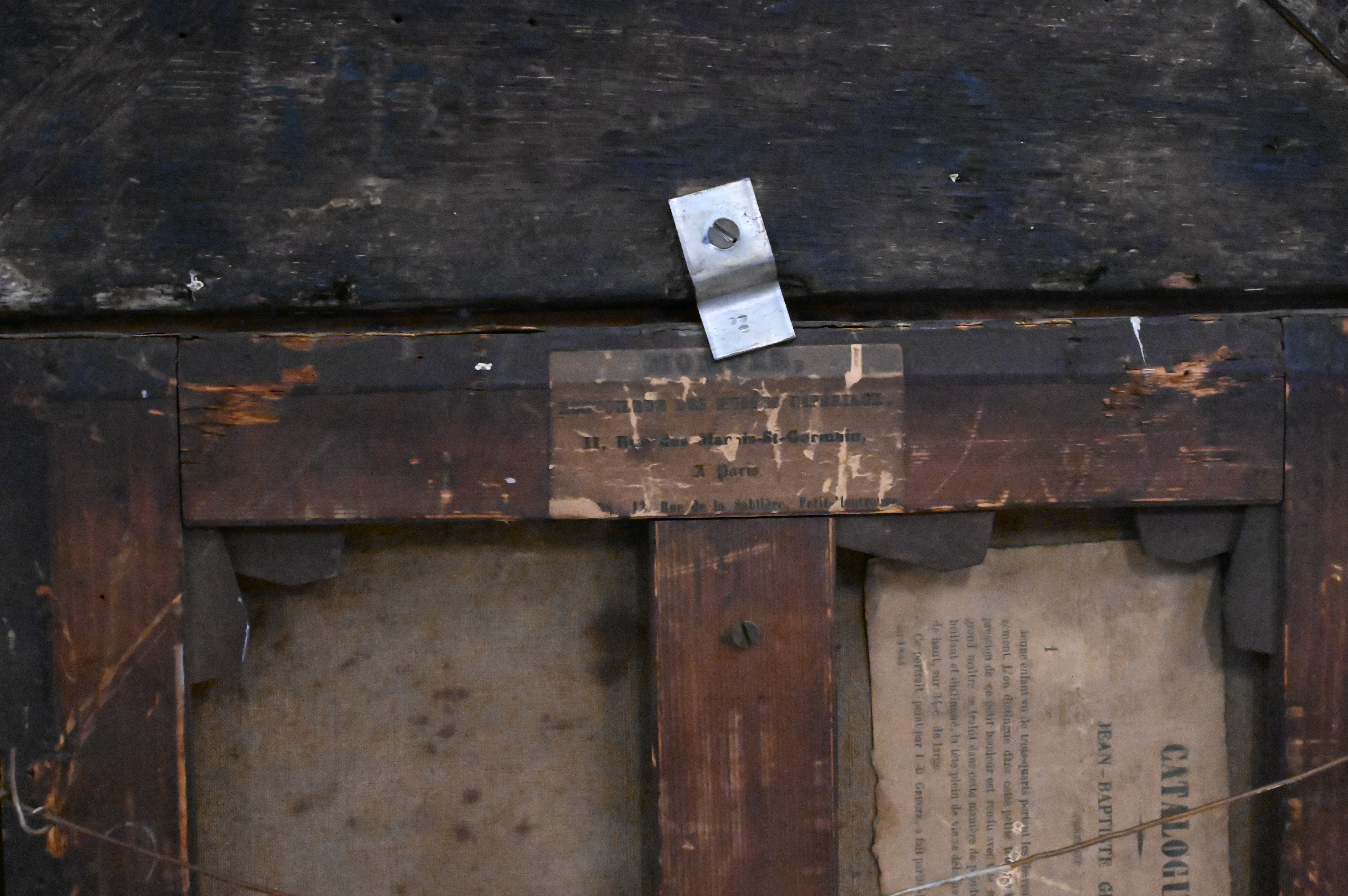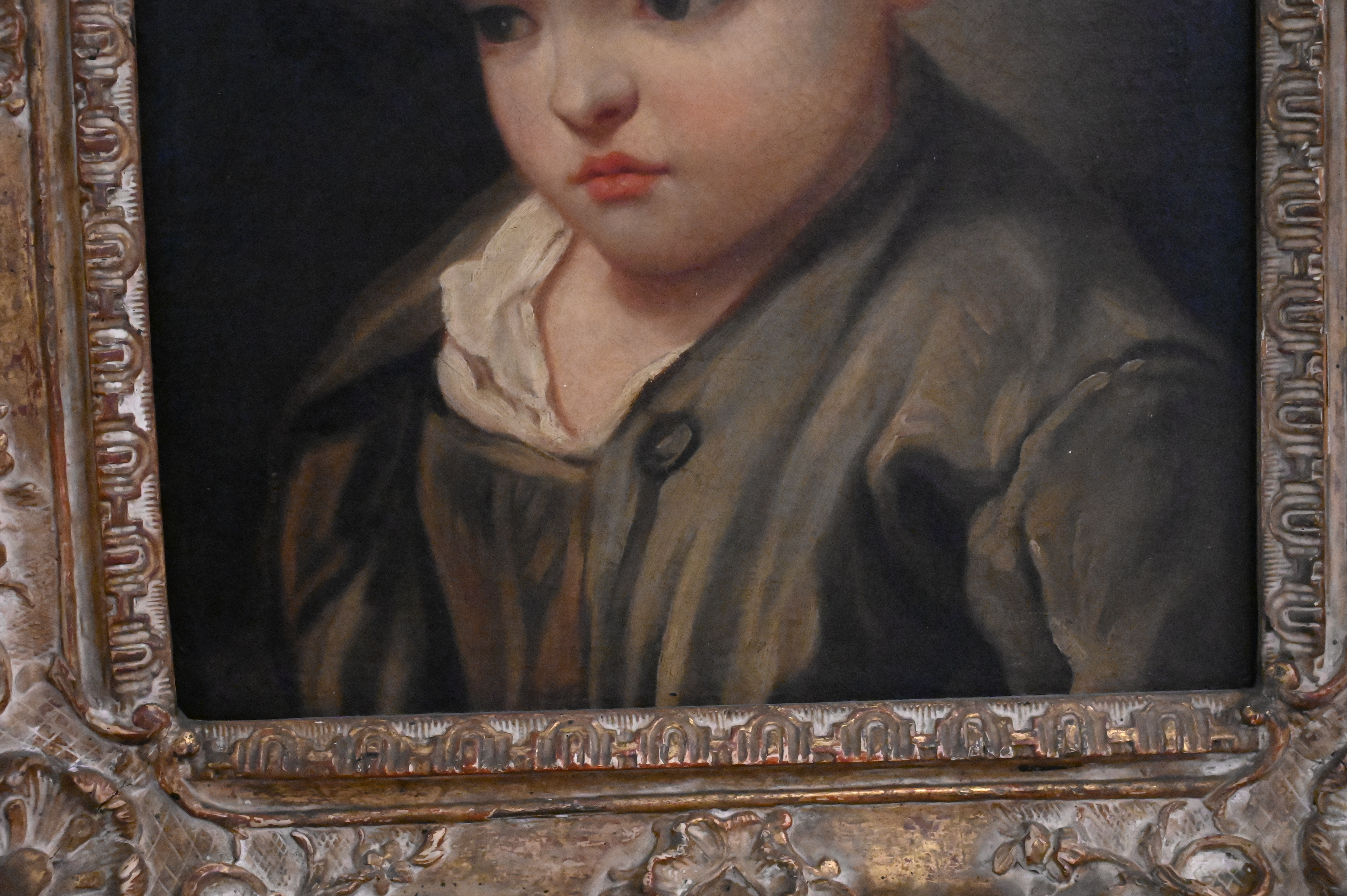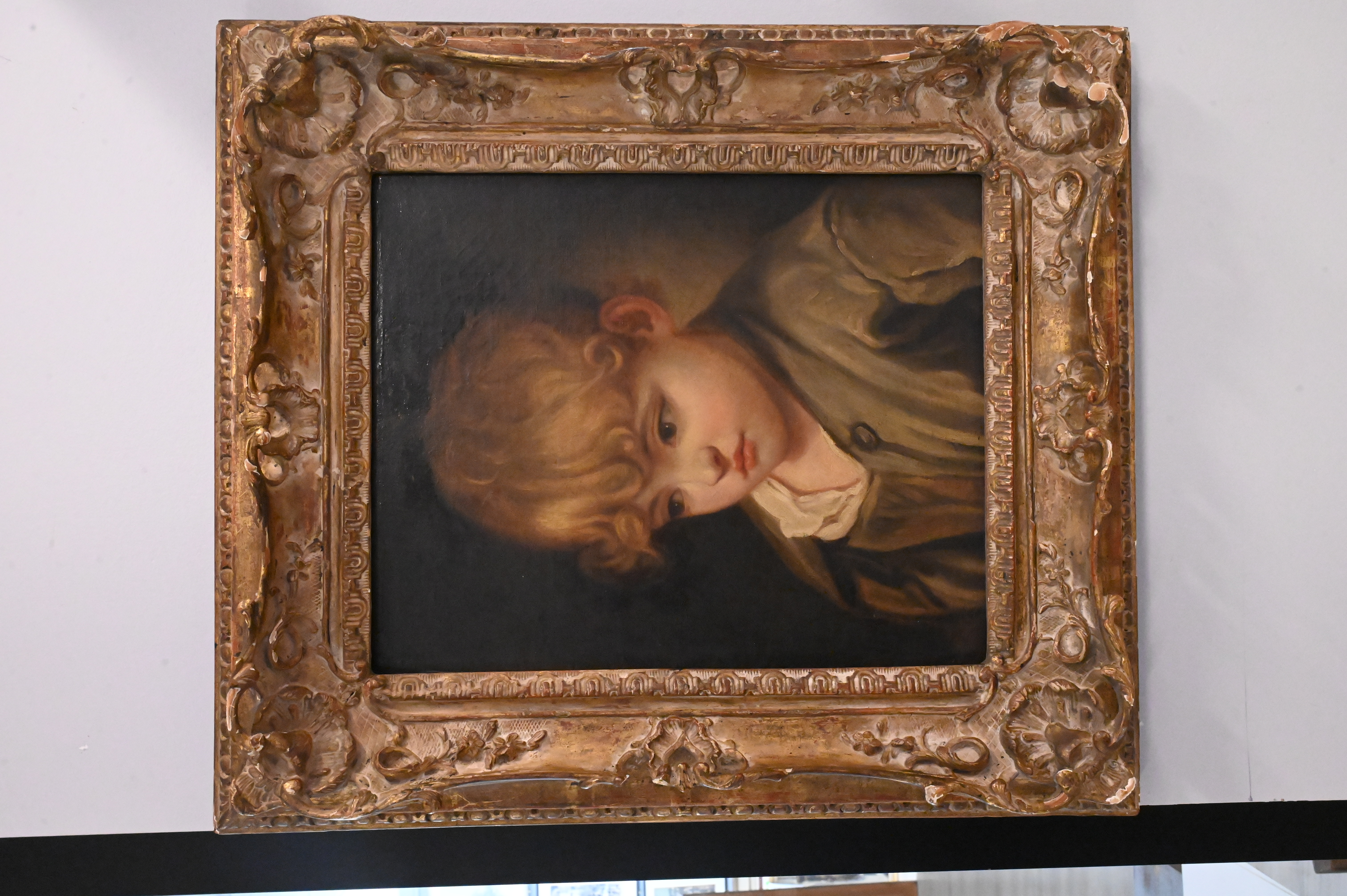 Bust-length portrait of a blond child in three-quarter view after Greuze’s celebrated composition. French catalog label verso linking the work to the Cardinal Fesch collection (unverified) and restoration label of Momper, Paris rentoileur to the Musées Impériaux, 11 rue des Marais Saint-Germain, dating the restoration to circa 1860.