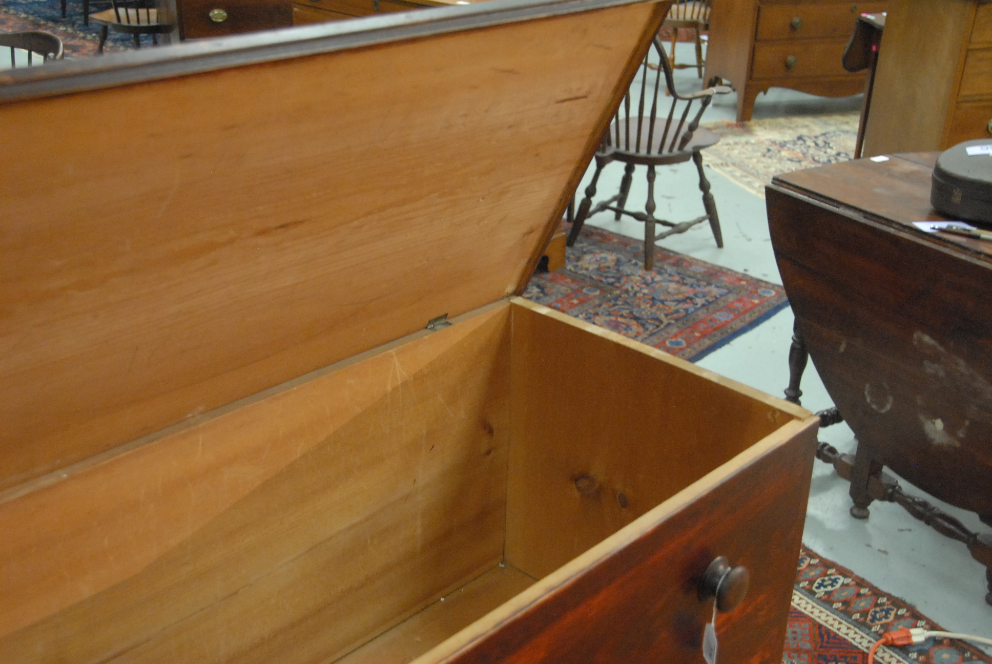 Blanket chest with lift top over two false drawers over two drawers on bracket base with original grain paint. ht. 39 in. wd. 38 1/2 in.