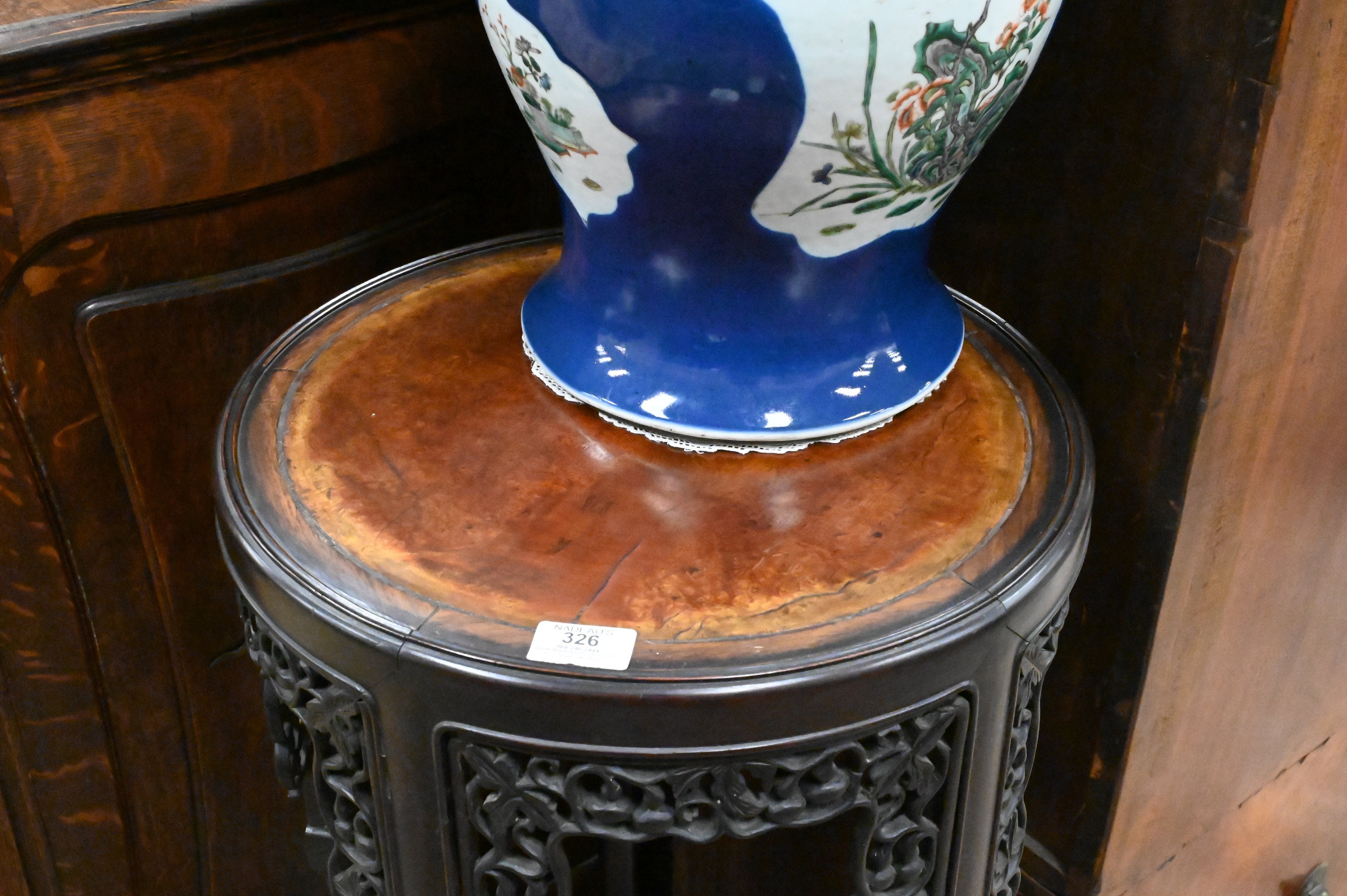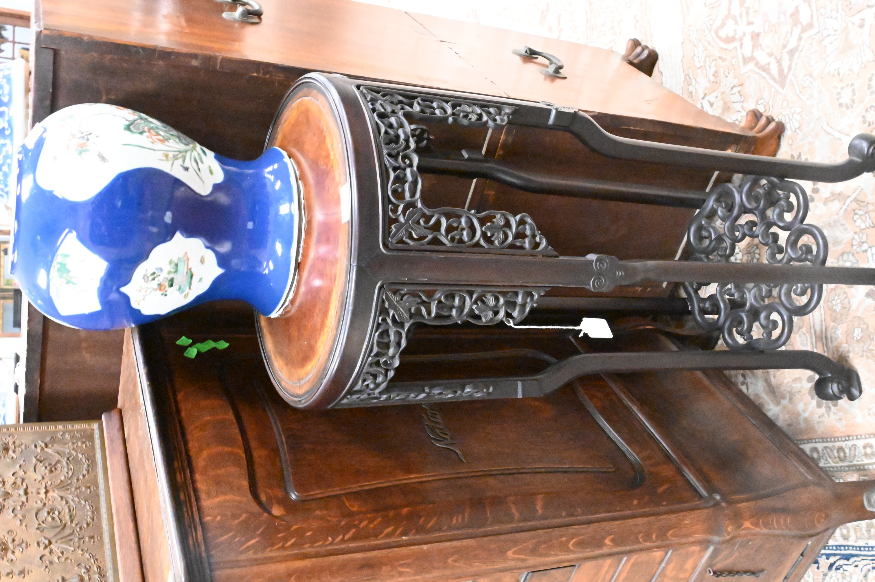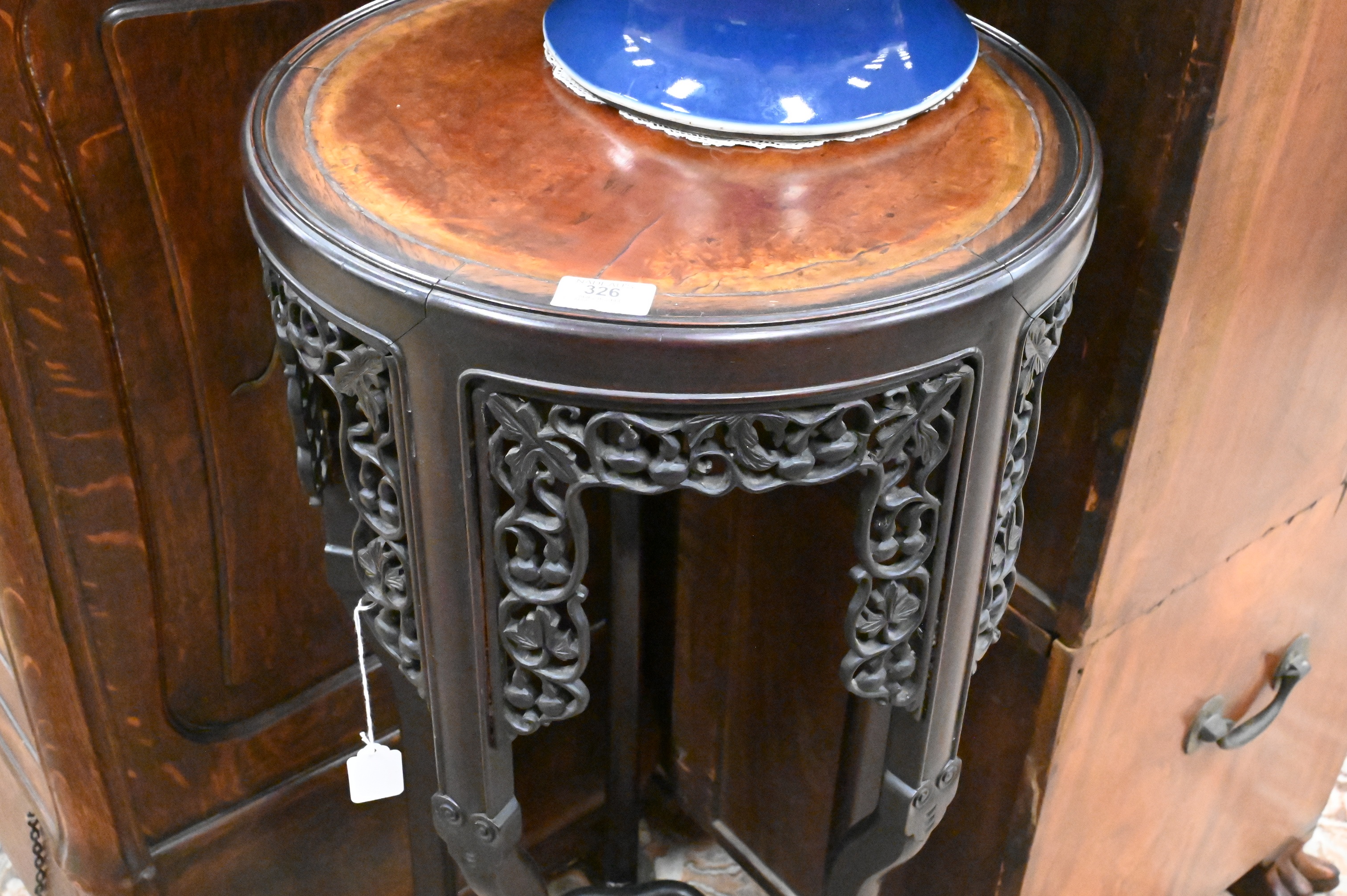 A tall hardwood plant stand with circular top and openwork apron carved in scrolling cloud motifs, supported on four slender cabriole legs with incised detailing, joined by a pierced circular stretcher, terminating in curled feet.