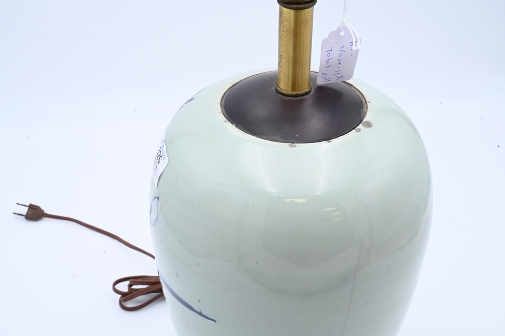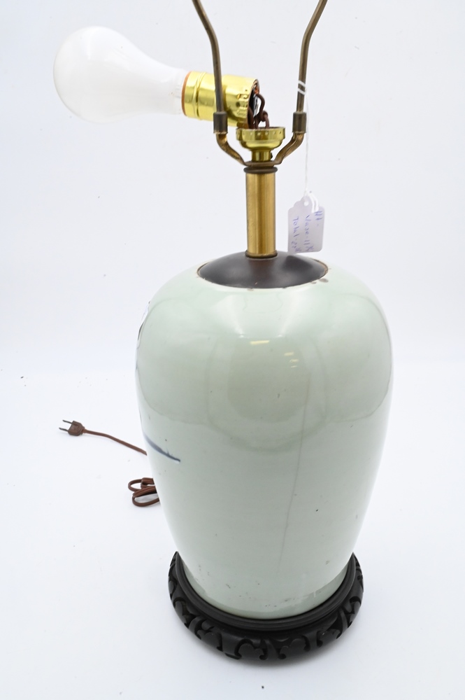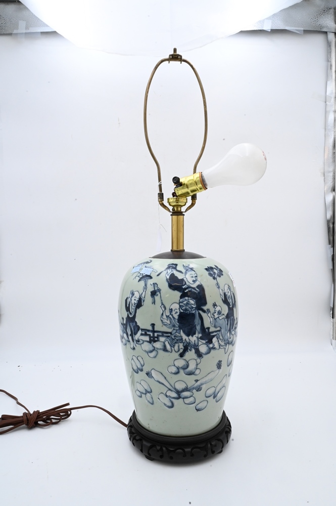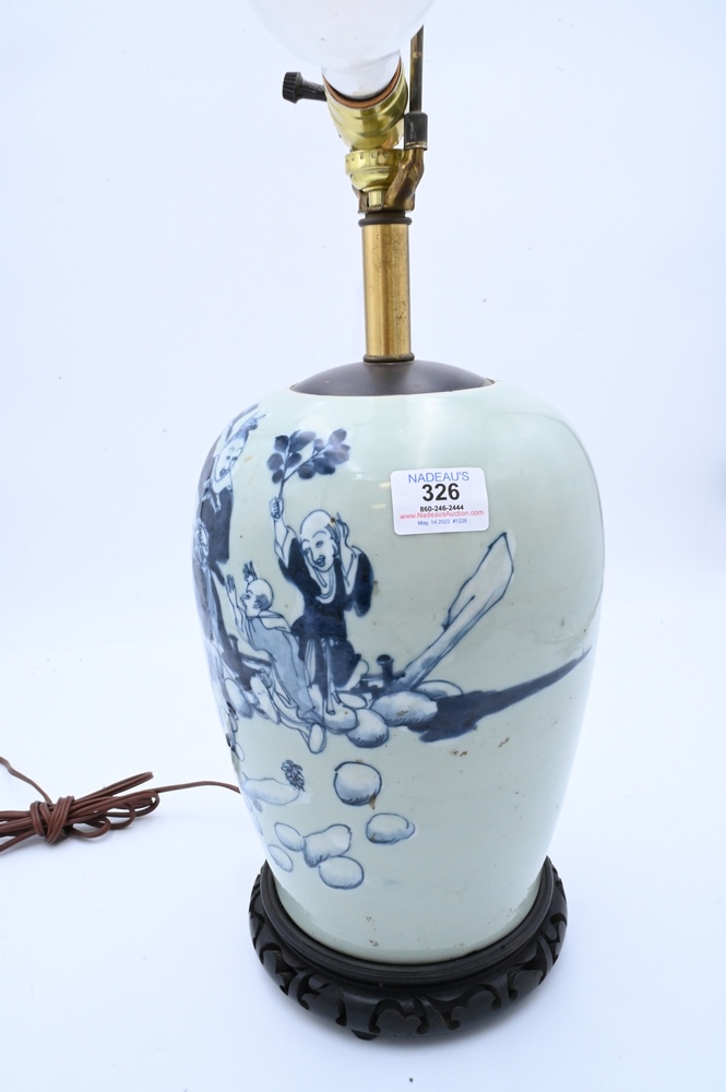 Lot 326: Chinese Porcelain Celadon and Blue Covered Urn, painted with figures playing, vase height 11 inches. Provenance: An estate from Redding, CT.