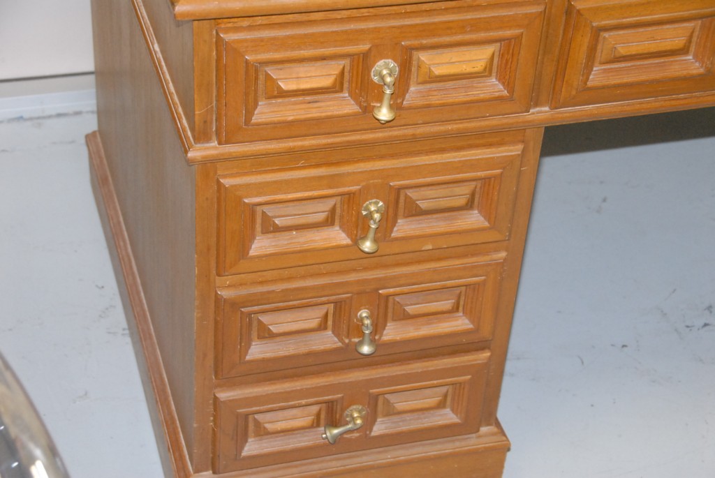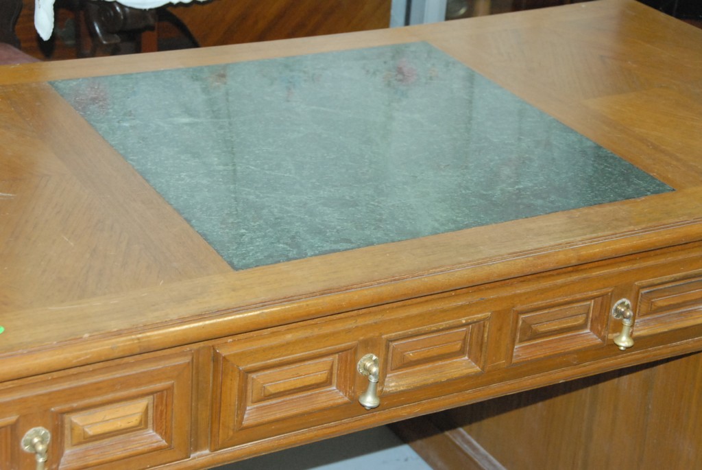 Double pedestal mahogany desk with a center granite insert, ht. 30, lg. 60, dp. 31.