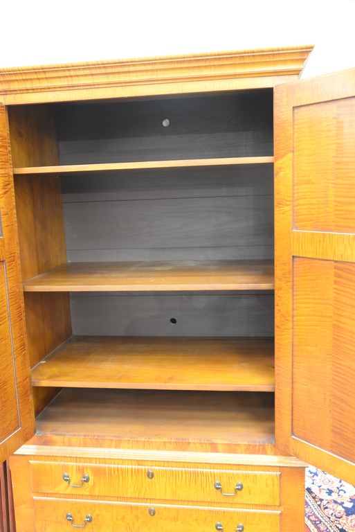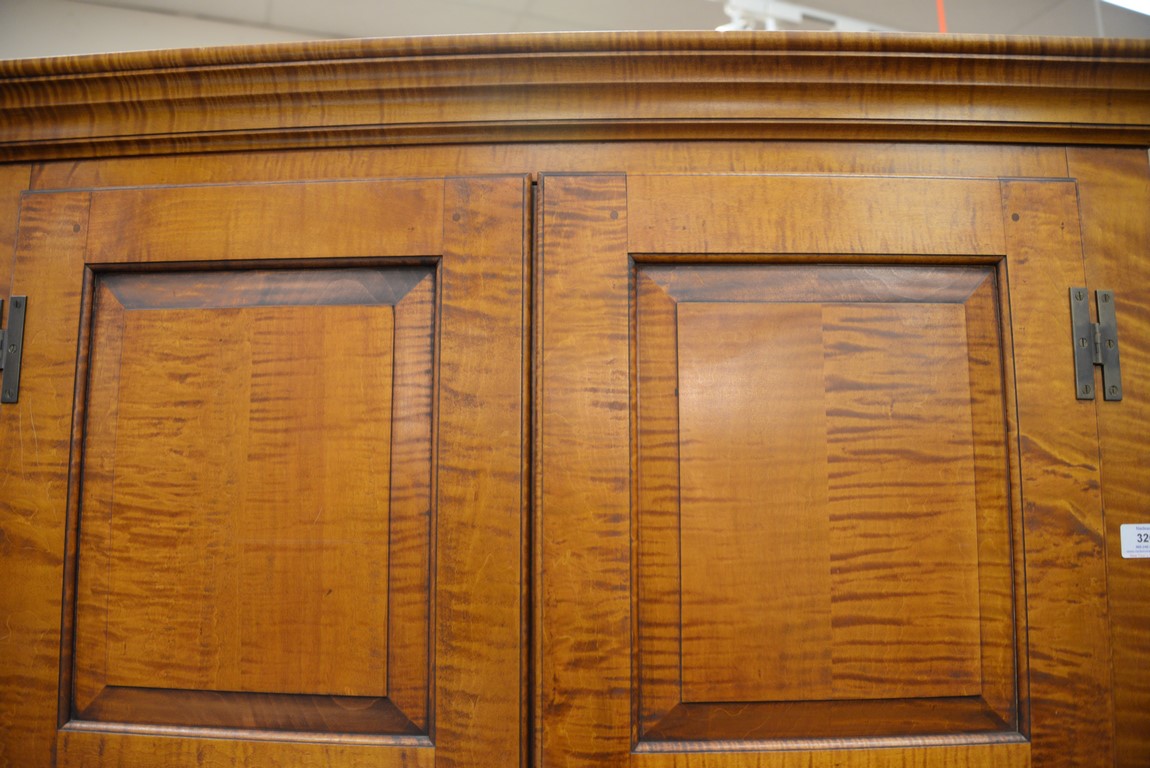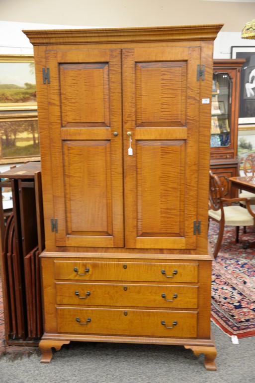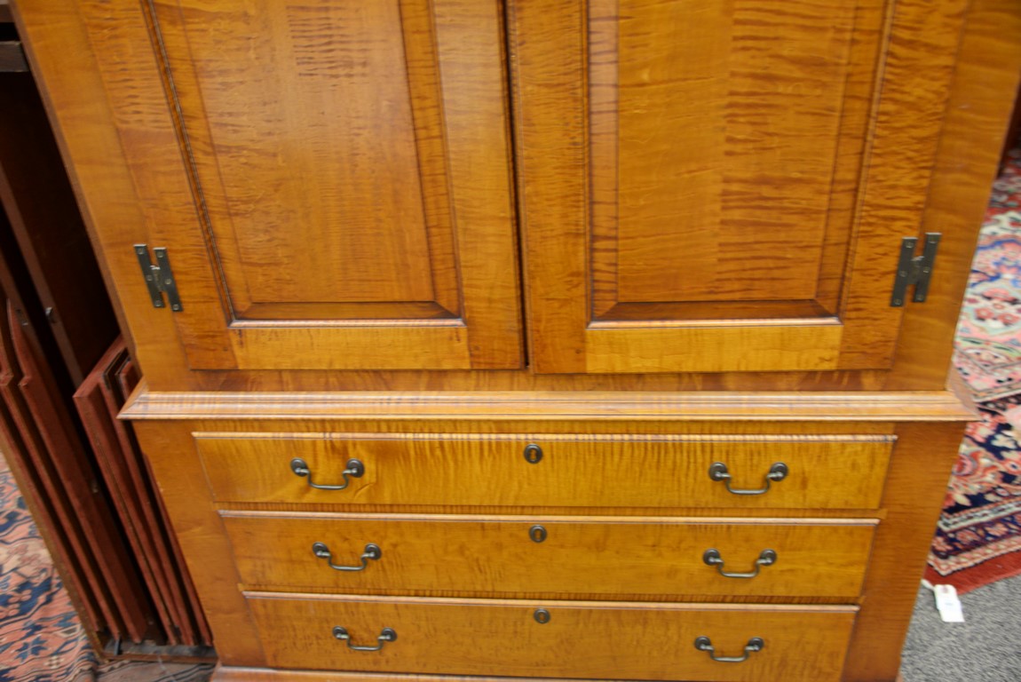 Lot 326: Eldred Wheeler tiger maple cabinet in two parts, upper section with two doors on base with three drawers, all set on bracket feet, s…