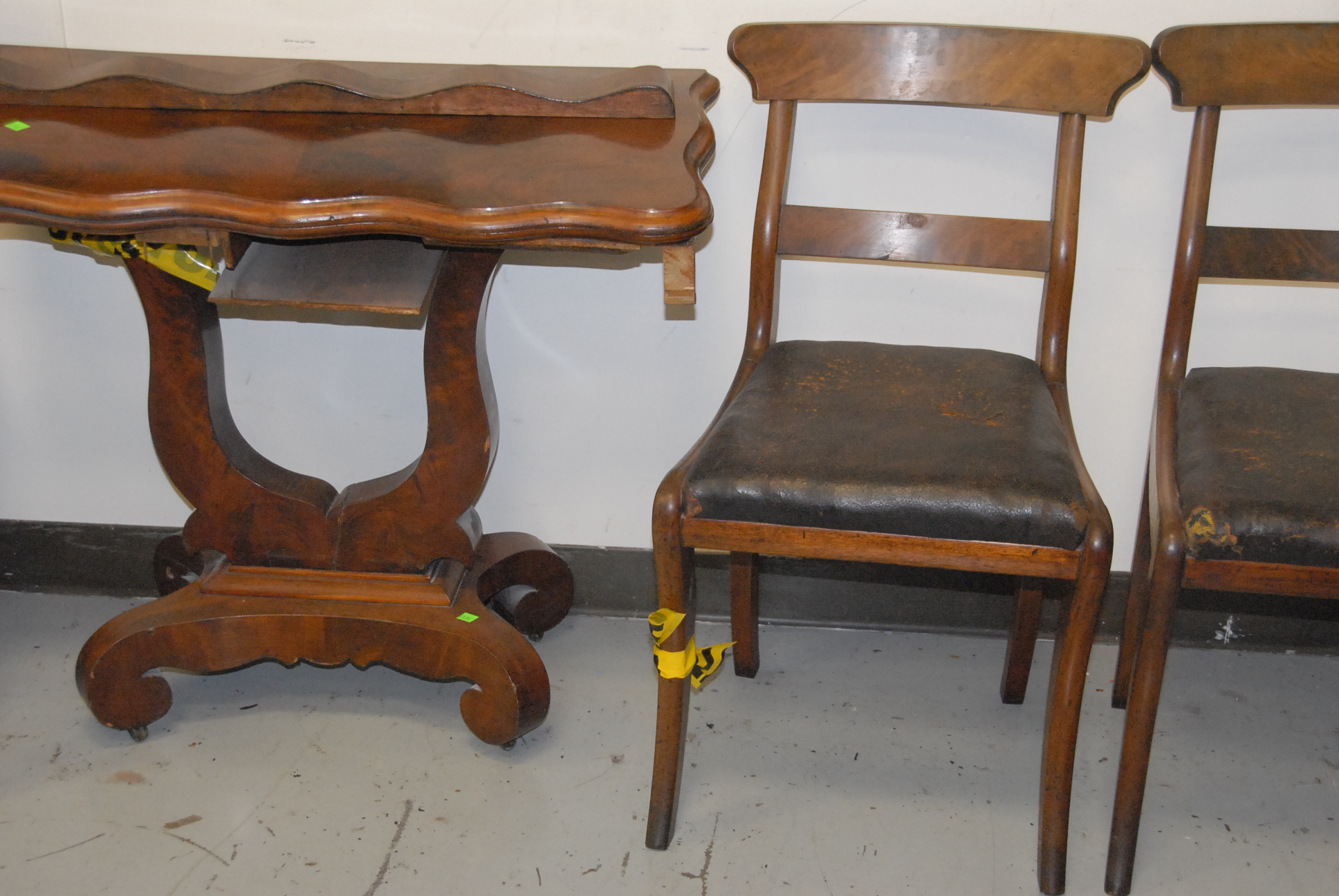 Lot 326: Five piece lot four Federal mahogany side chairs three with original leather seats and Empire game table as is. Being sold to be…