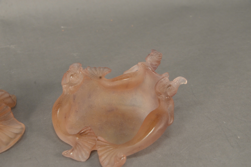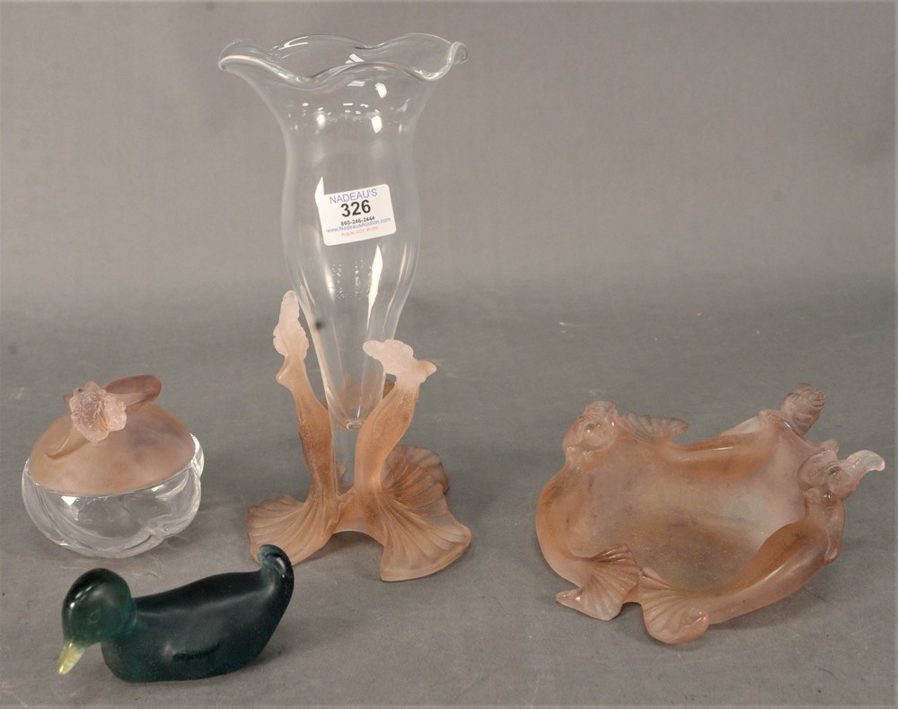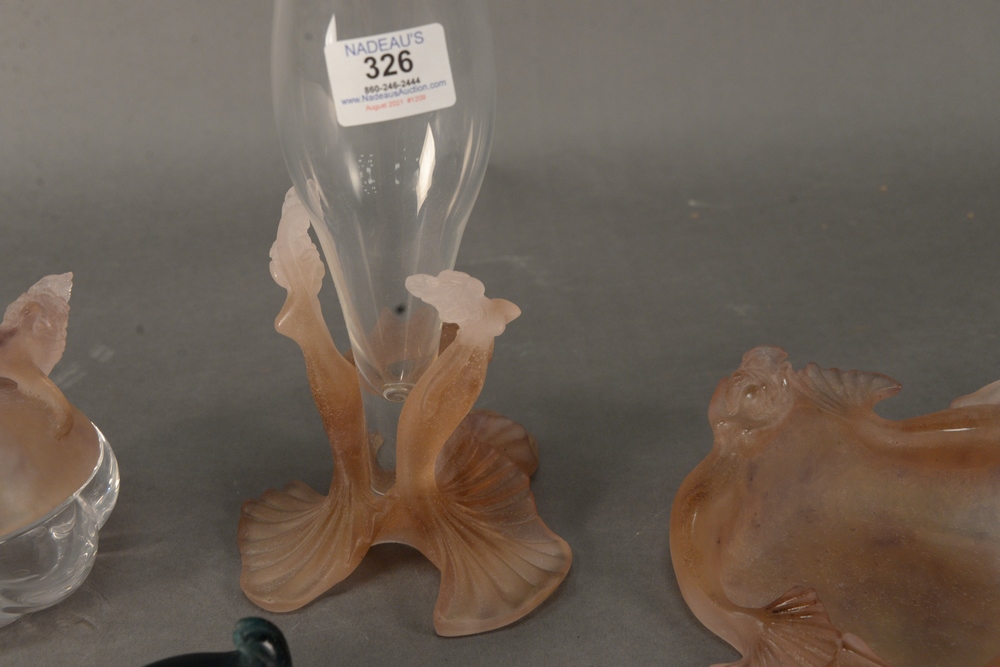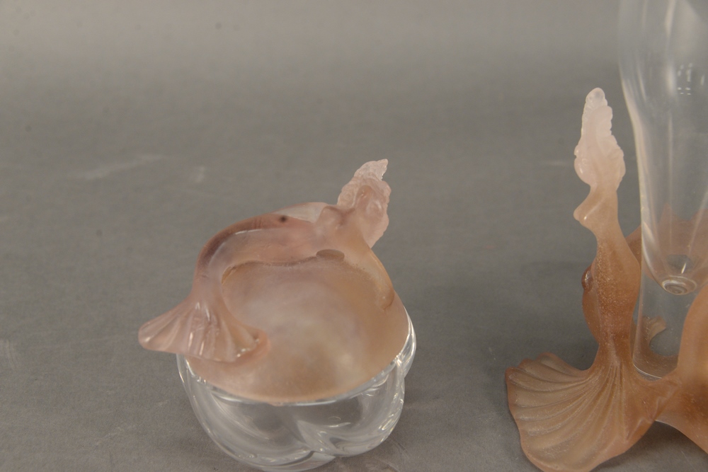Lot 326: Four Piece Daum Plate DeVerre Pieces, to include a mermaid form dish, a trinket box with mermaid lid, a clear glass vase having merm…