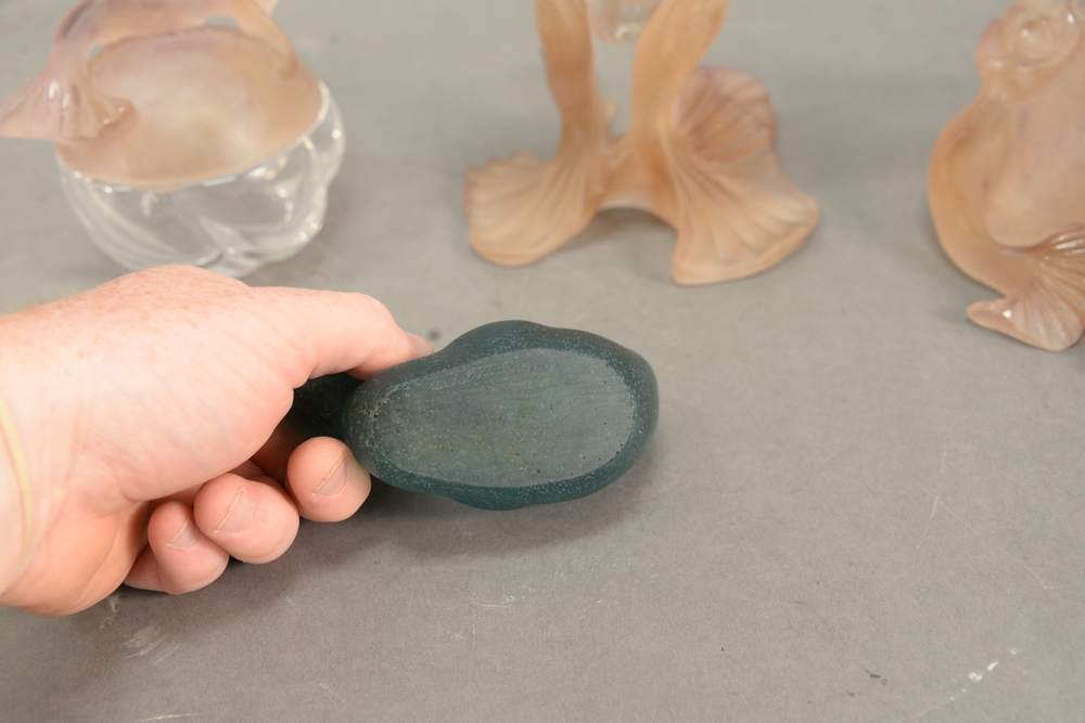 Four Piece Daum Plate DeVerre Pieces, to include a mermaid form dish, a trinket box with mermaid lid, a clear glass vase having mermaid form base, along with a green duck, each in original box, height 11 inches.