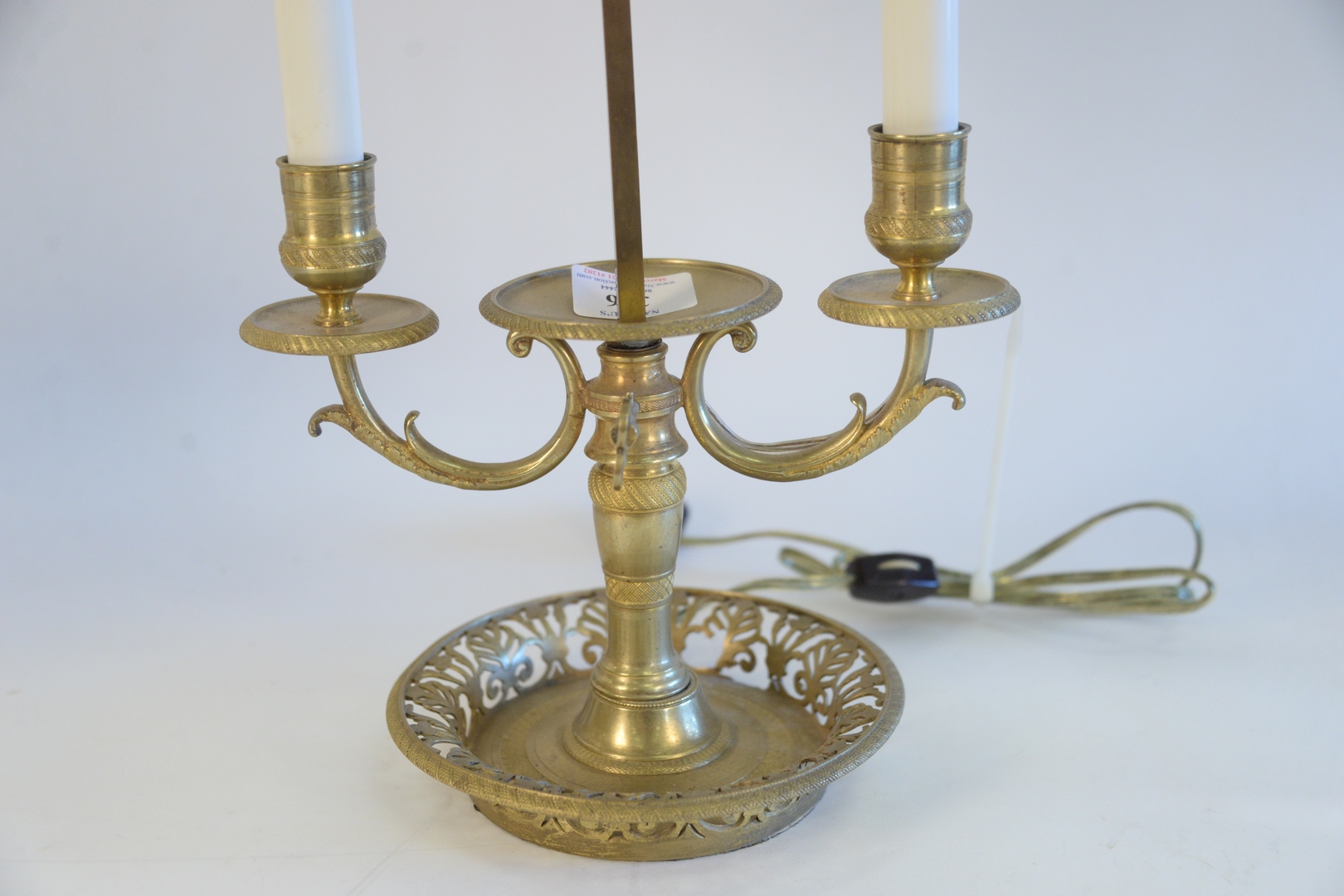 Lot 326: French Bouillotte Brass Table Lamp, having orange told shade, with 2 lights, total height 26 inches.