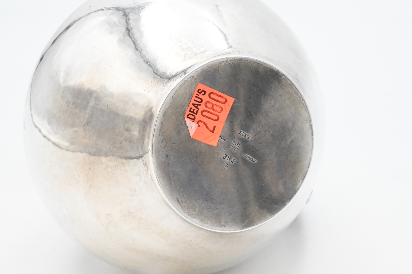 designed by Johan Rohde in 1923, design #385F, globular form with waisted neck, curved wood handle, marked G Denmark Sterling 925 385F