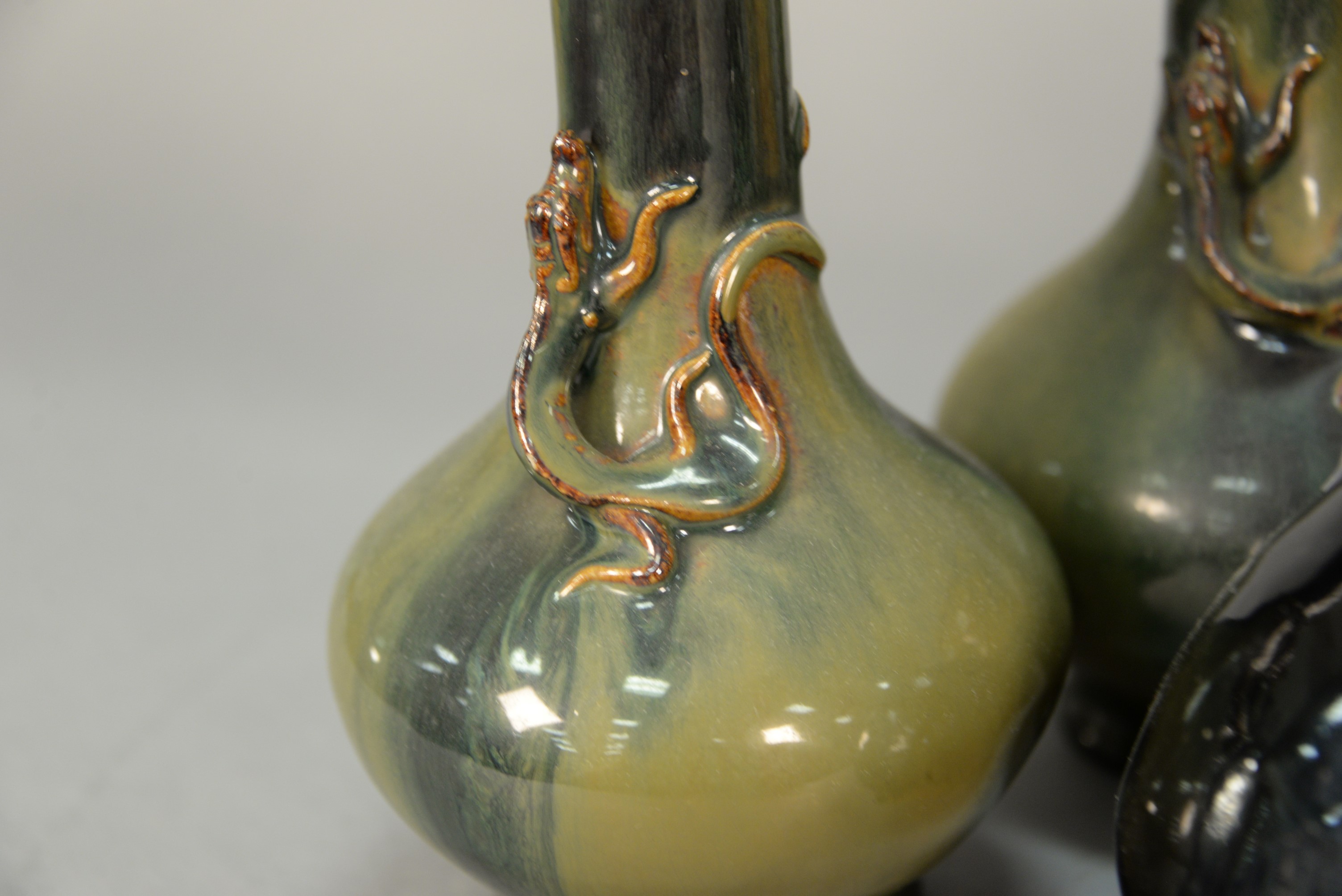 Lot 326: Group of five glazed vases including a pair of Chinese small globular vases with molded dragons, a pair of dark brown glazed vases,…