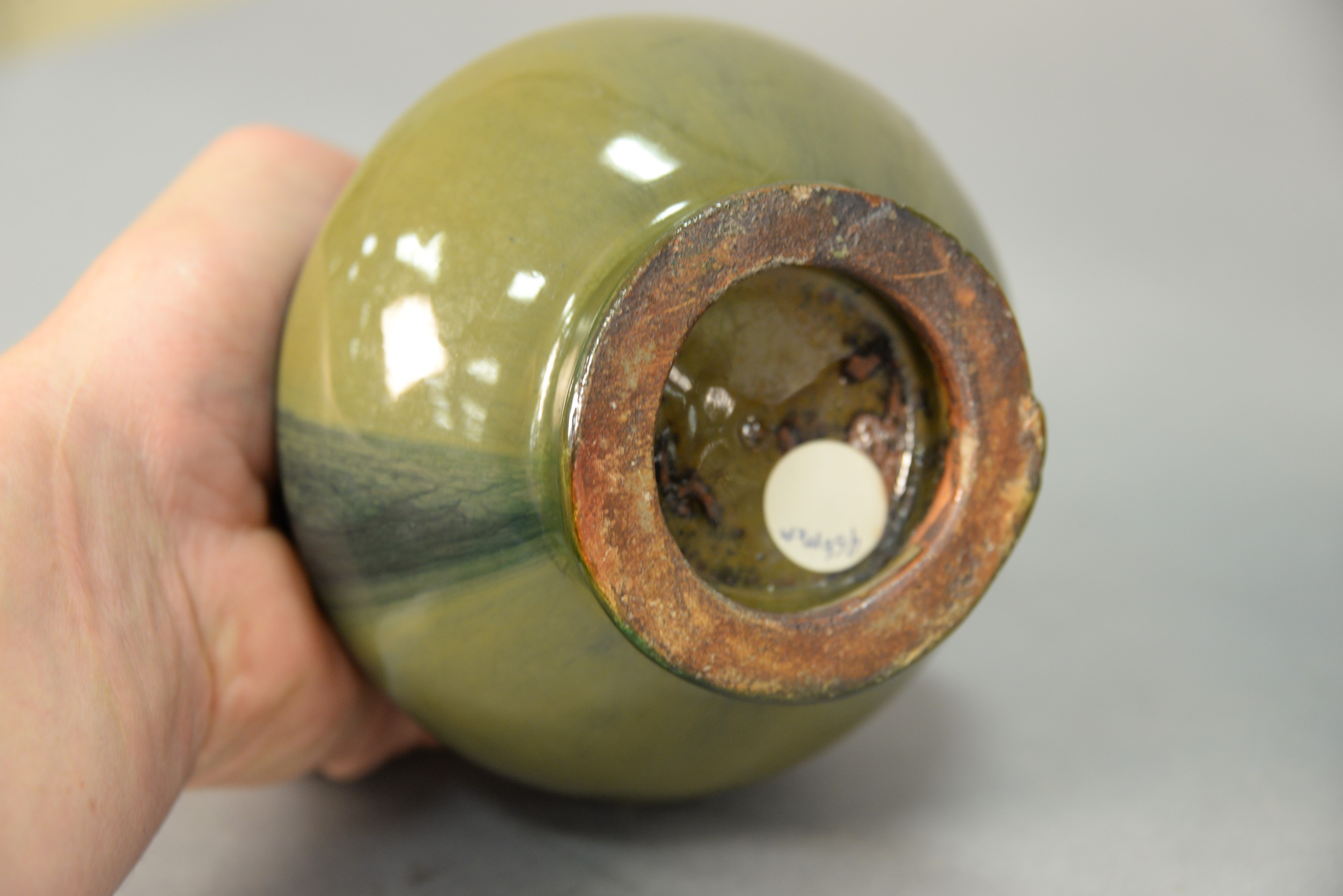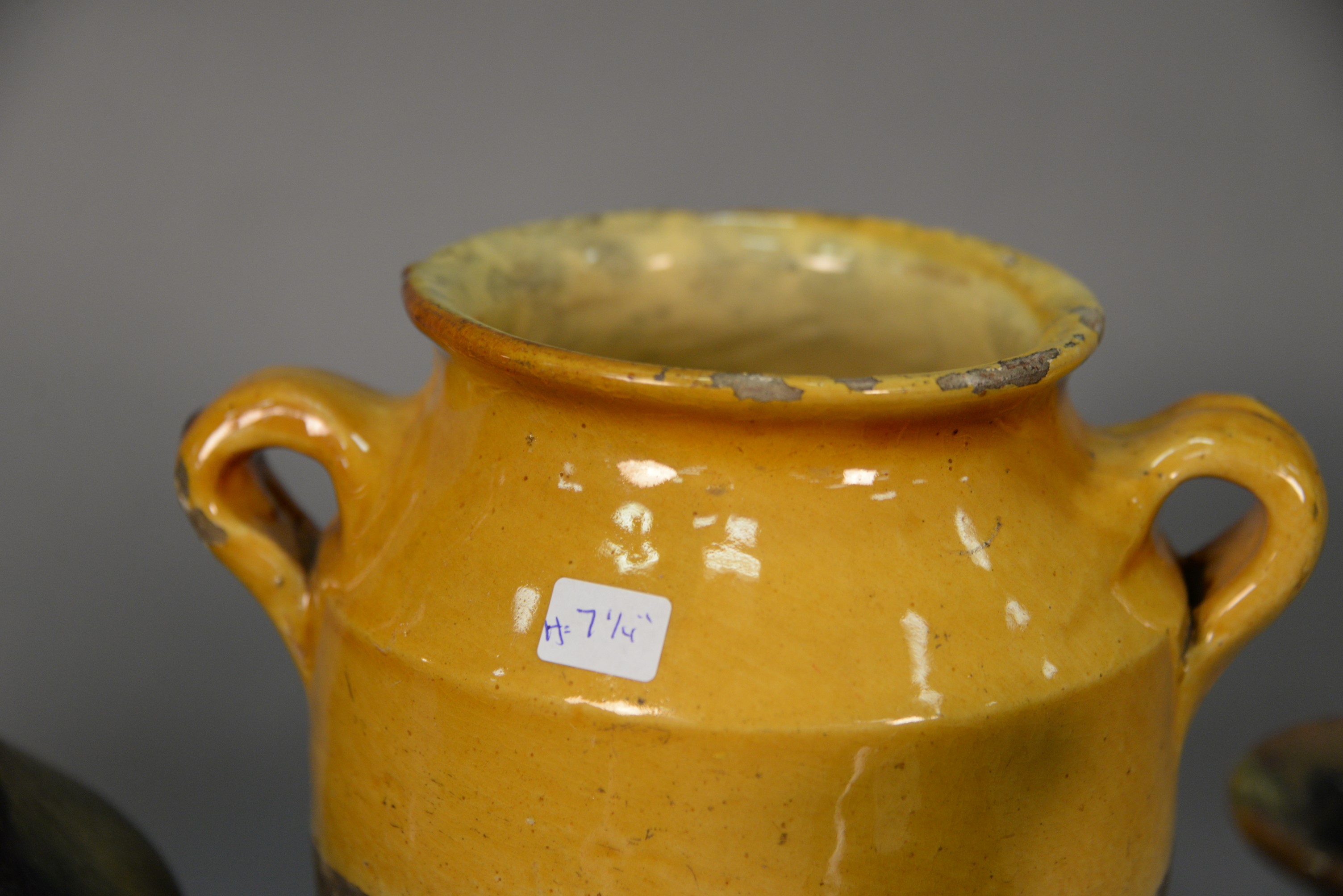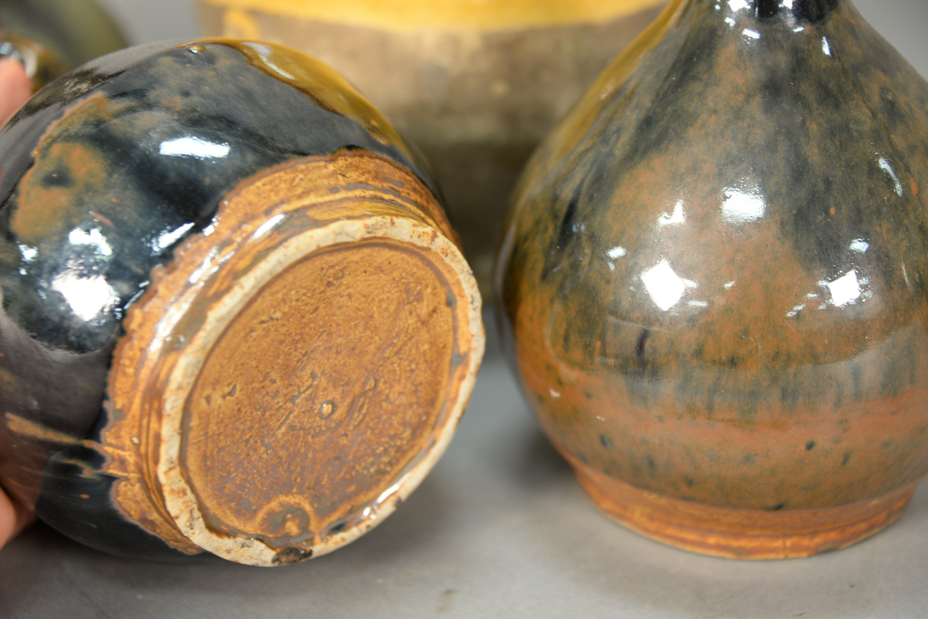 Group of five glazed vases including a pair of Chinese small globular vases with molded dragons, a pair of dark brown glazed vases, and a yellow glazed pottery jar with handles. ht. 6 1/4 in. ht. 6 1/4 in. ht. 7 1/4 in. ht. 7 3/4 in.