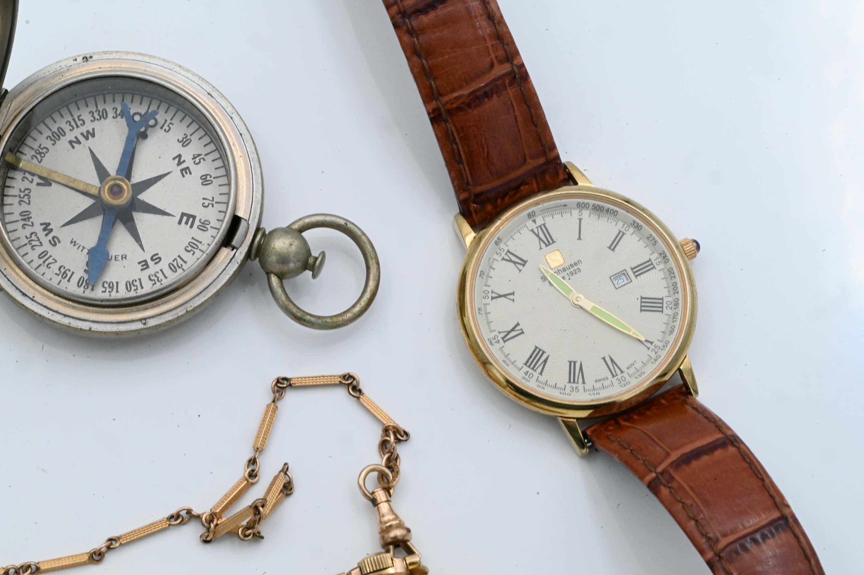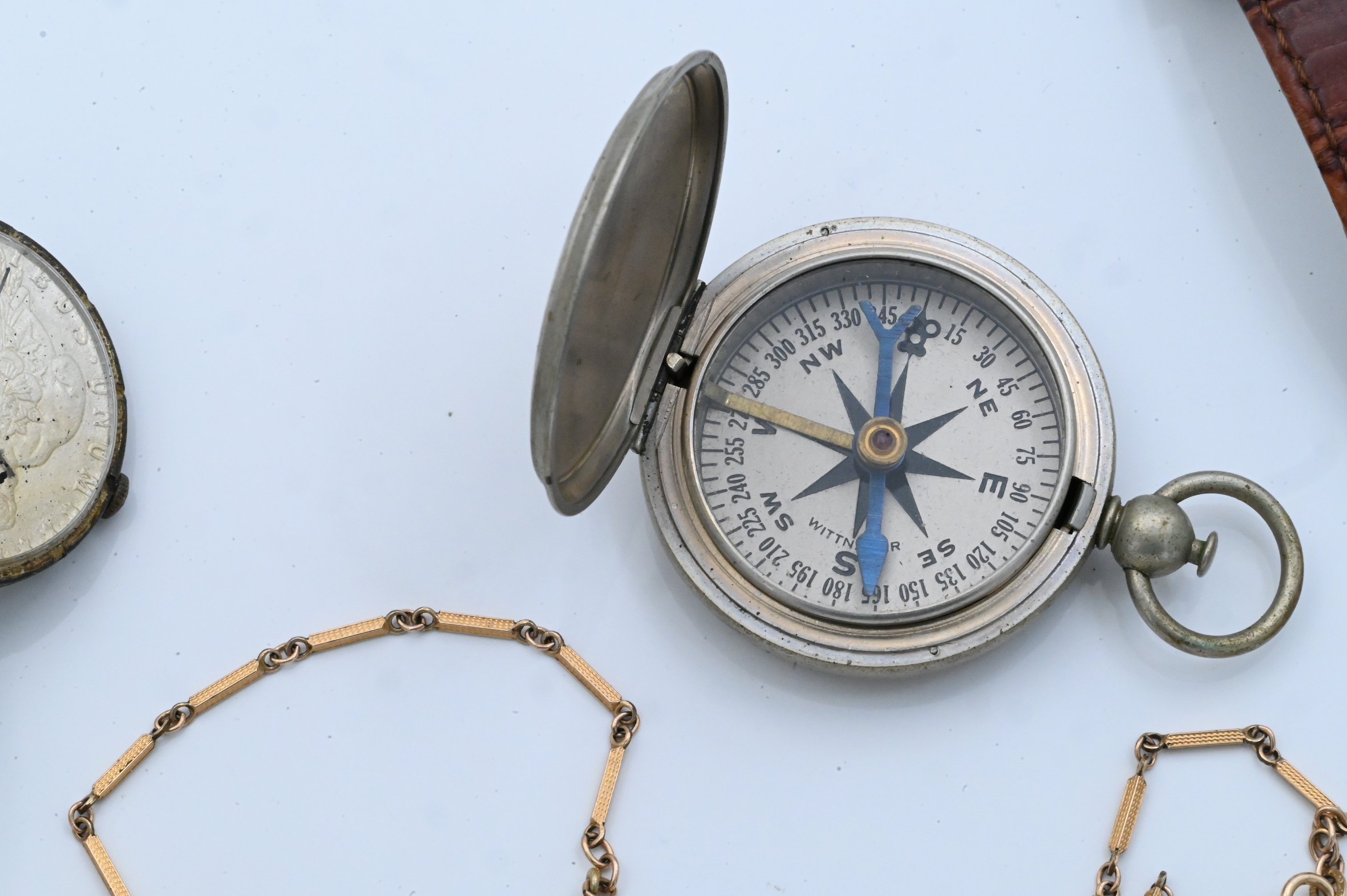 Including examples by Tiffany & Co., Bulova, Schaumburg Watch Co., and others, together with a military “U.S.” pocket compass; various metals