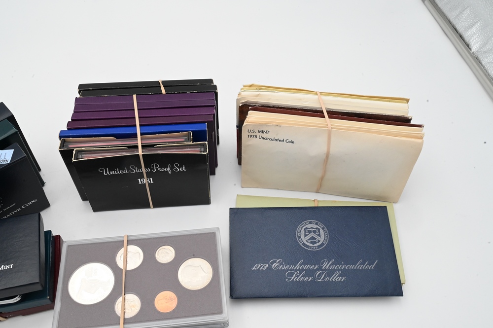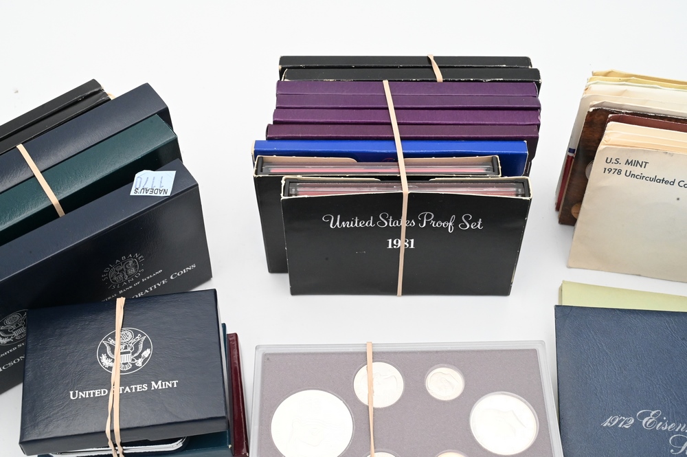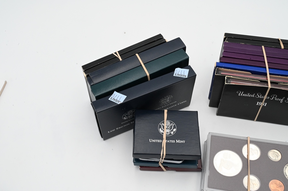 Large Lot of Coins, to include two 1979 Susan B. Anthony souvenir sets P-D-S; one 1980 Susan B. Anthony souvenir sets P-D-S; 1972 Blue Ike one dollar; 1983 Olympic proof set (missing box); 1984 Olympic proof set (missing box); 1986 Statue of Liberty set (missing box); 1987 Constitution set (missing box); 1990 Eisenhower set (missing box); run of US mint sets to include one 1978 incomplete, one 1979 incomplete, three 1981 complete, one 1984, one 1985, one 1986, one 1987, one 1988, one 1989, two 1990’s; one George Washington proof silver half-dollar set; one George Washington uncirculated silver half-dollar set; one 2000 proof Leif Erickson silver set; one 2000 uncirculated Leif Ericson silver dollar set (incomplete); two Leif Erickson US commemorative coin sets in blue boxes complete with box and papers, original government issue containing one dollar silver proof, one silver Kronur; one 1990 Green US proof sets in original government issue boxes ito include two 1978, two 1979 type II with damaged cases; one 1981; one 1982; one 1983; one 1985; one 1987; one 1988; and one 1989.