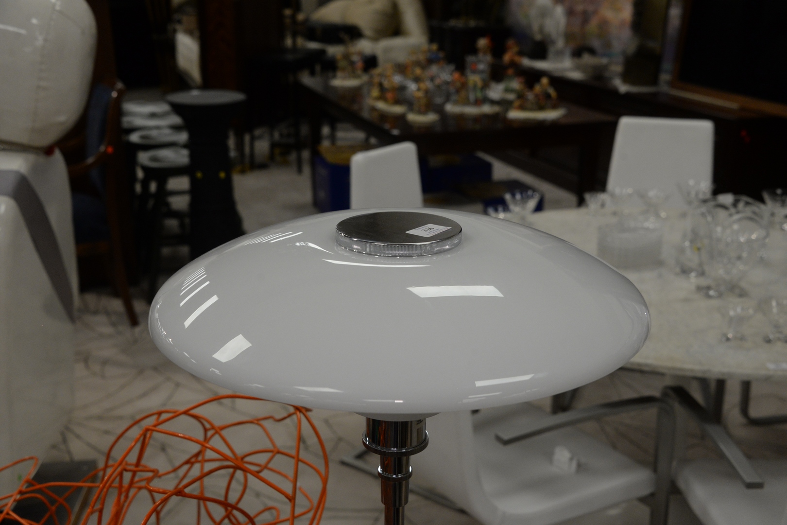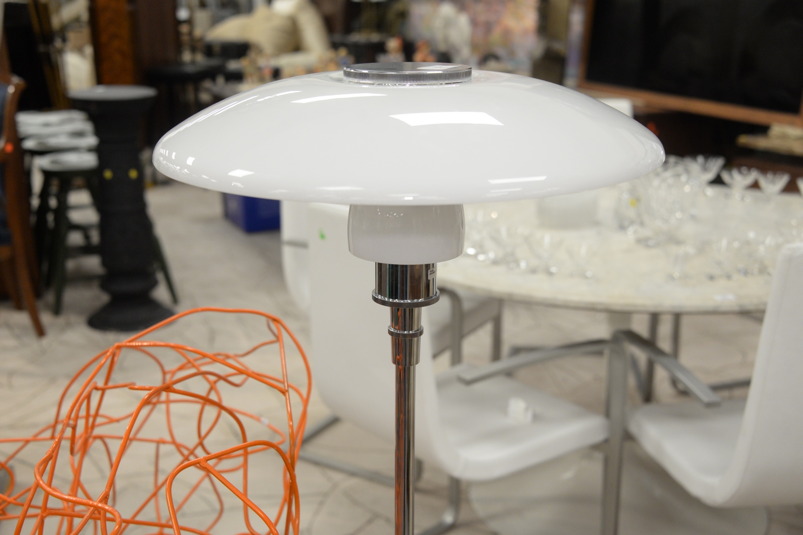 Lot 326: Poul Henningsen Floor Lamp, PH 4.5/3.5 model, having chrome shaft with glass shade, $3,628 new, height 50 inches.