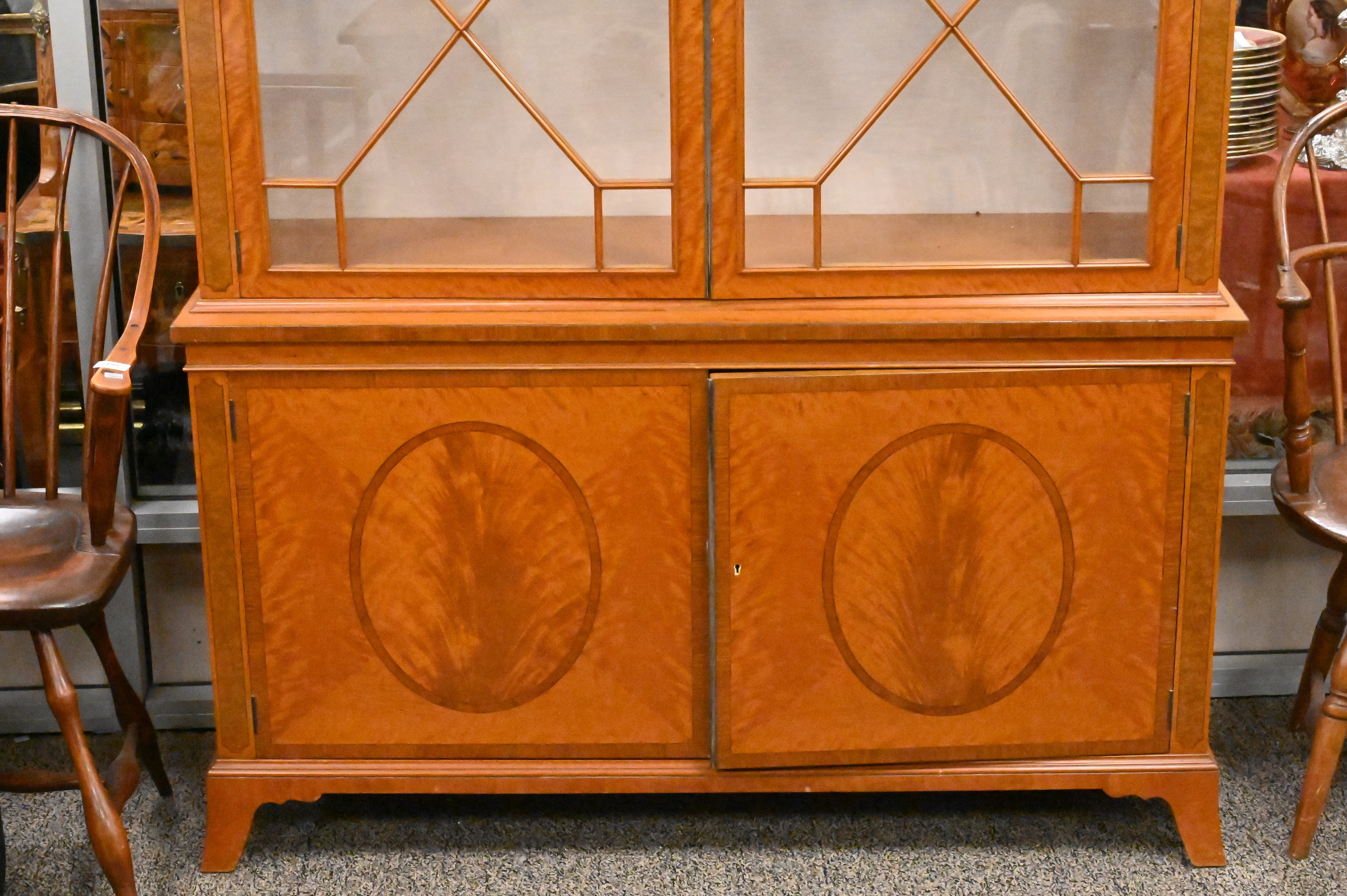 Satin Wood China Cabinet, with open work carved top over two glazed doors over two doors with inlaid panels, height 84 inches, width 49 1/2 inches and one shelf, depth 16 1/4 inches.