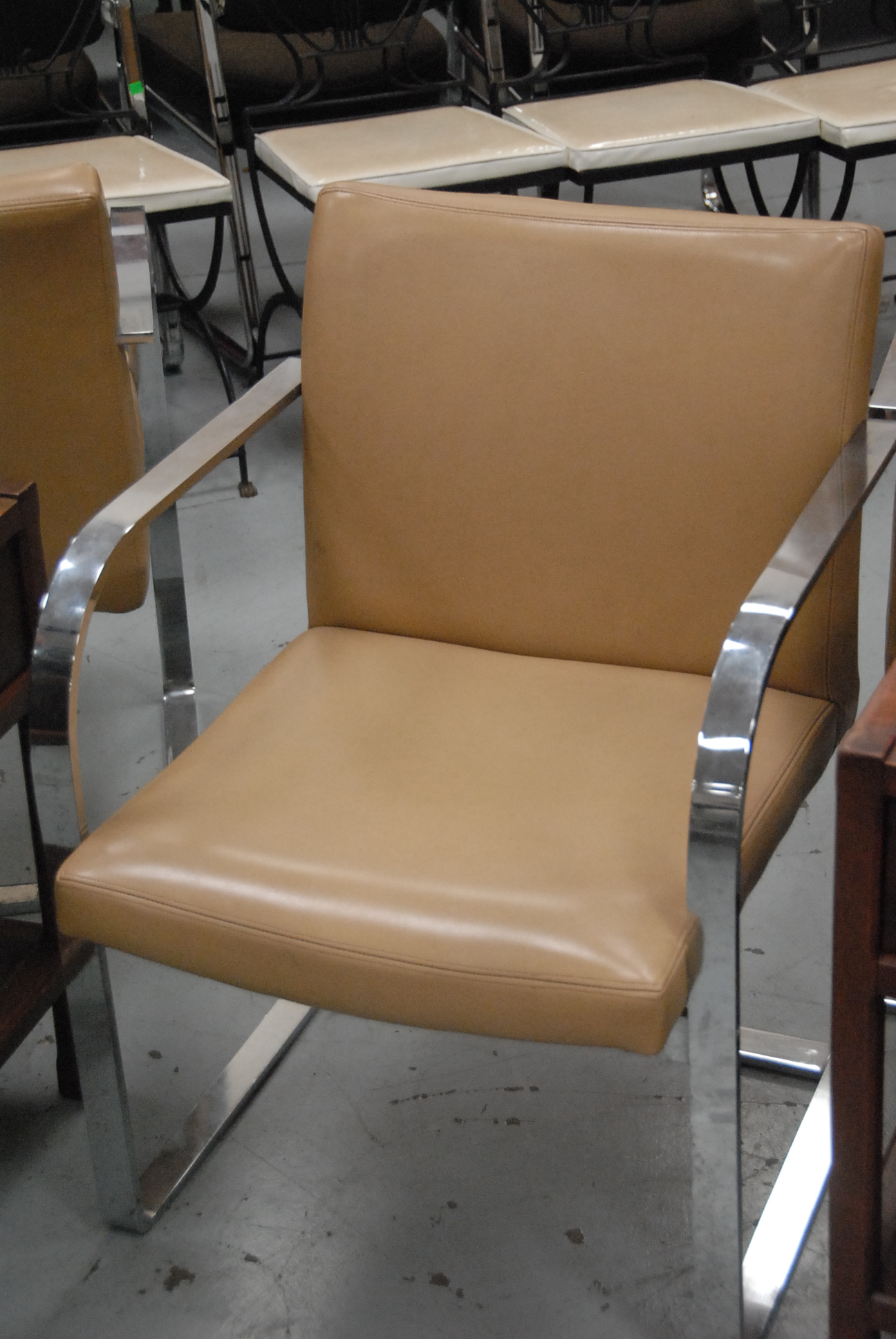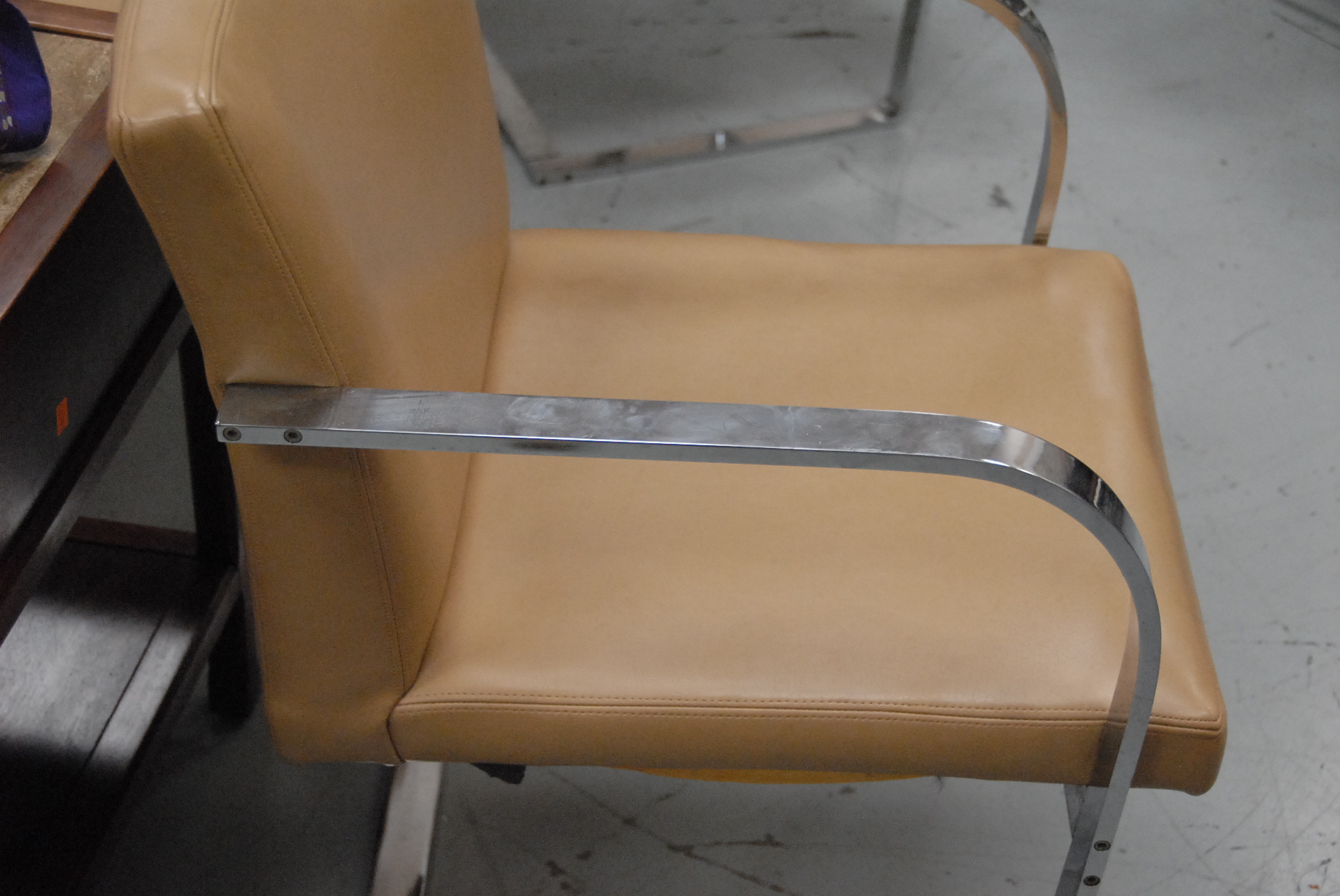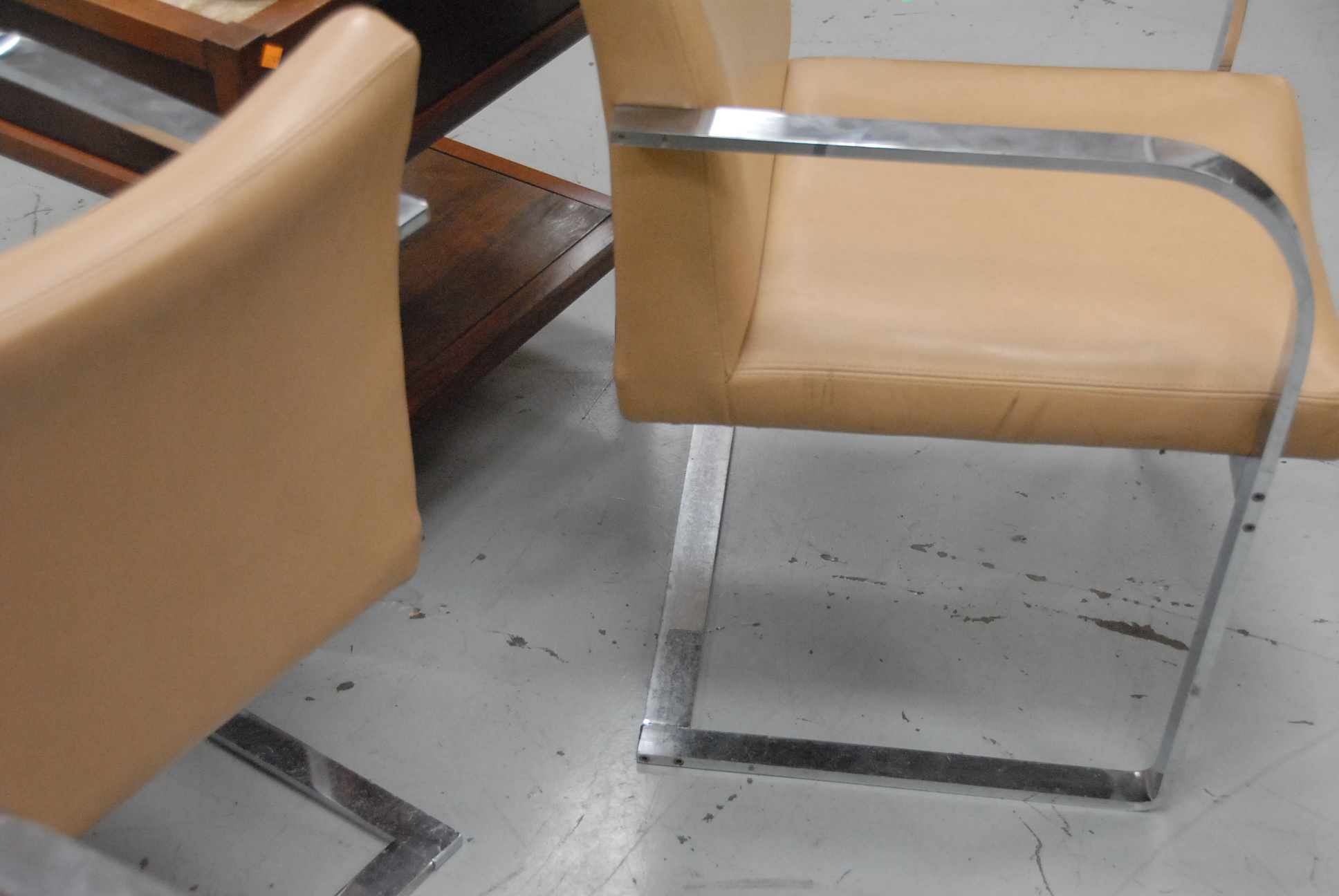 Set of three Mies van der Rohe style flat chrome armchairs with tan leather upholstery.