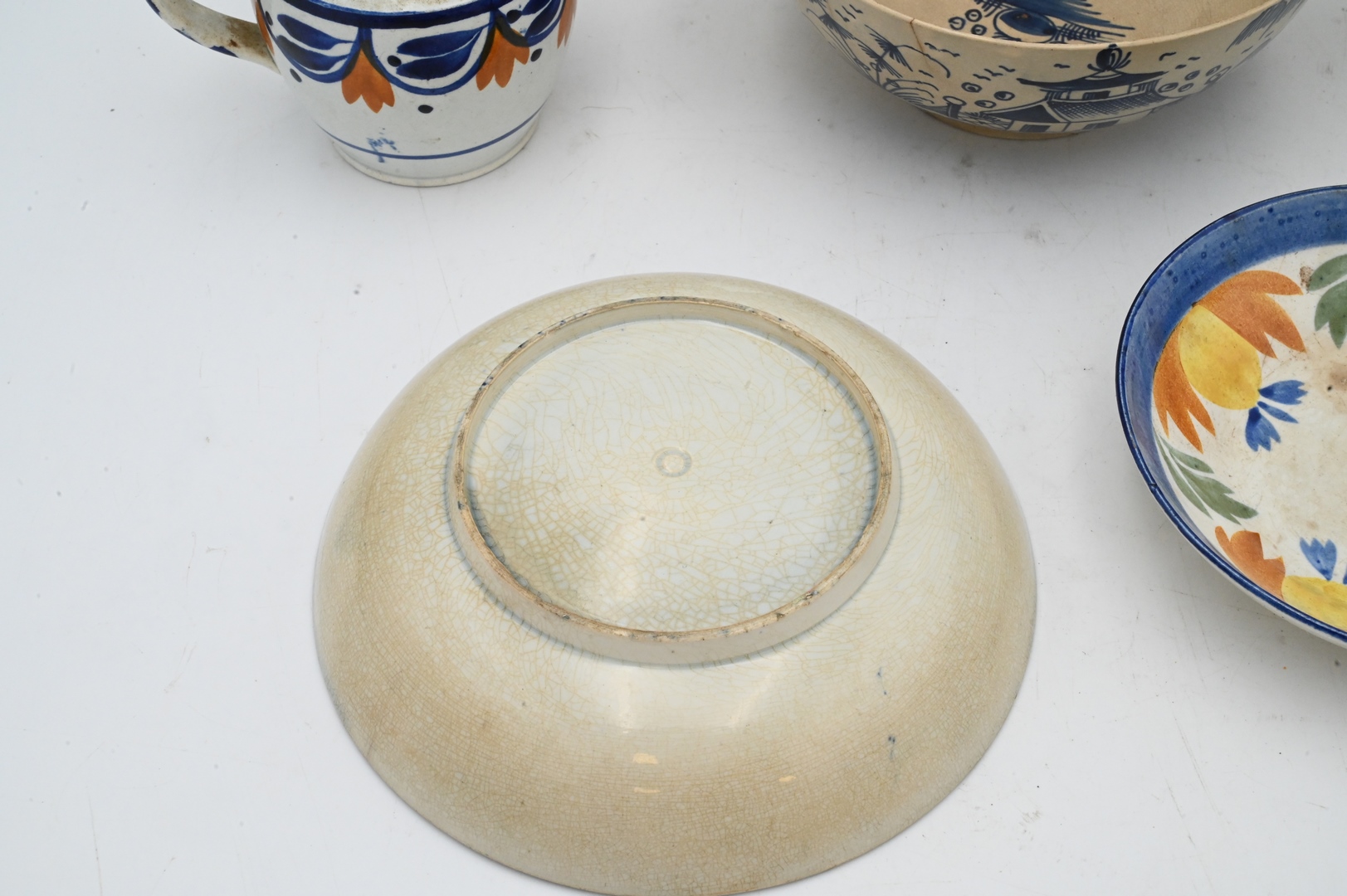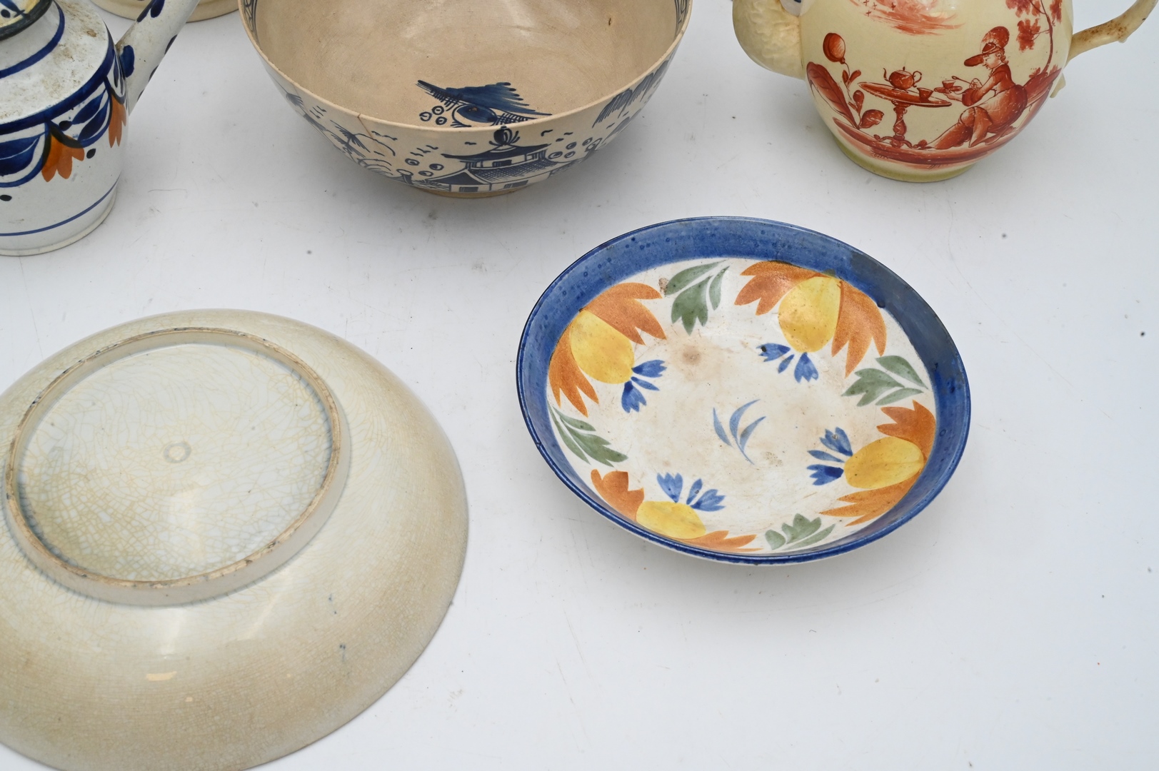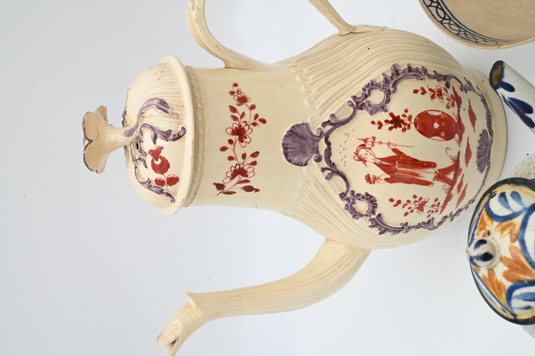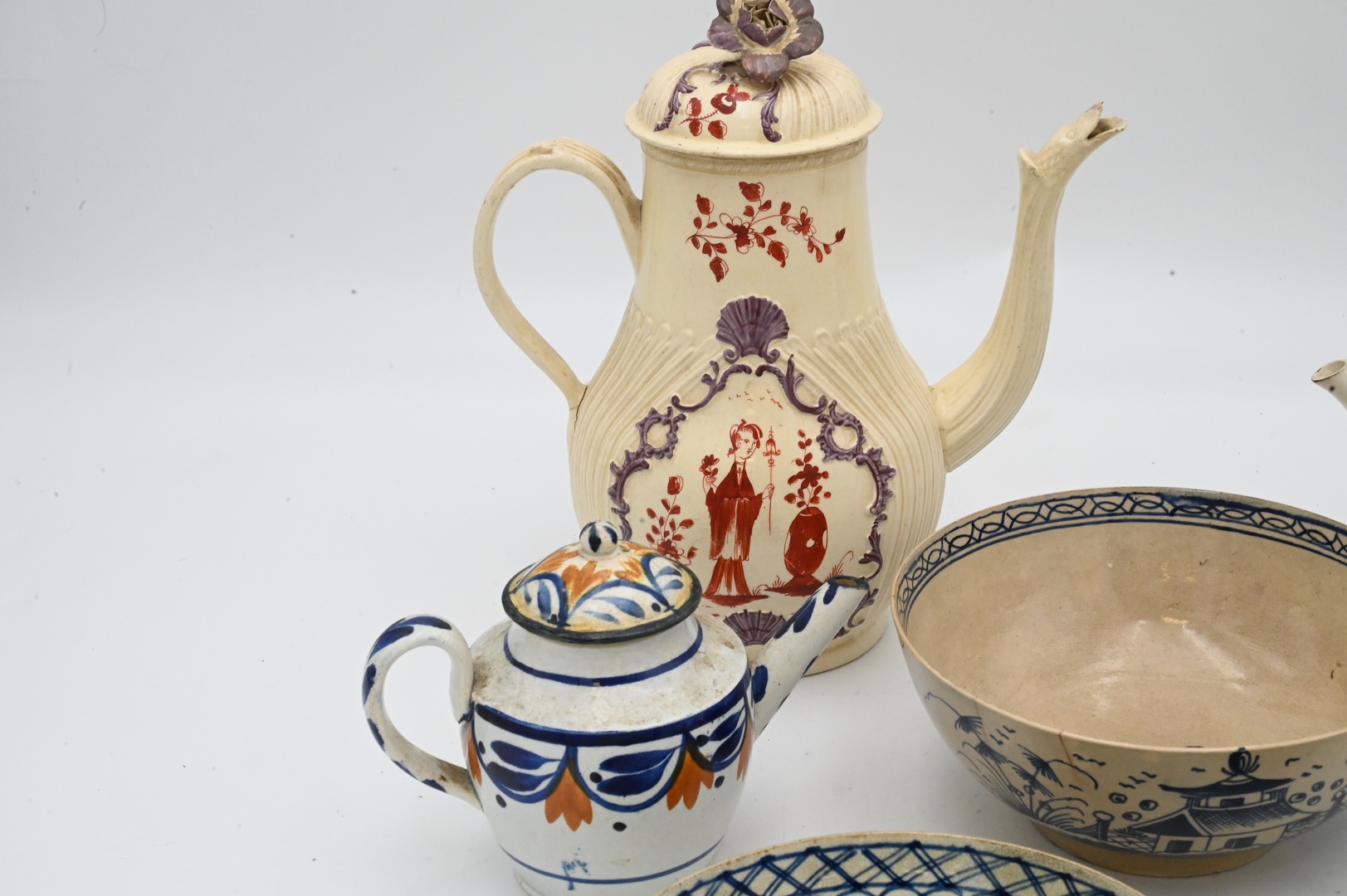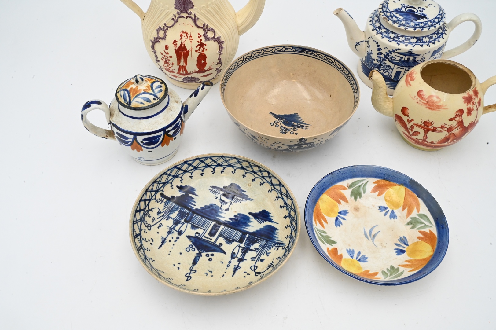 Seven Piece Group of Soft Paste Teapots and Assorted Porcelain, to include large Leed’s coffee pot with painted Asian scene, repaired flower finial; a Gaudy Dutch softpaste small teapot, repaired cover, chipped spout, crack on handle, chip on rim; a small Leed’s teapot having interior figural scene, chips to rim and spout, bottom and body, (repaired); a blue and white bowl, cracks to rim, chip on foot; a blue and white porcelain plate; along with a blue and white porcelain teapot, chipped cover and spout; along with a Dutch saucer, tallest height is 9 inches.
