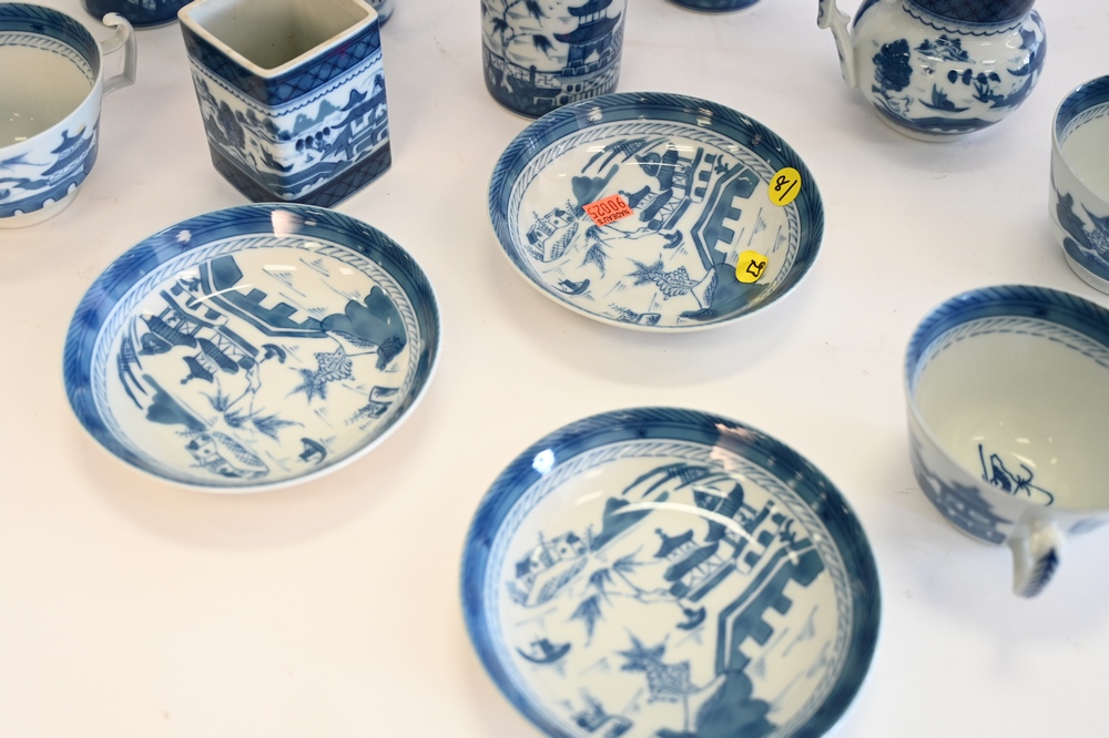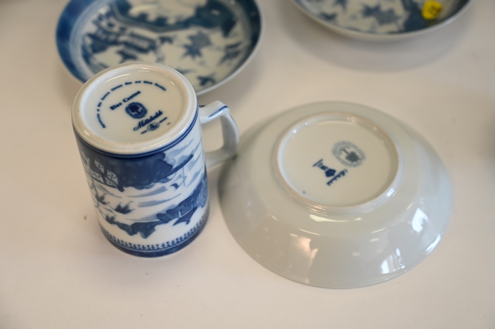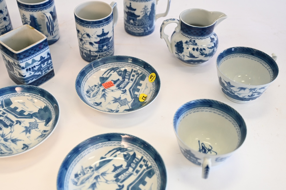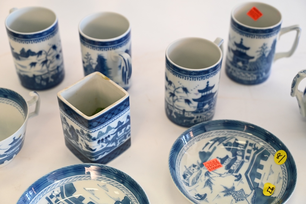 Twelve Piece Mottahedeh Blue Canton China, to include seven cups in two sizes, three saucer, and a creamer, tallest cup height 4 1/2…
