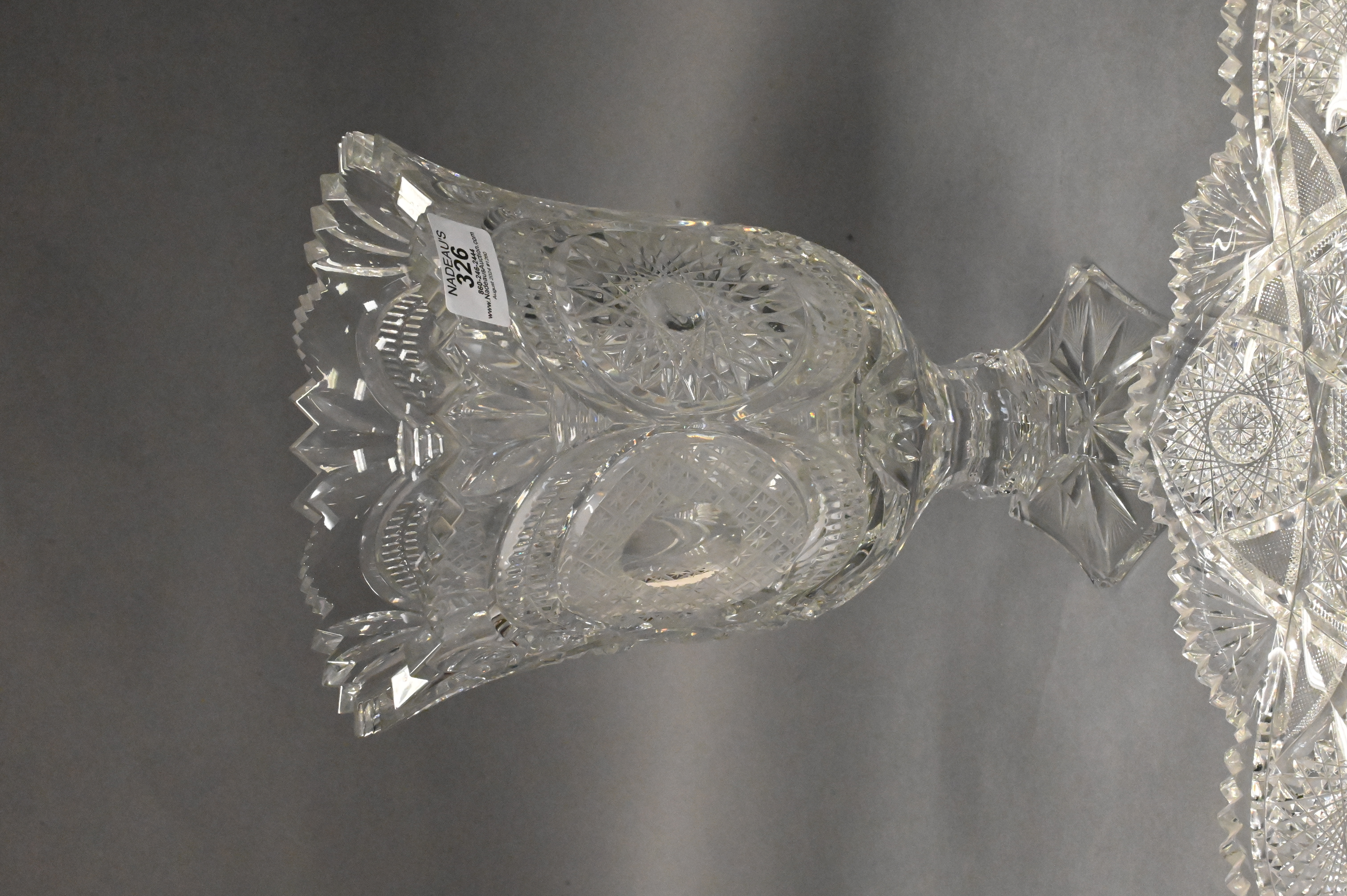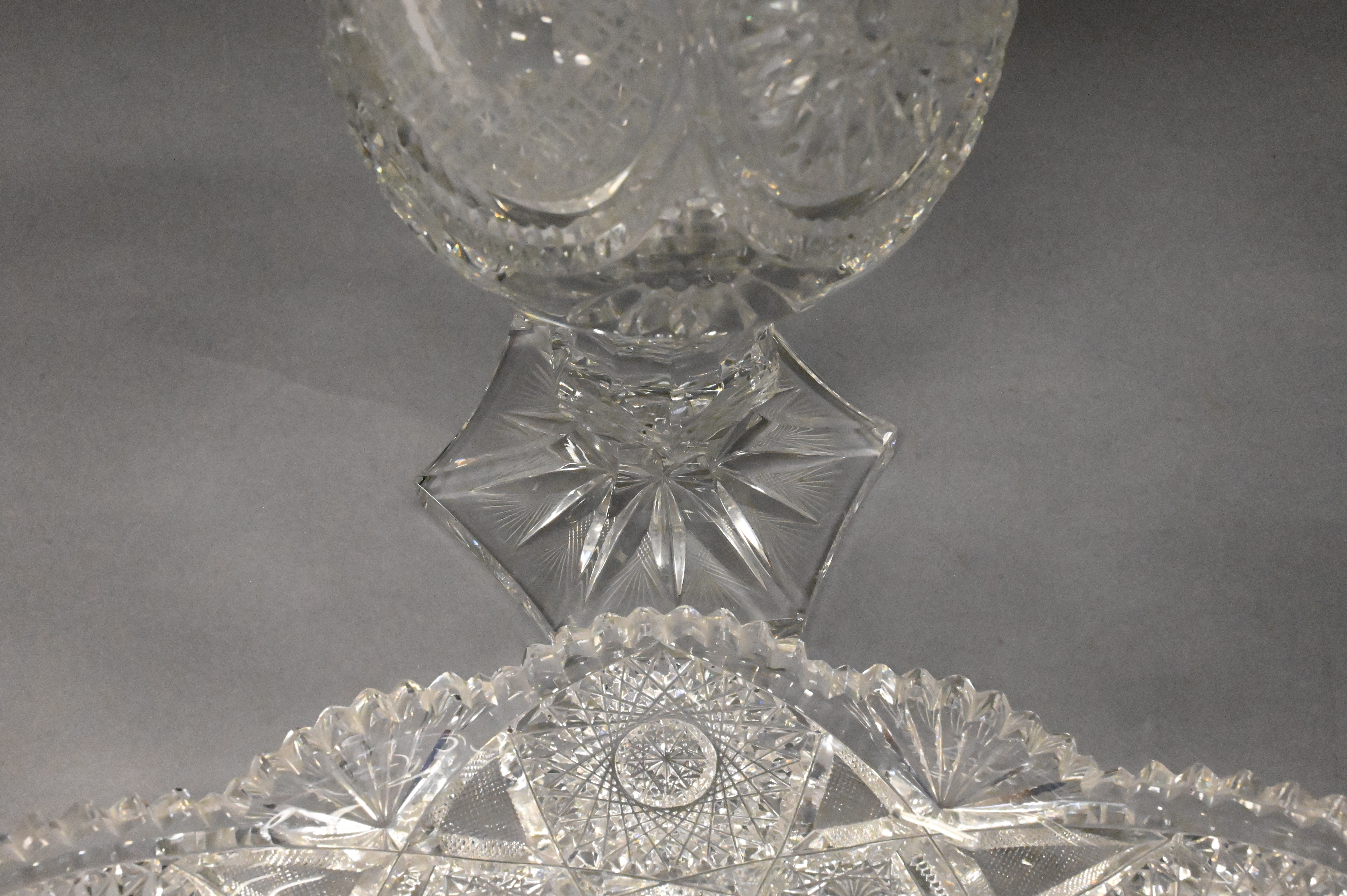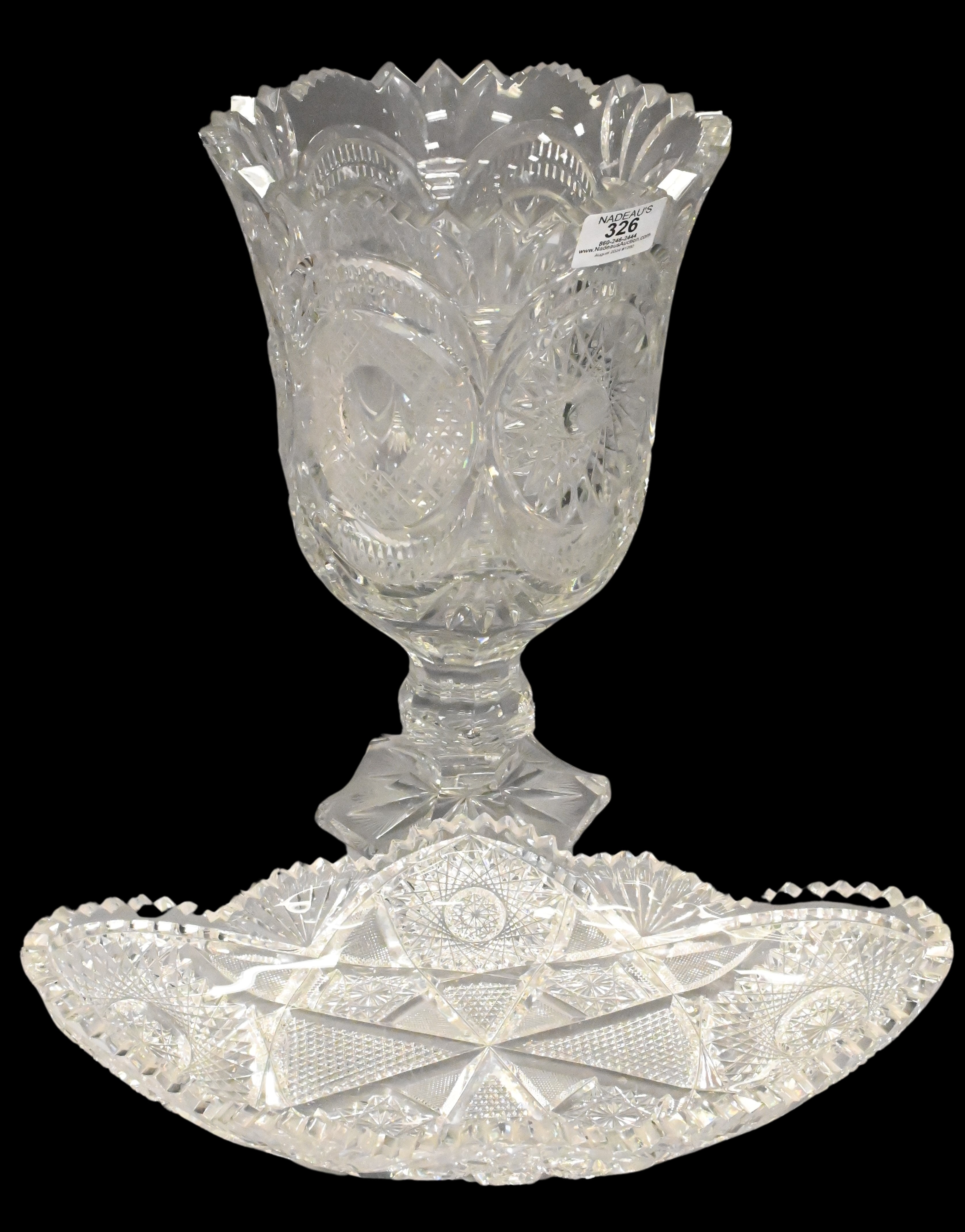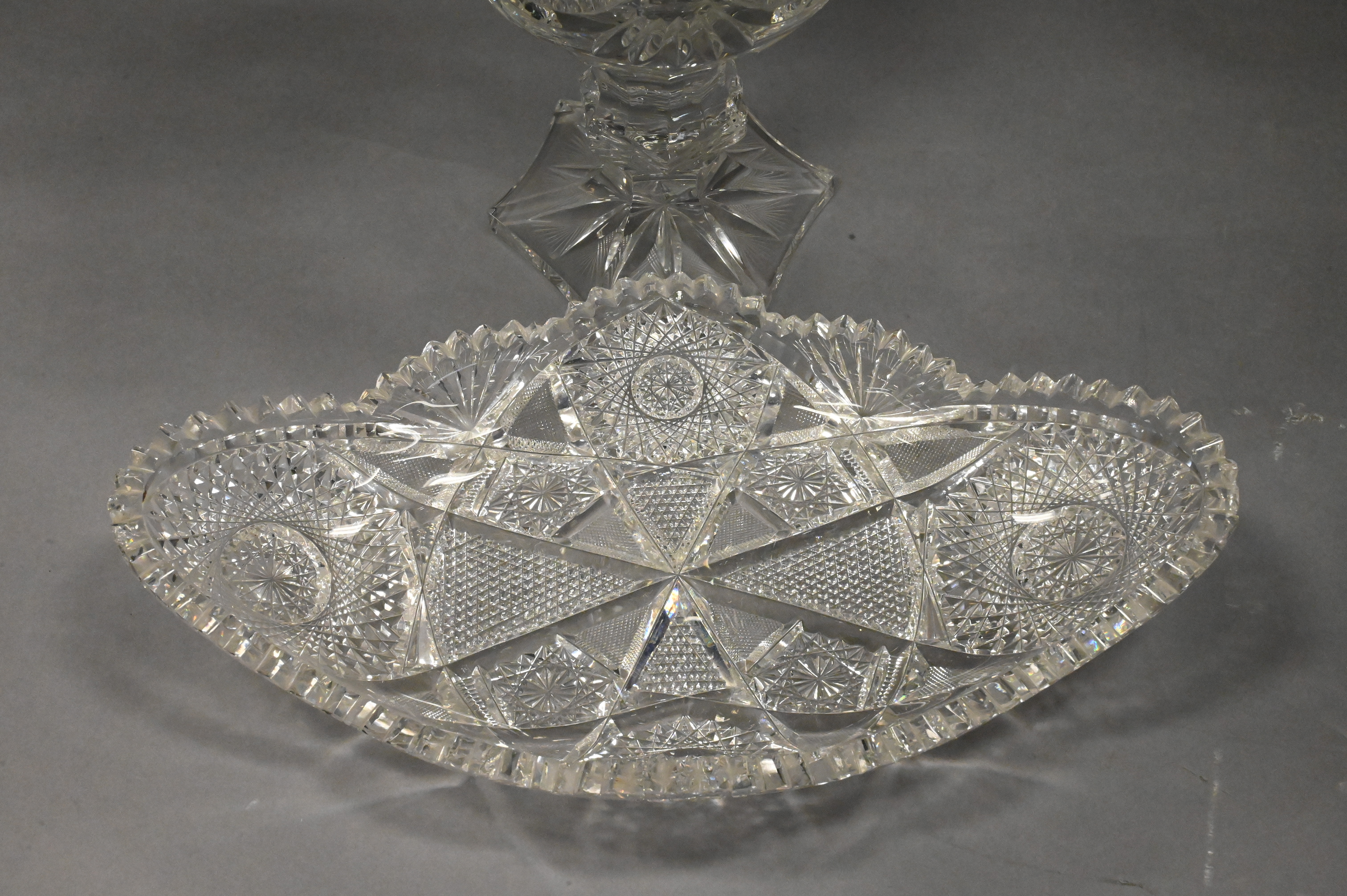 elongated pie dish and etched glass center vase set on pedestal base and hexagonal foot
