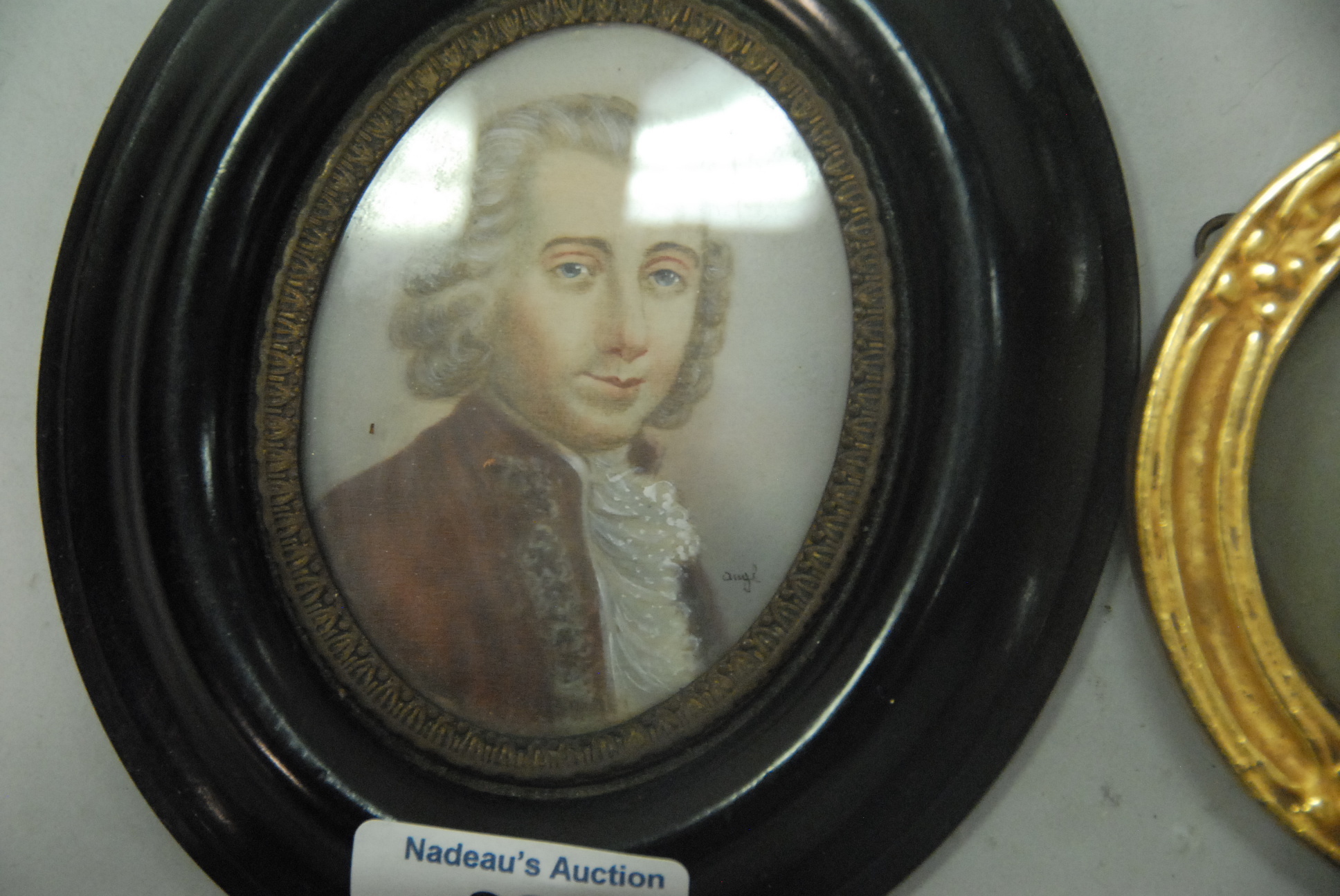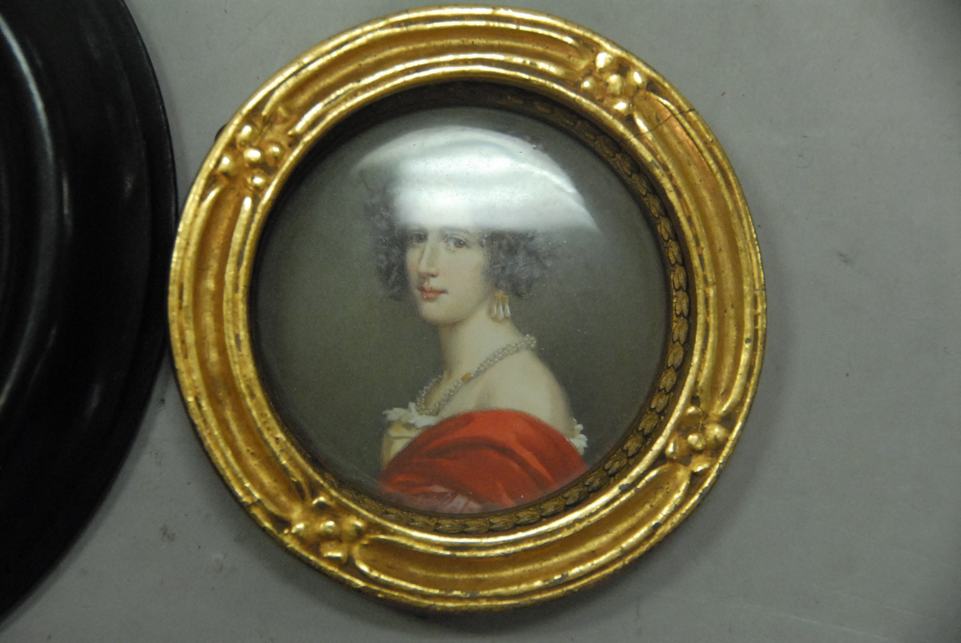 Two early miniature paintings, one round of woman in red dress, one on ivory of gentleman.