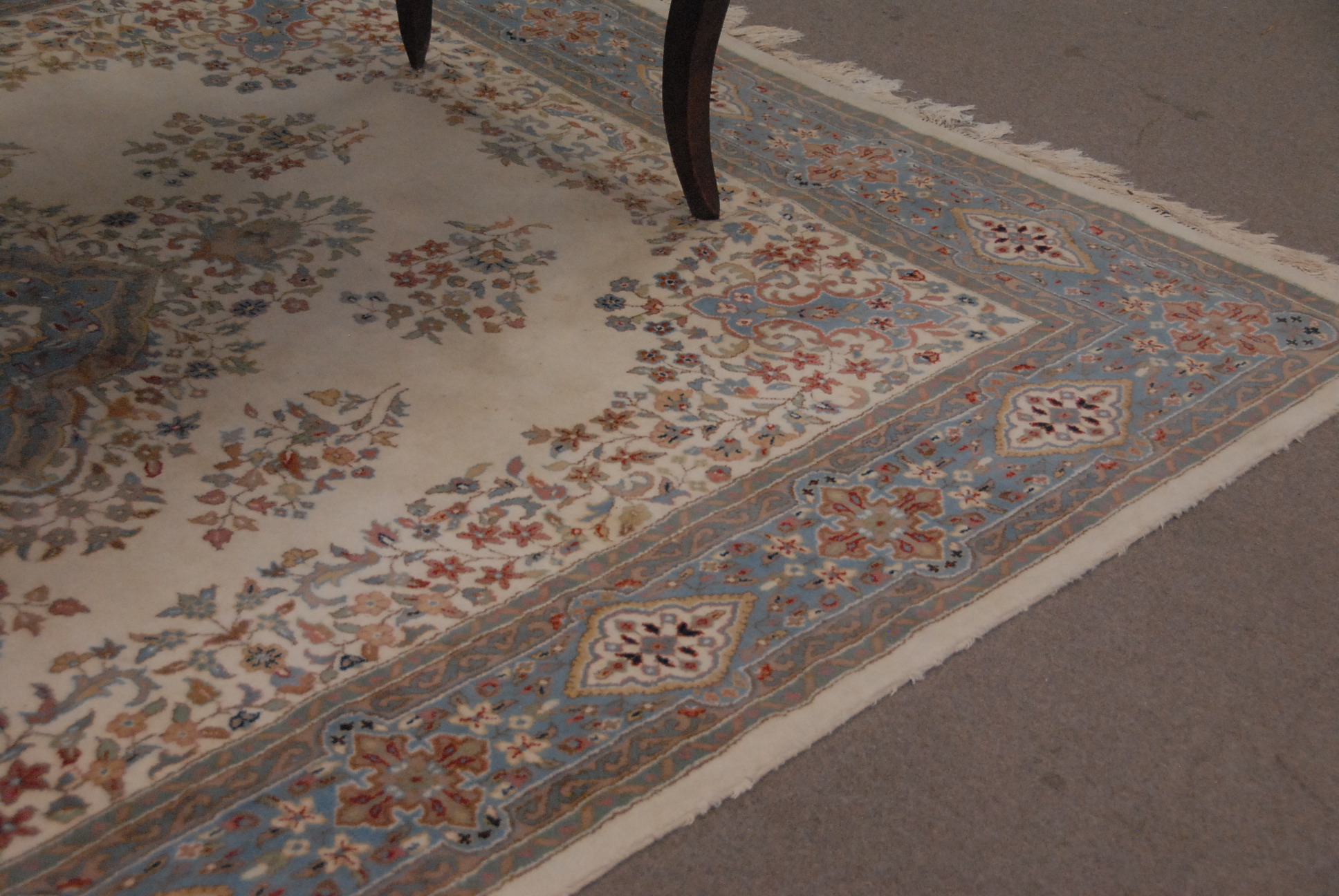 White and blue Oriental room size rug, 7’11 x 10’2.