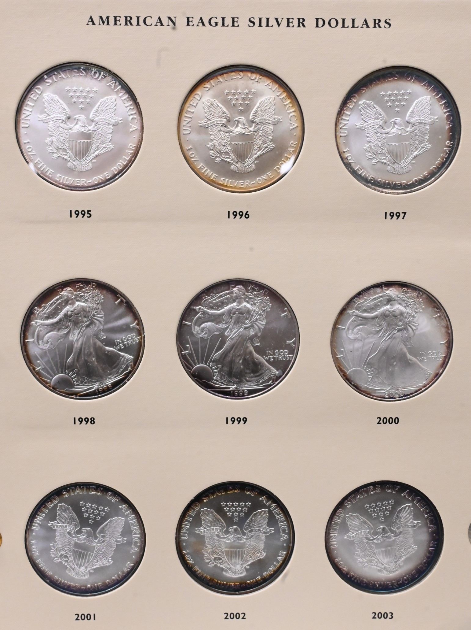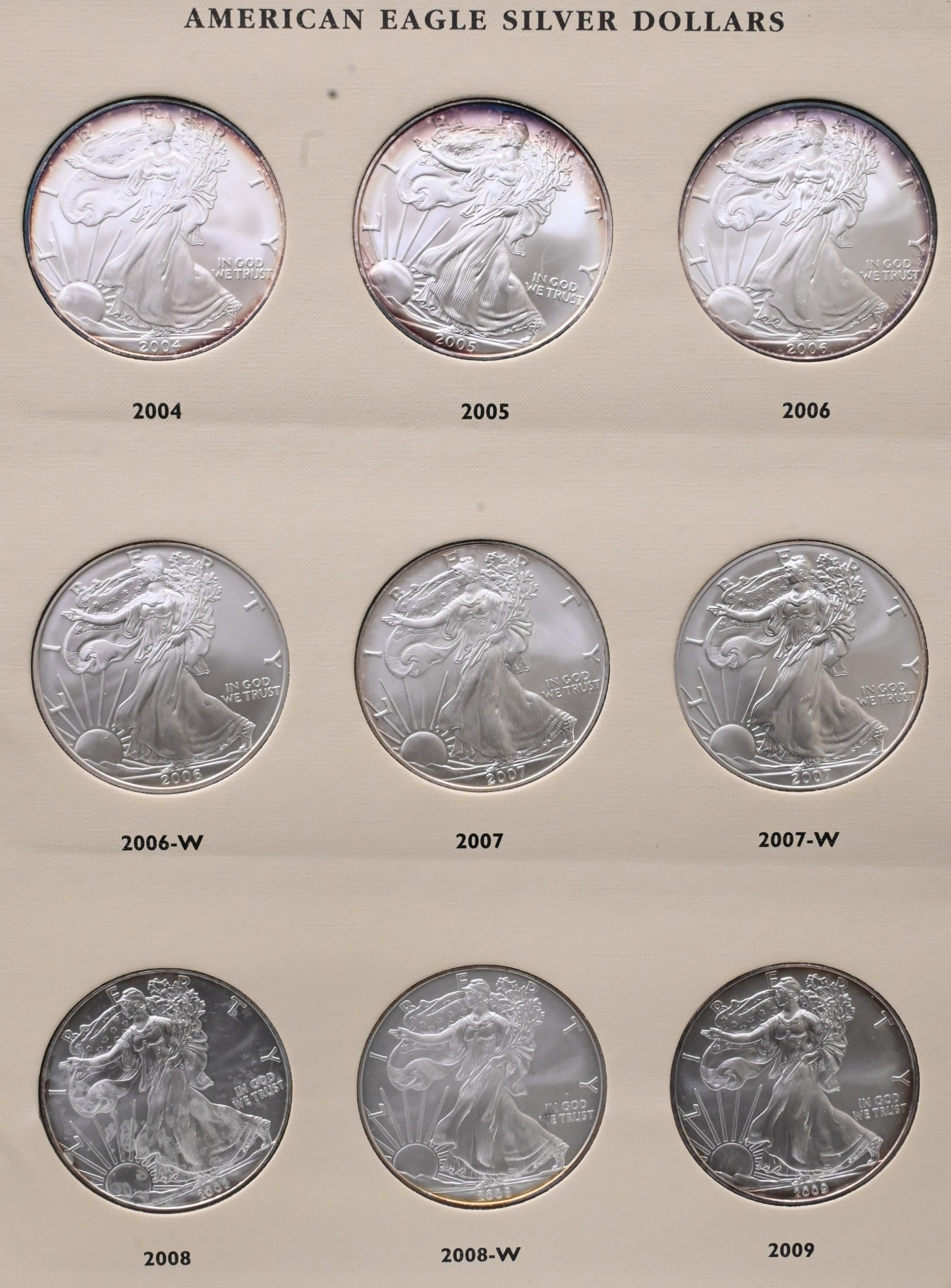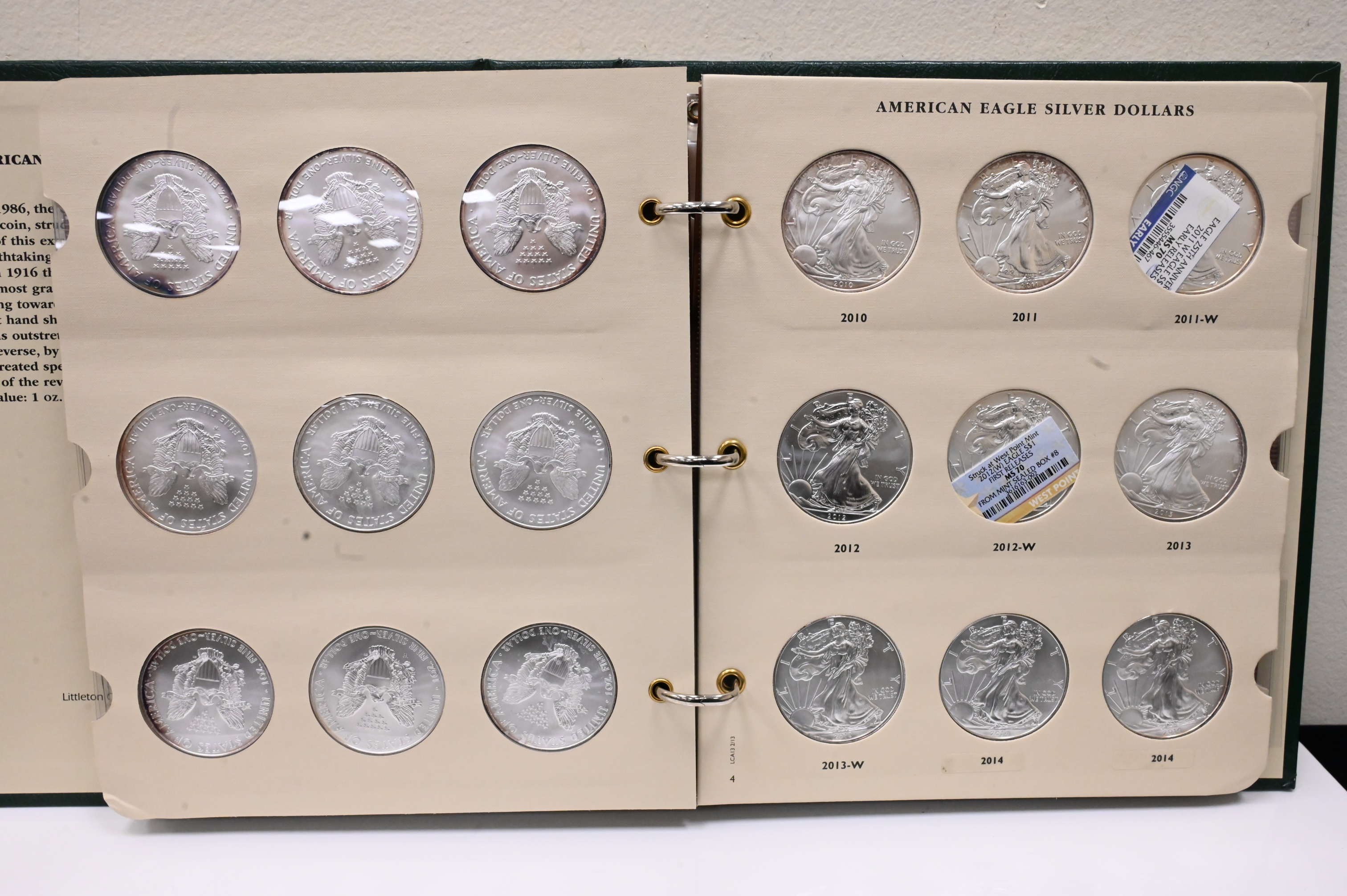 38 Piece Album of American Silver Eagle Dollars, all brilliant uncirculated from 1986 – 2016