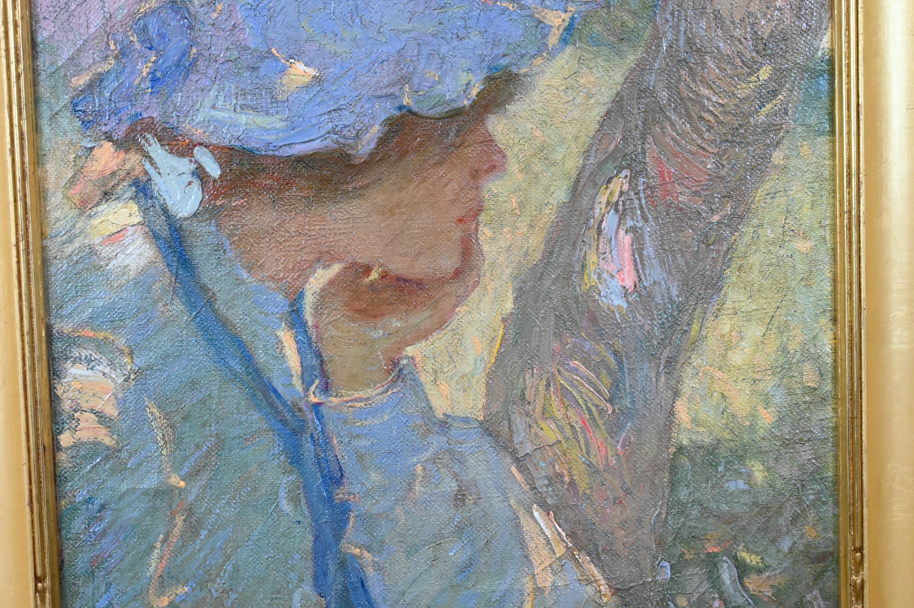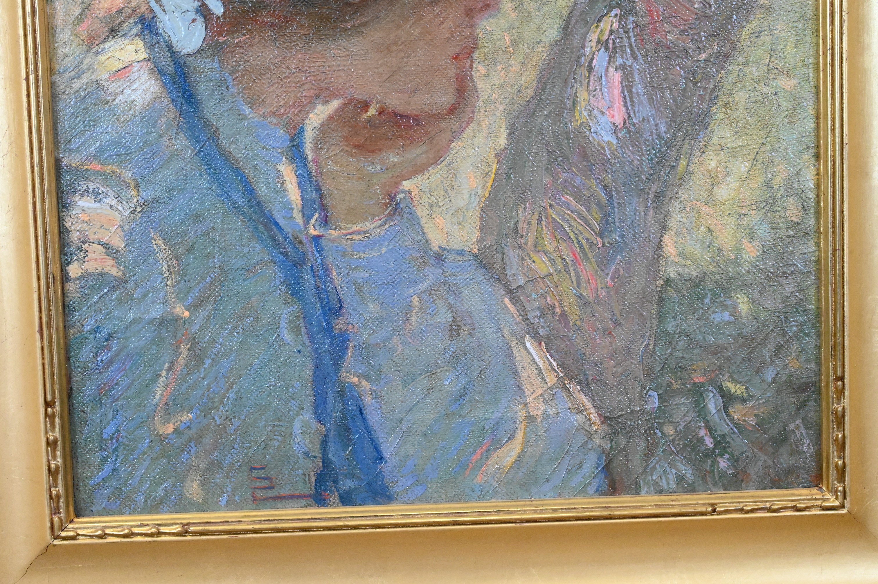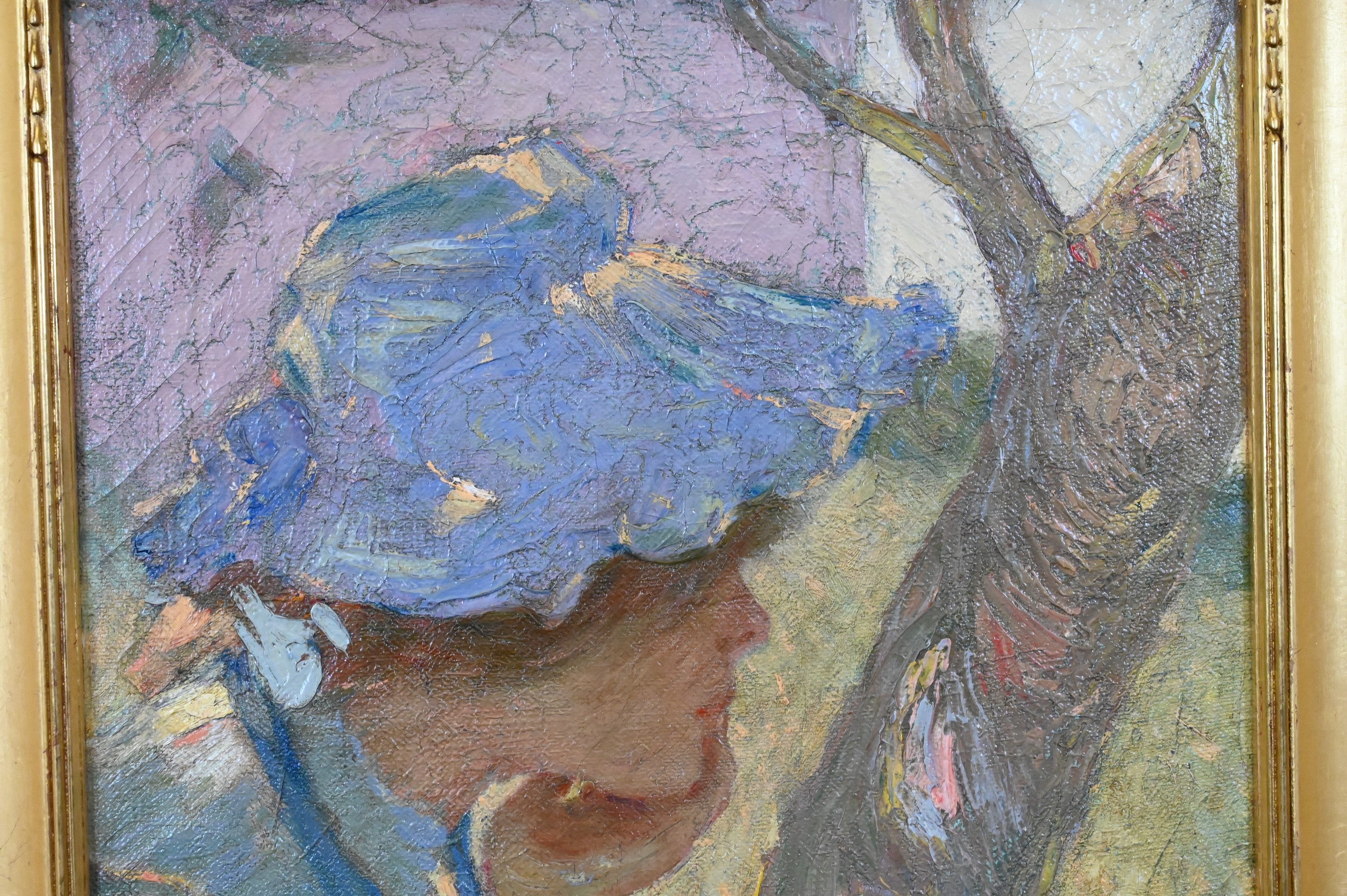 Vibrant Impressionist portrait of a woman in a broad blue sunhat, captured in profile beside a tree in a sunlit outdoor setting, painted with broken impasto and shimmering color, the work displays layered strokes of blue, violet, and rose against a soft green background