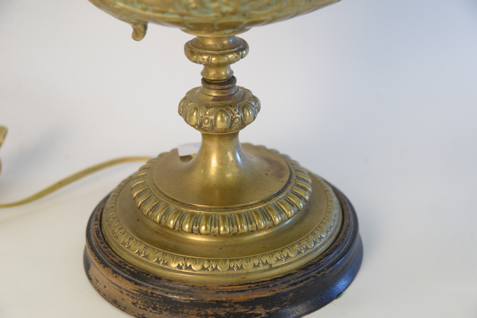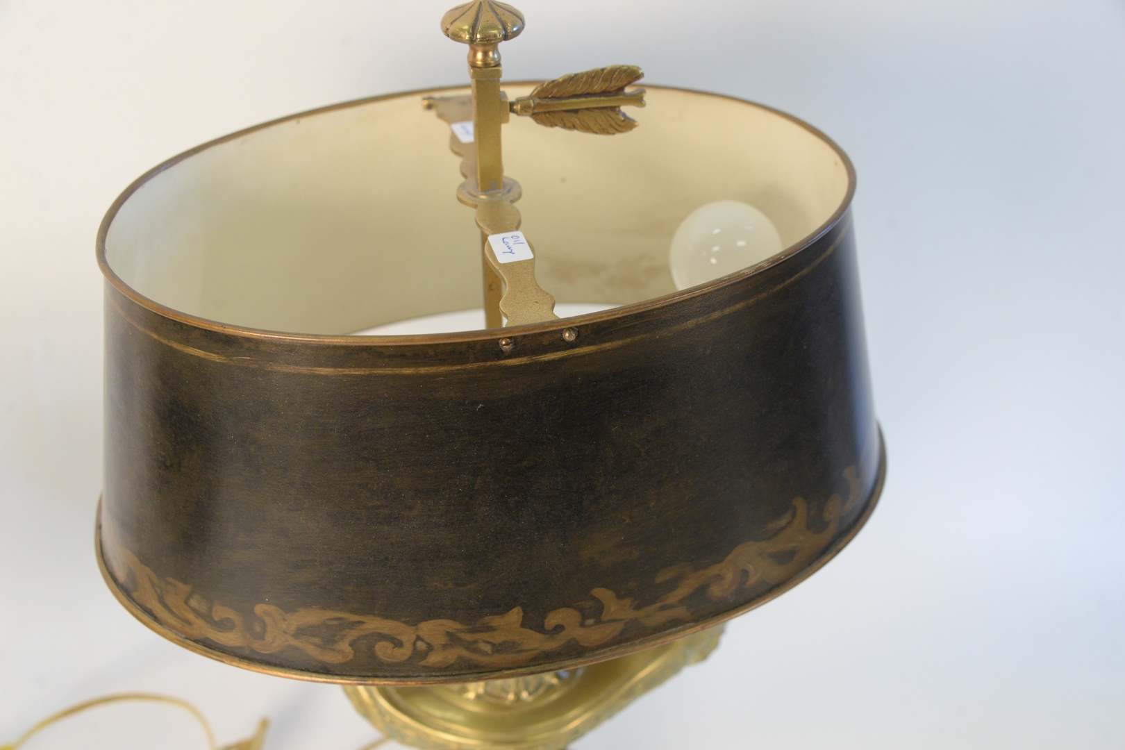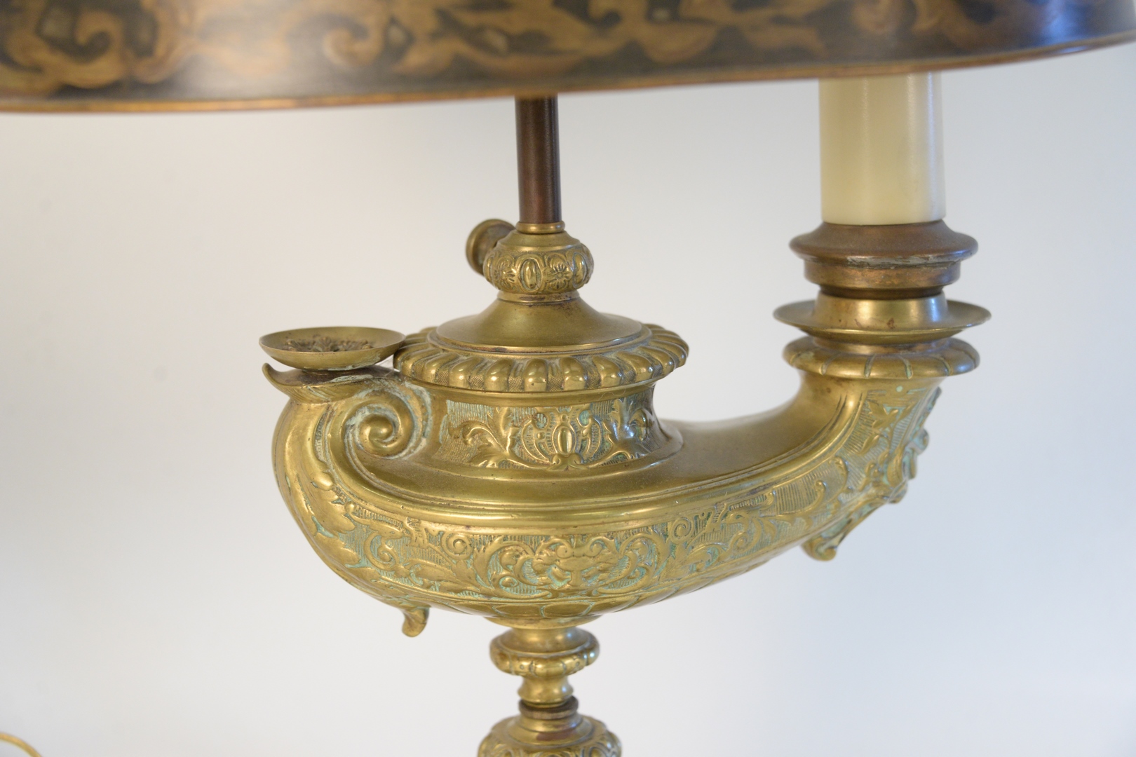 Brass Electrified Oil Lamp, with one light and tole shade, height 22 inches.