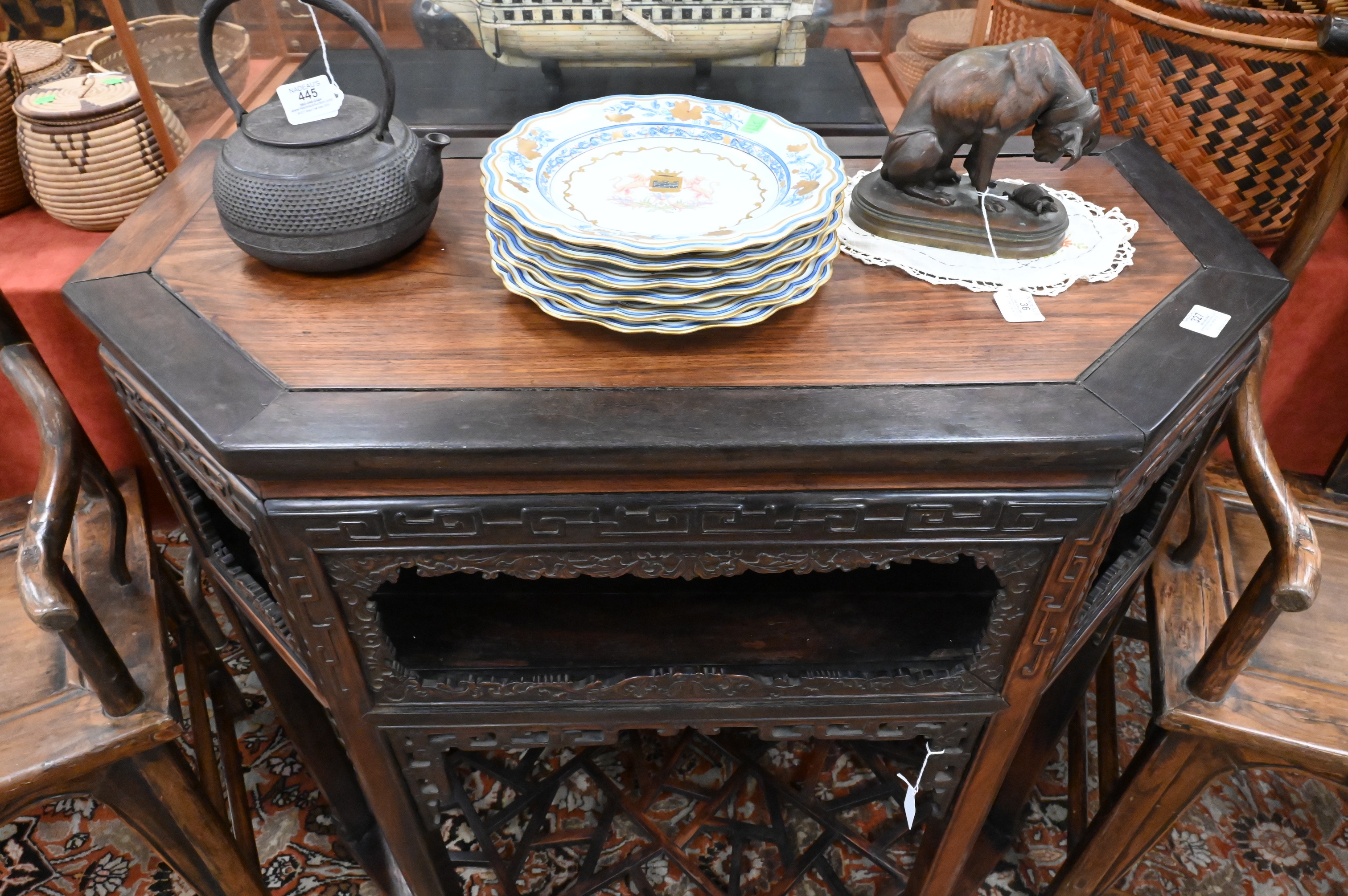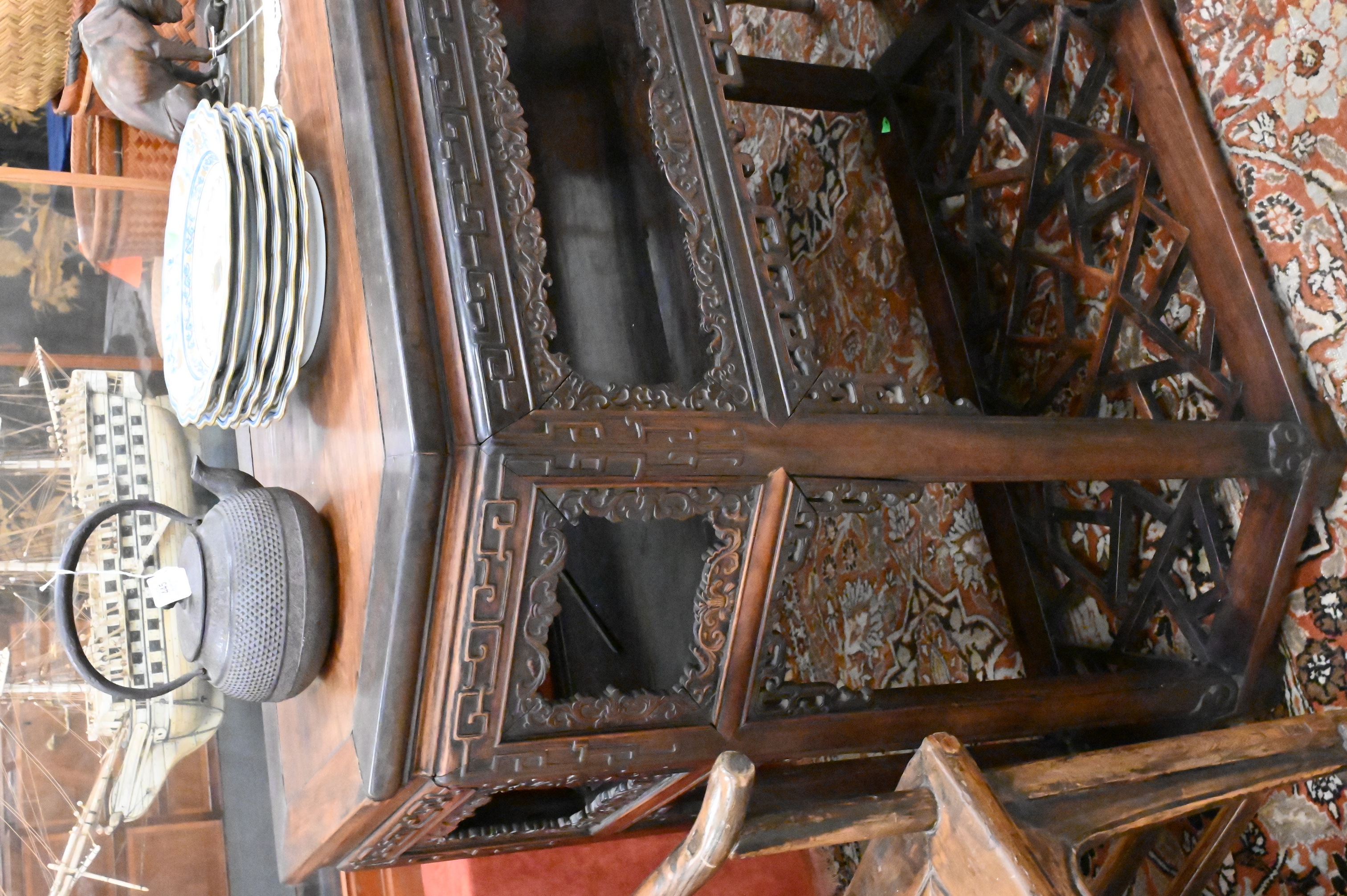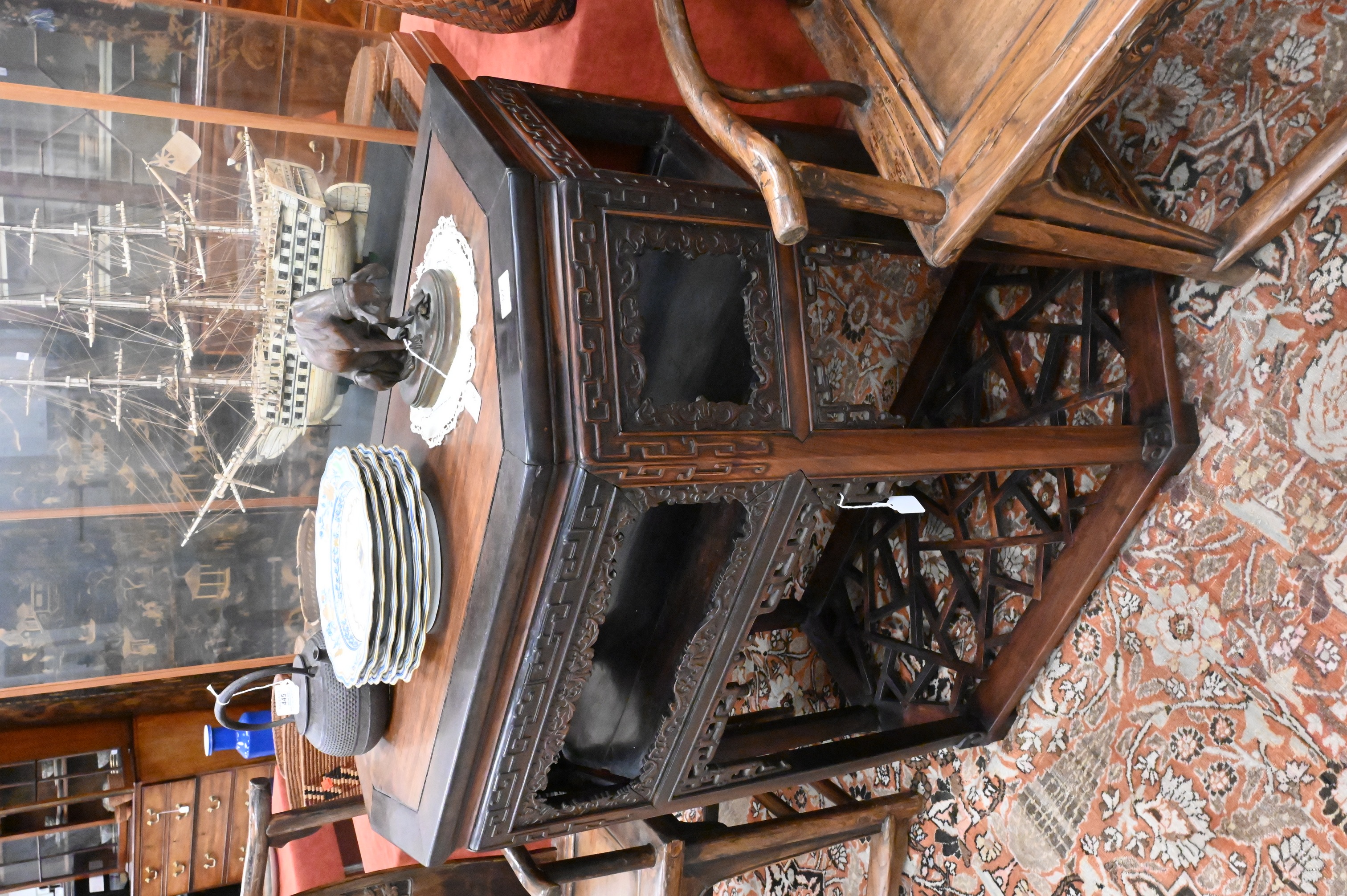 The rectangular top over a frieze pierced and carved with scrolling foliage and key-fret borders, fitted with an open shelf and raised on square legs joined by an openwork geometric stretcher. Rich dark finish with honest wear.