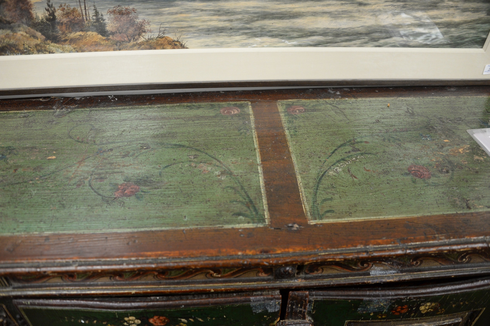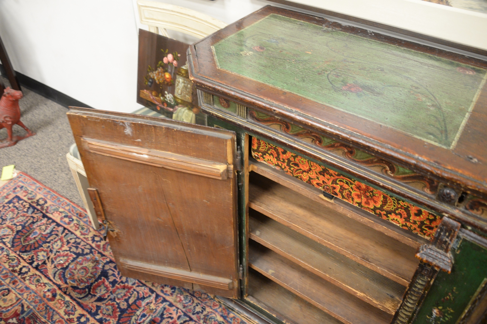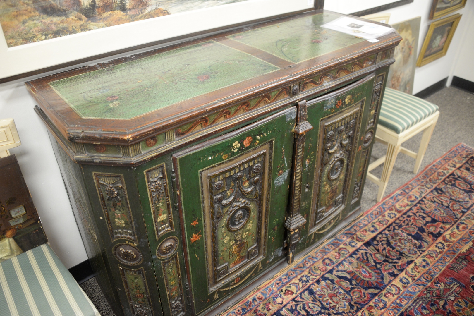 Continental Sideboard having hinged top opening to reveal fitted silverware compartment, over 2 doors opening to drawers and shelves, overall hand painted doors carved with drapes and classical figure heads and painted urns, all set on plain base, 17th Century, height 37 inches, top 18 3/4 x 52 1/2.