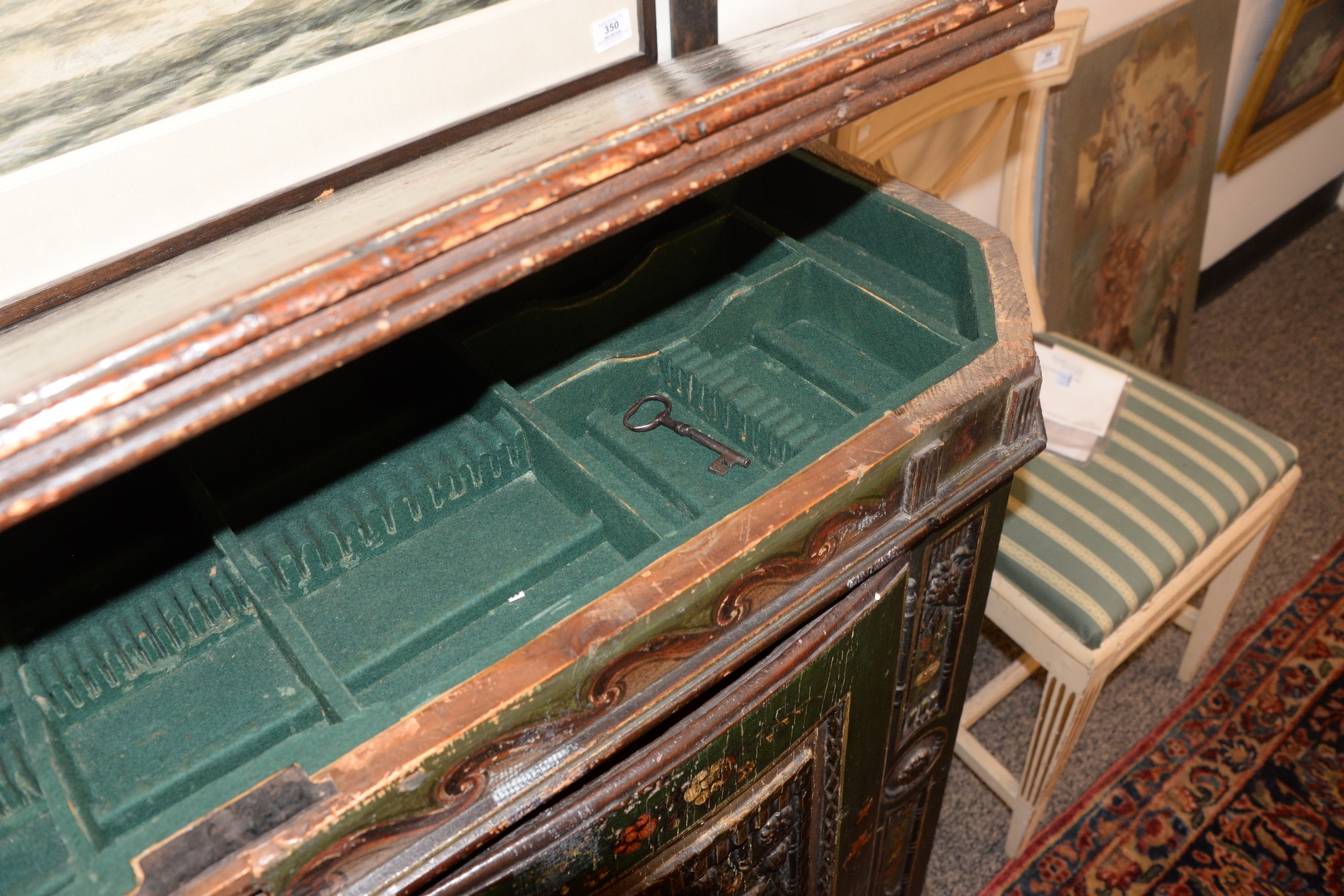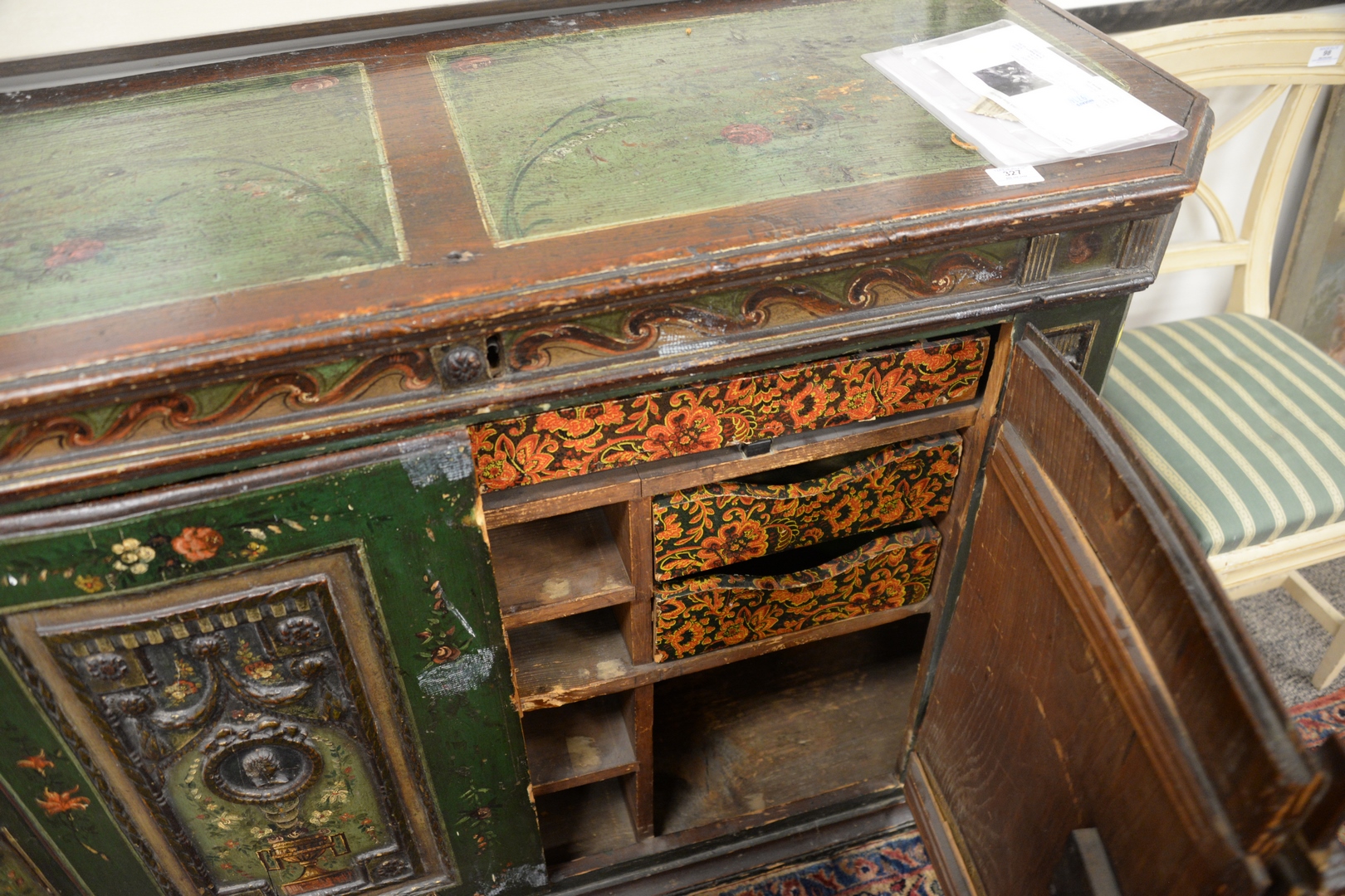 Lot 327: Continental Sideboard having hinged top opening to reveal fitted silverware compartment, over 2 doors opening to drawers and shelves, overall hand painted doors carved with drapes and classical figure heads and painted urns, all set on plain base, 17