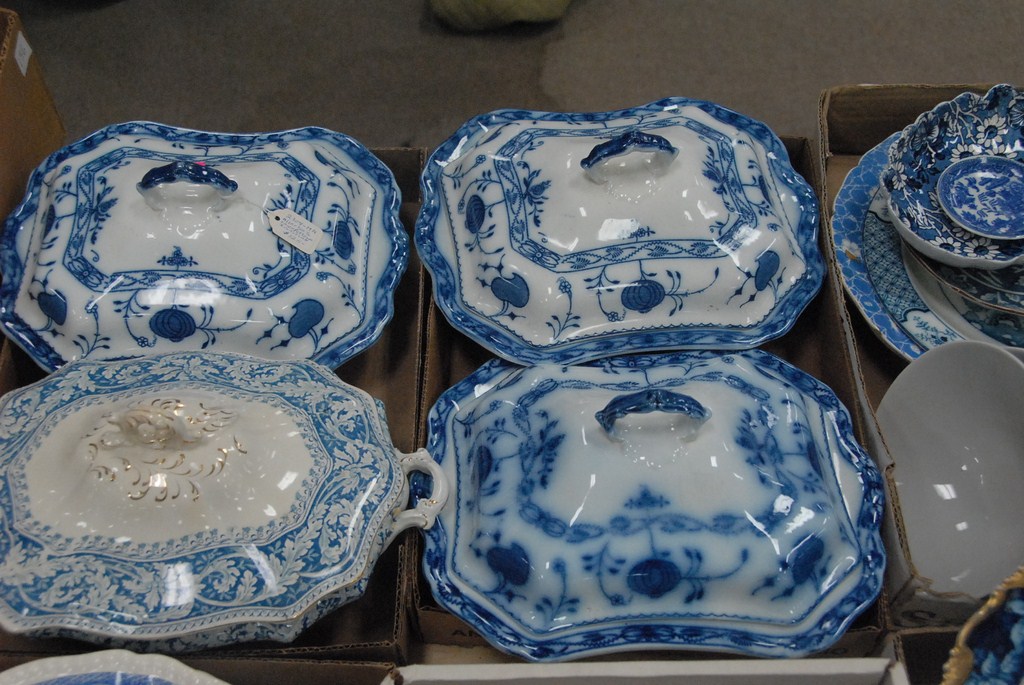 Five box lots five covered dishes, various plates and bowls including blue and white.