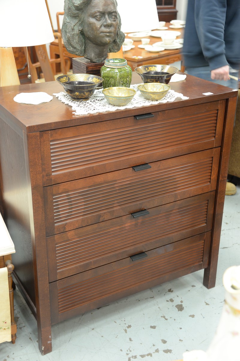 Five piece lot including Crate and Barrel four piece set with queen size bed, two night stands, and chest along with Louis XV style headboard inset with upholstery, king size. chest: ht. 39 in. wd. 36 in. dp. 20 in.