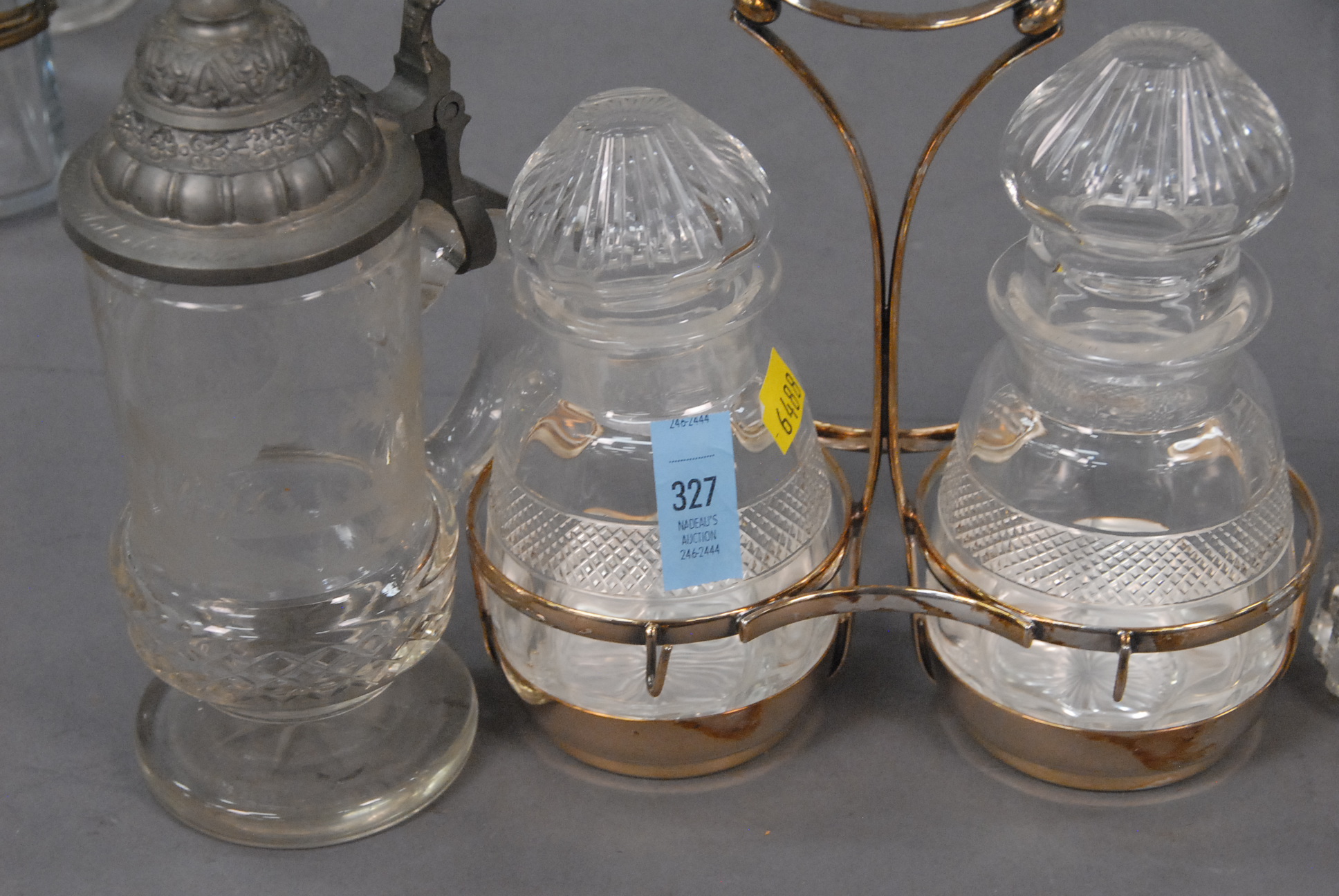 Lot 327: Four piece lot etched crystal stein, pair of covered jars, cut glass syrup with silver-plated stop etc
