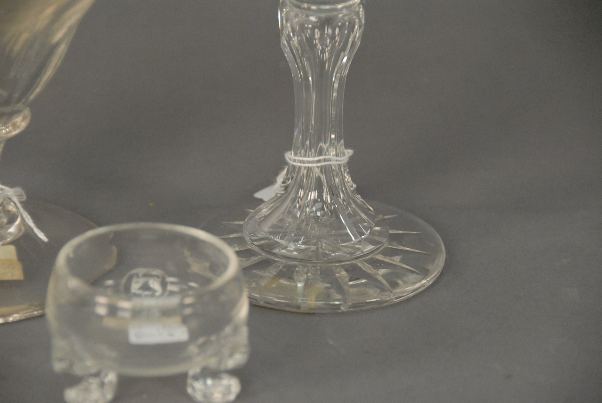 Lot 327: Four piece lot of clear glass to include one tall frosted to clear stem marked French circa 1740, one mug, one salt, and one compote. stem: ht. 9 in. mug: 5 in. Provenance: Property from a Private Collection Sold for the Benefit of the